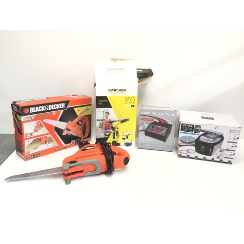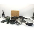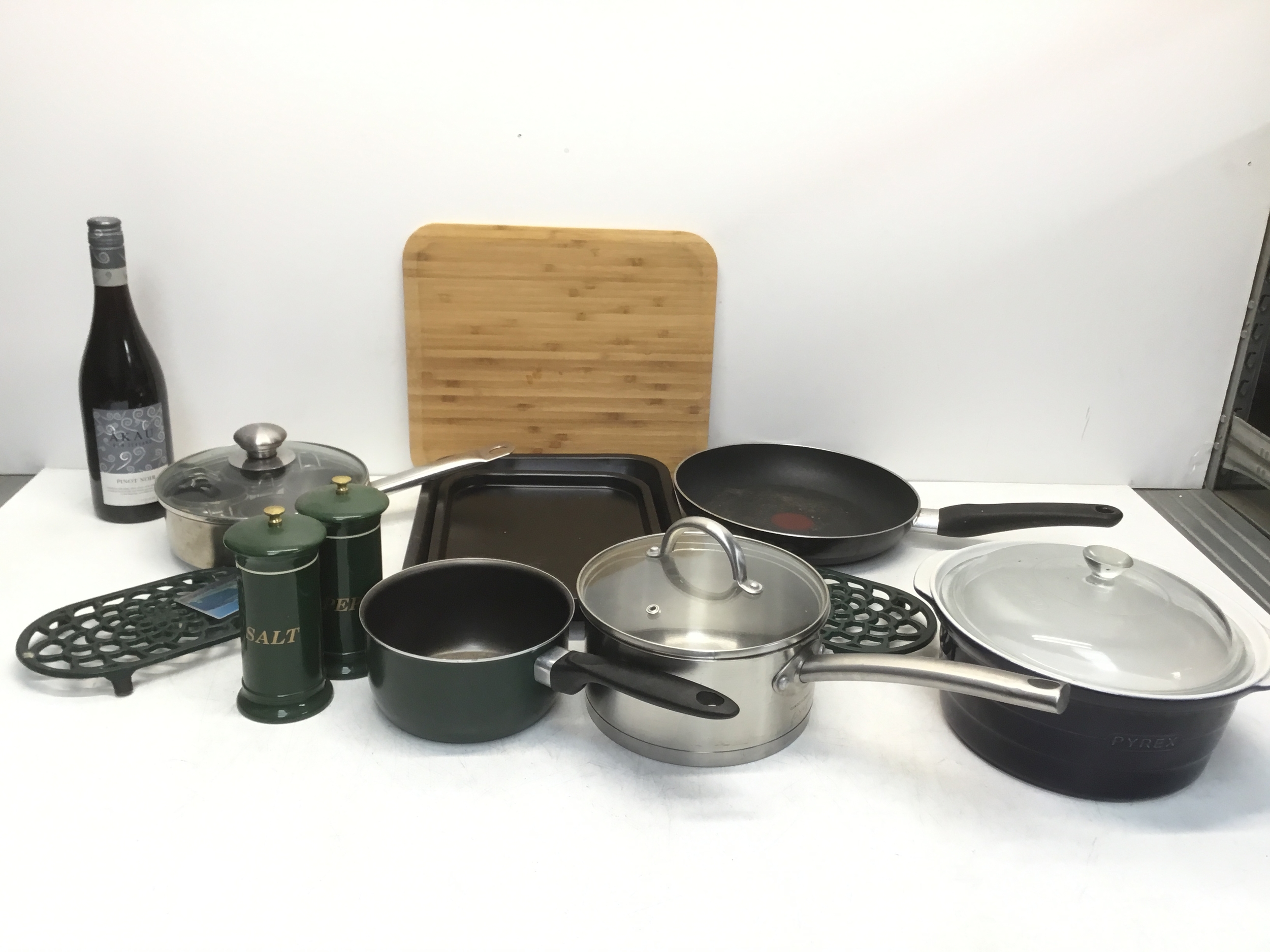 Kitchen items including saucepans, kettle stands and Tefal frying pan