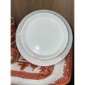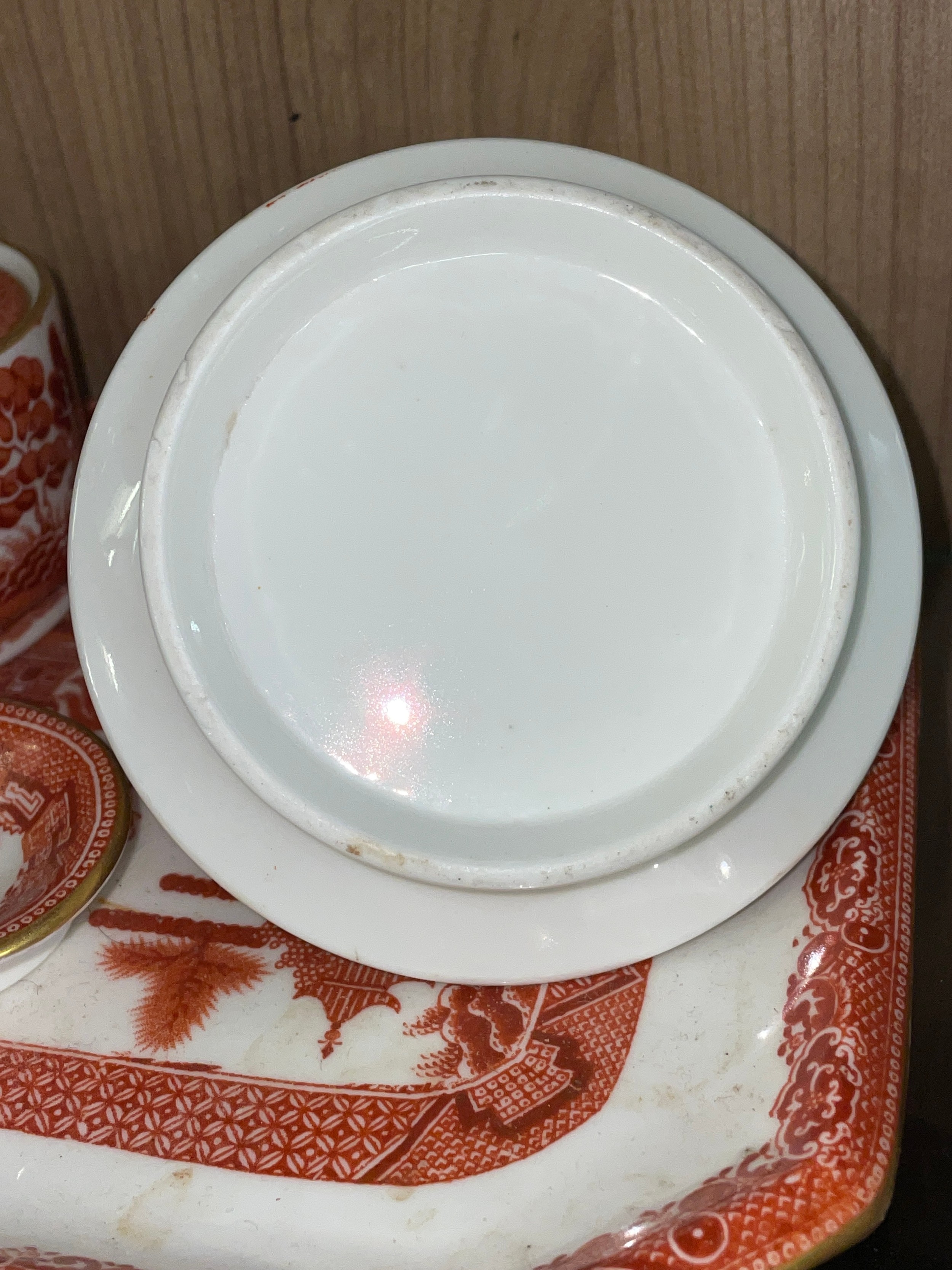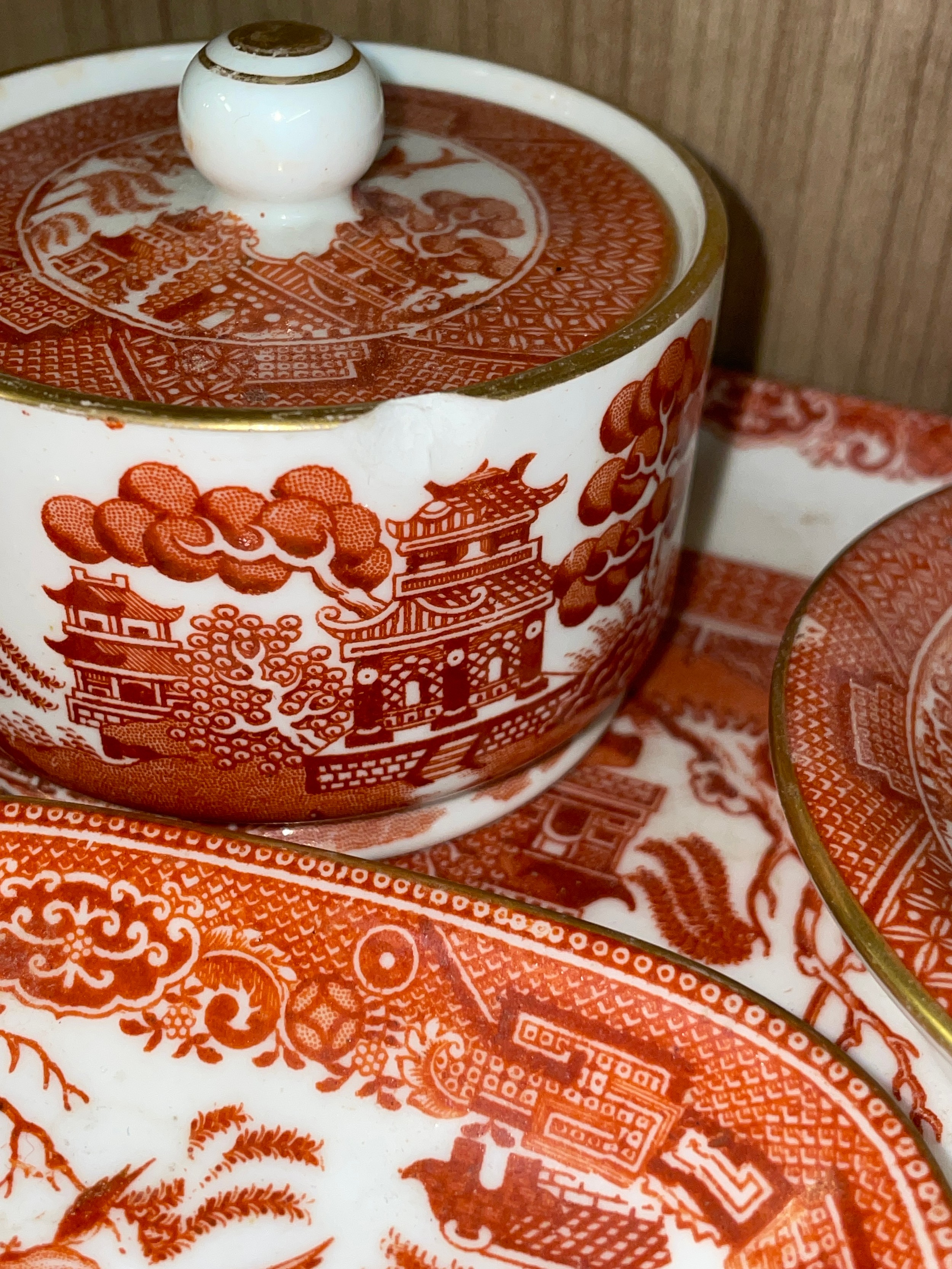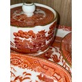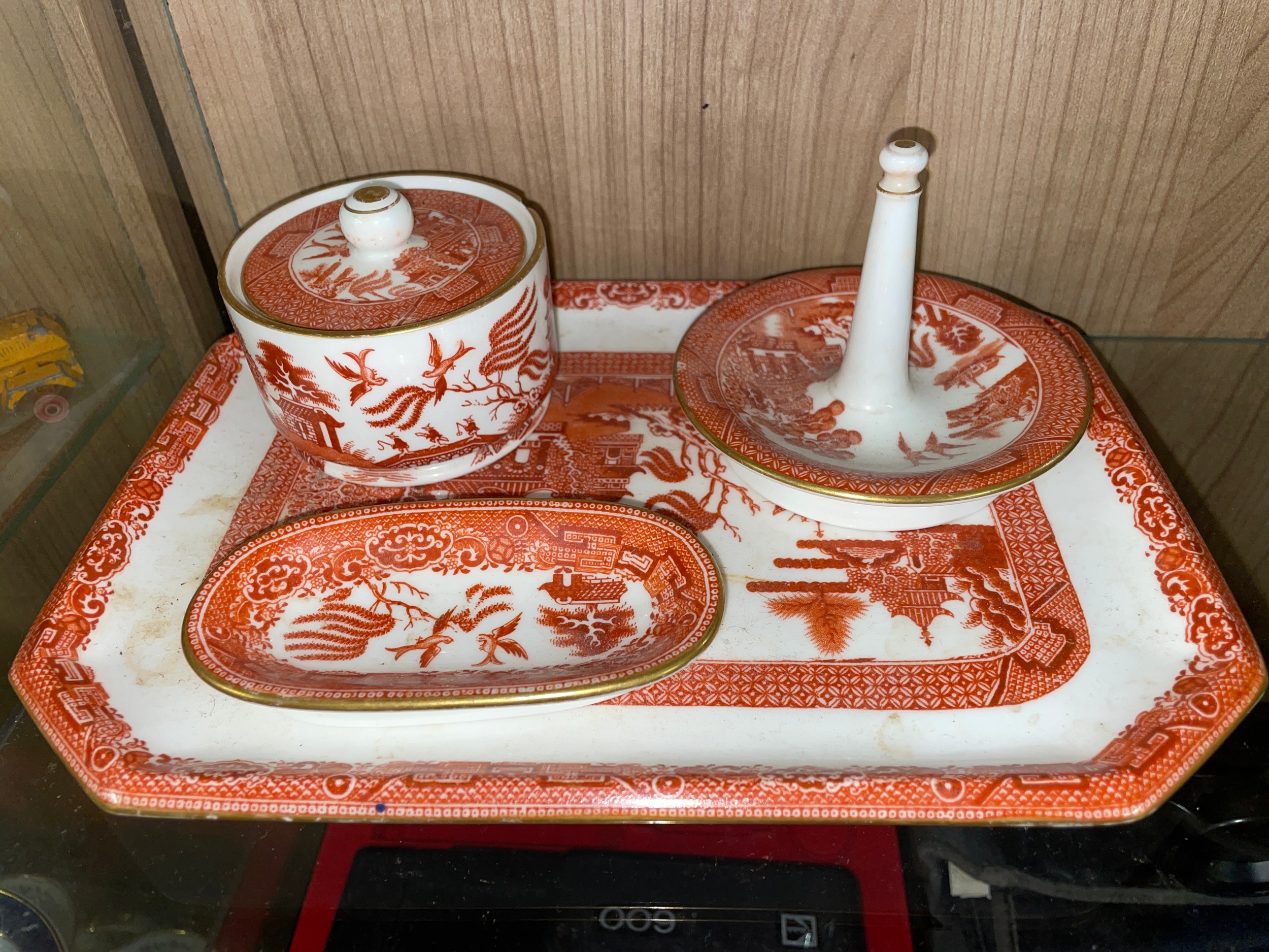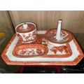 TERRACOTTA COLOURED WILLOW PATTERN DRESSING TABLE SET ON OCTAGONAL TRAY