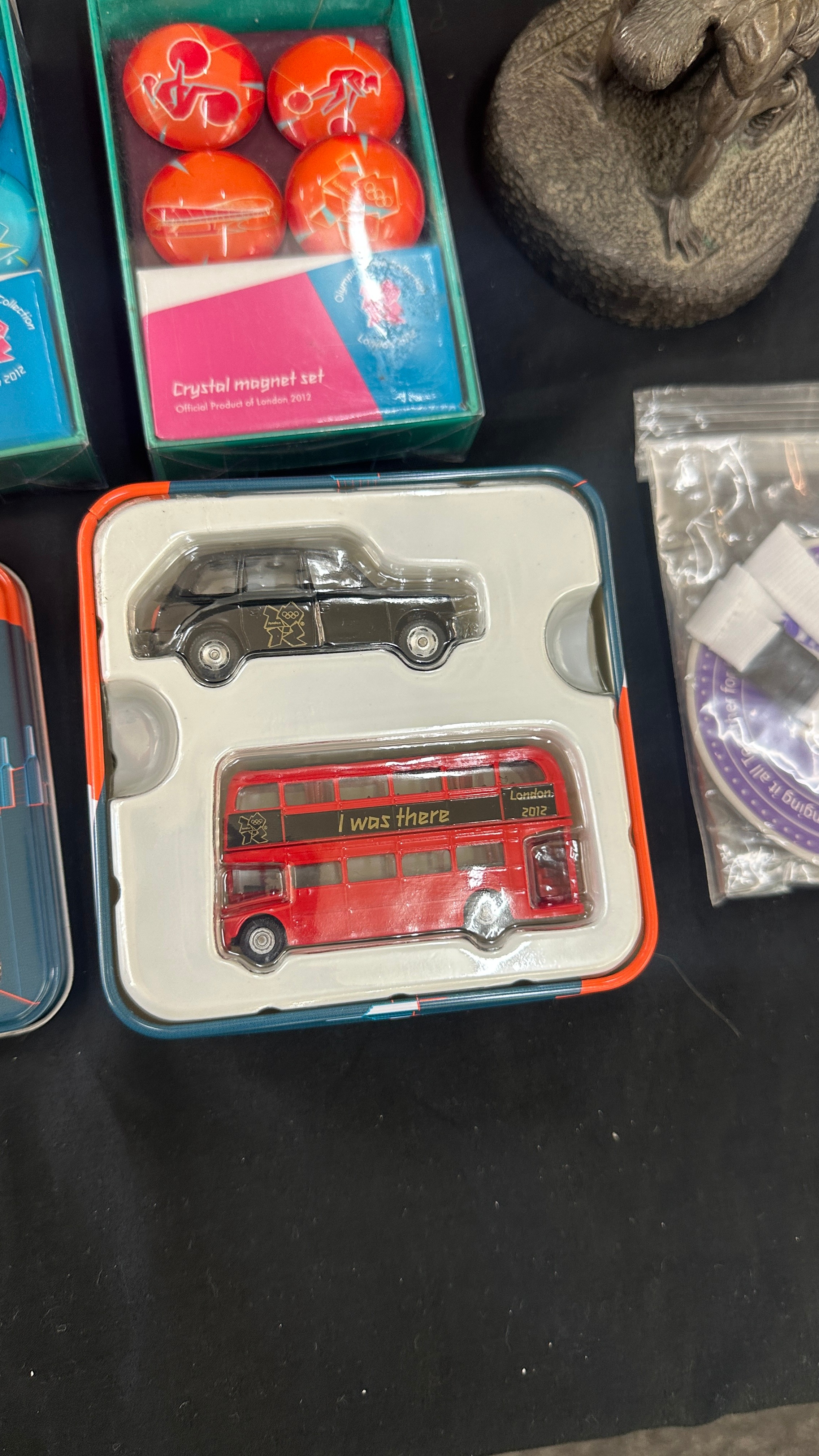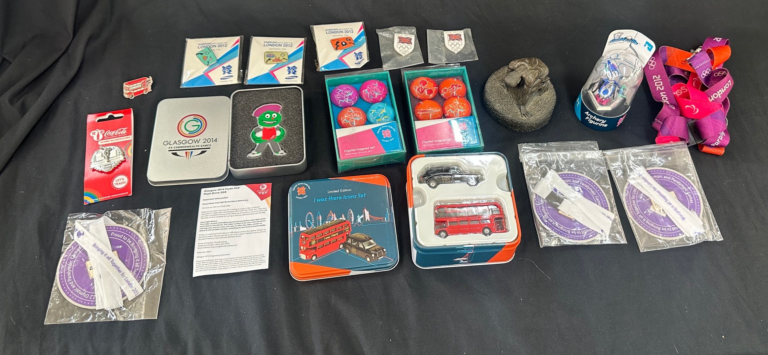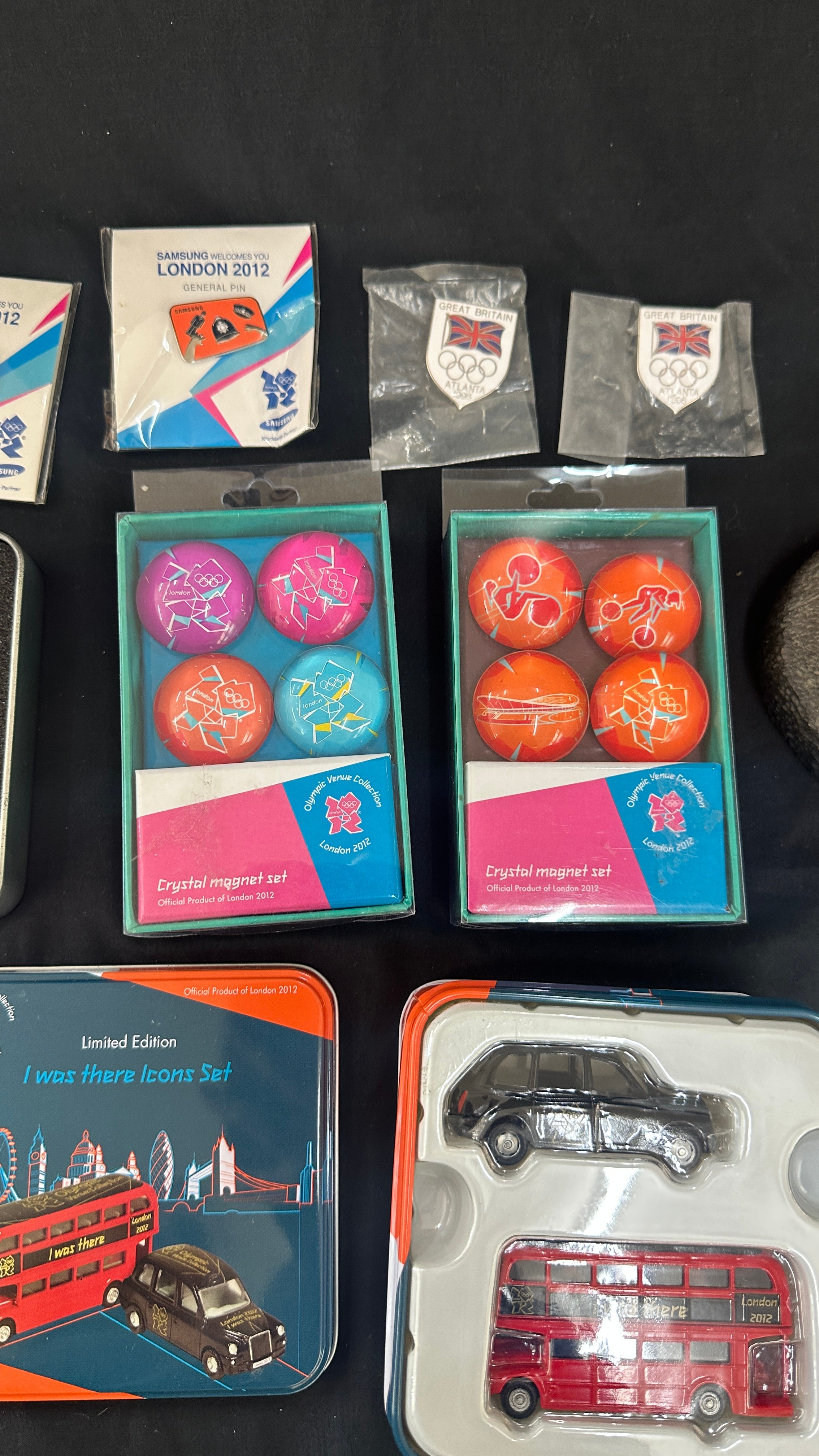 Selection of Olympic collectors items to include badges, magnets, die cast vehicle, etc