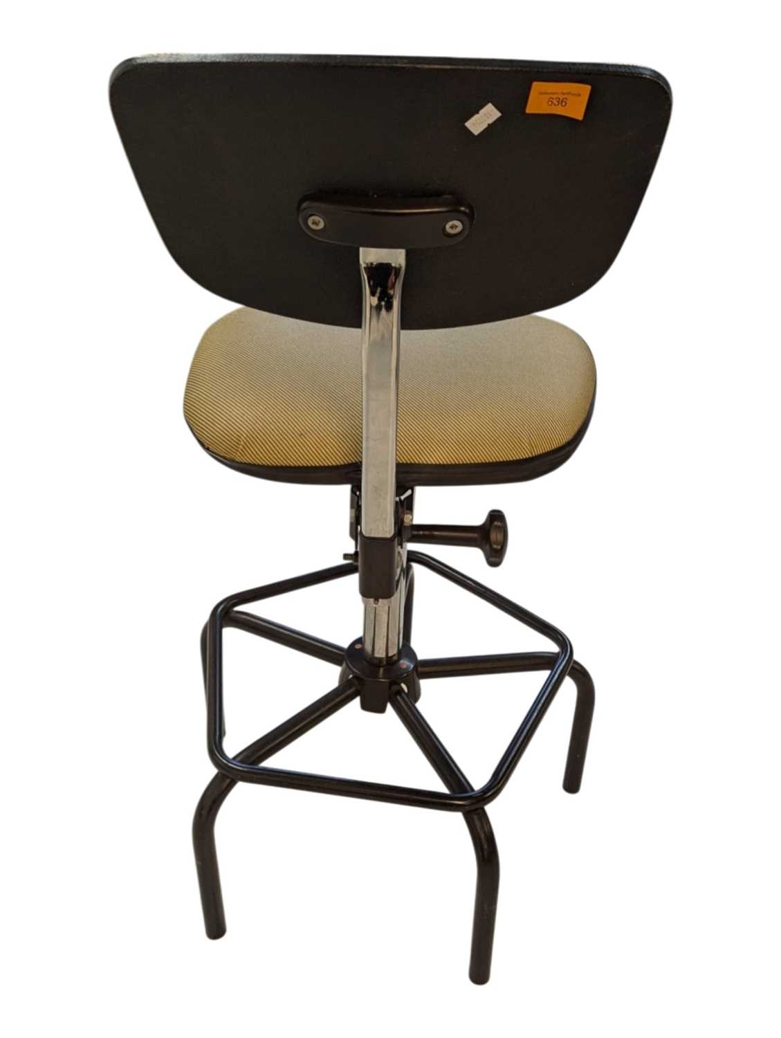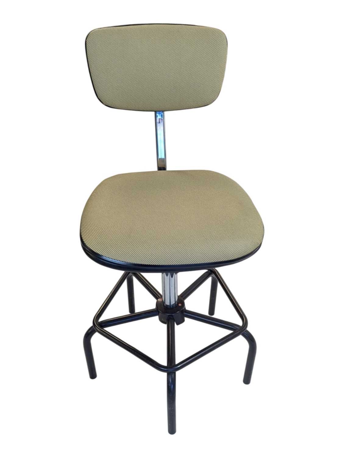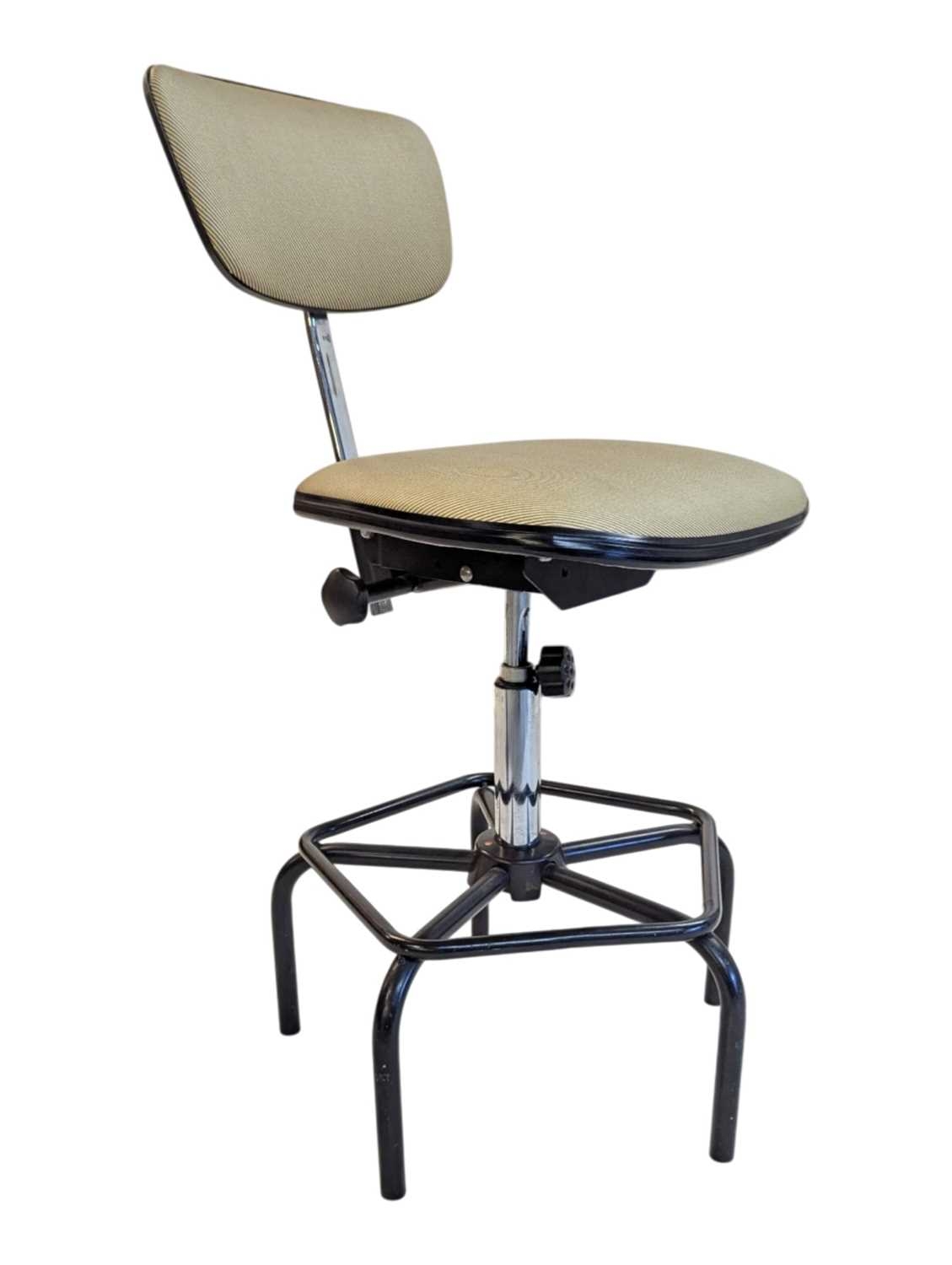A Dauphin industrial / machinist's swivel chair with moulded plastic seat and back rest with upholstered padded back rest and seat. Ebonised black metal footrest with five point base legs. Maker's mark underseat. Measures approx: 103x54x54cm