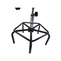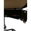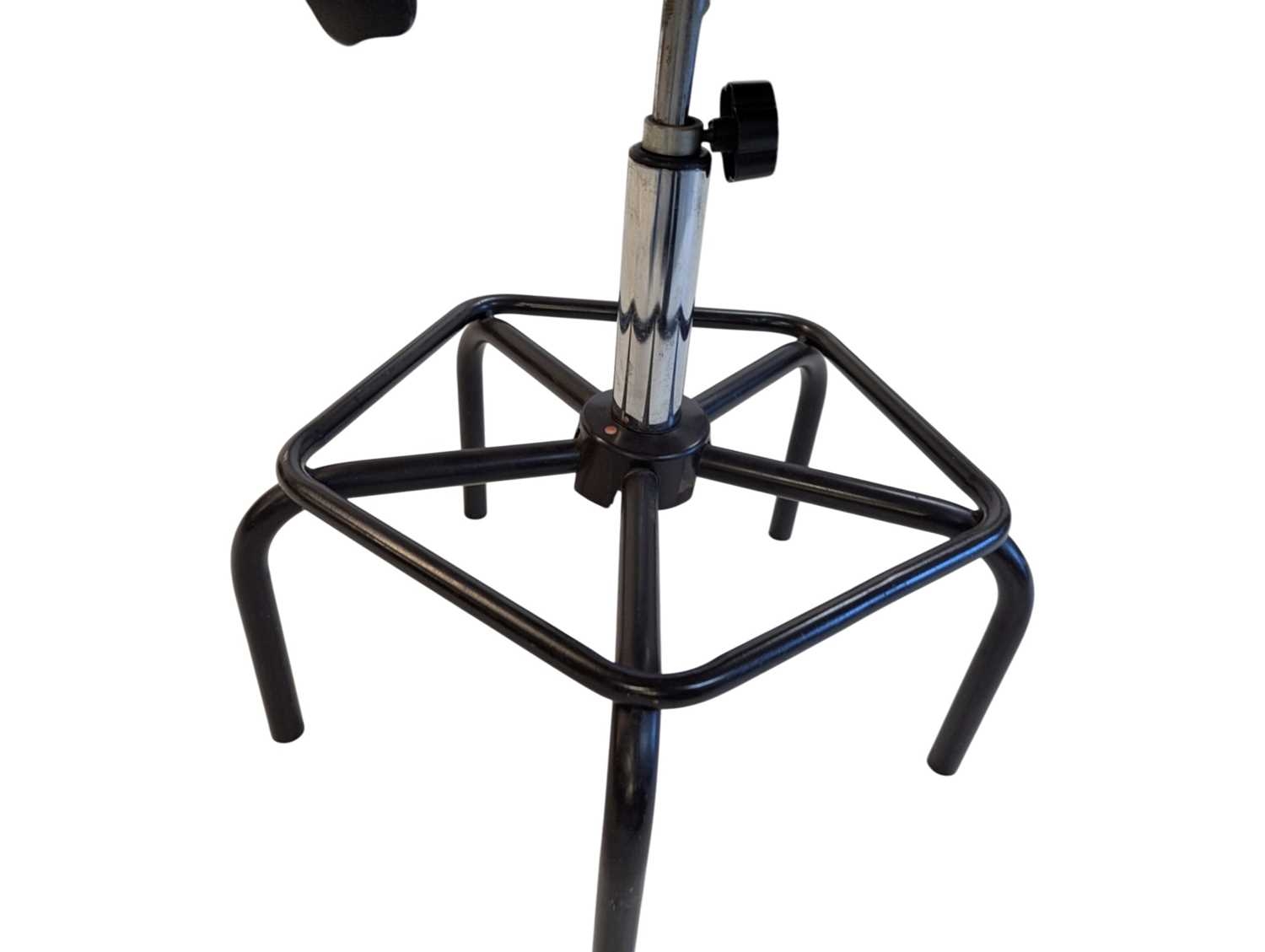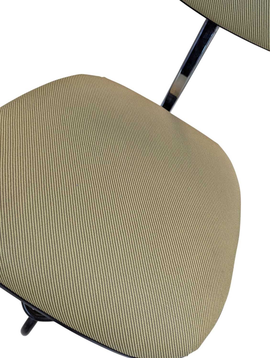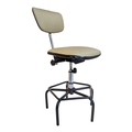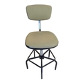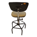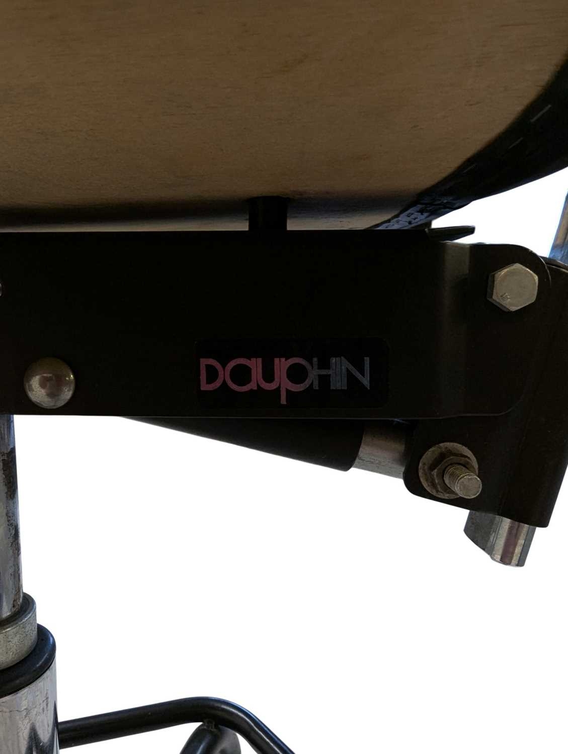 A Dauphin industrial / machinist's swivel chair with moulded plastic seat and back rest with upholstered padded back rest and seat. Ebonised black metal footrest with five point base legs. Maker's mark underseat. Measures approx: 103x54x54cm
