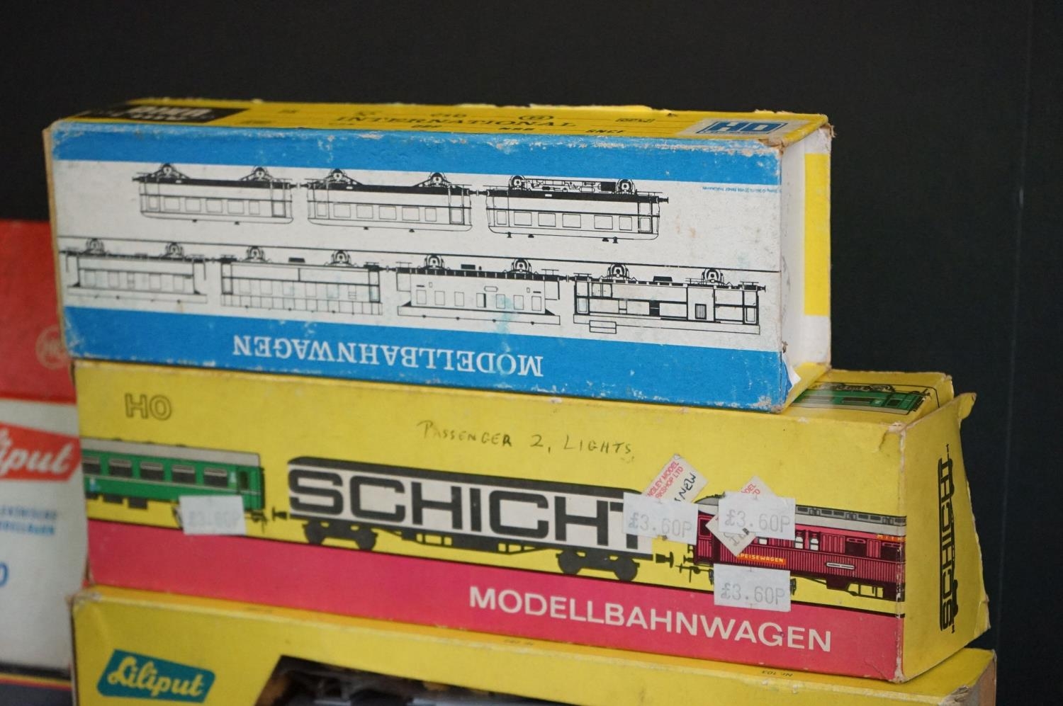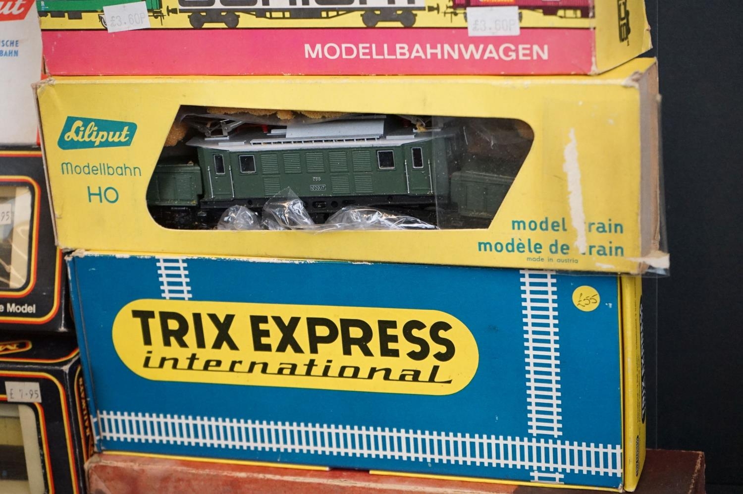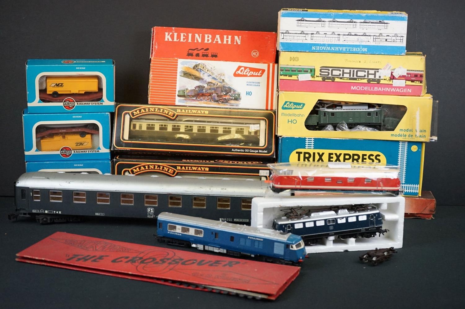 Quantity of OO / HO gauge model railway to include boxed Trix Express International 2447, 3 x boxed Liliput locomotives (1 x a/f), 7 x boxed items of rolling stock, Triang Pullman locomotive etc plus an O gauge Lima coach