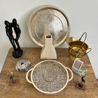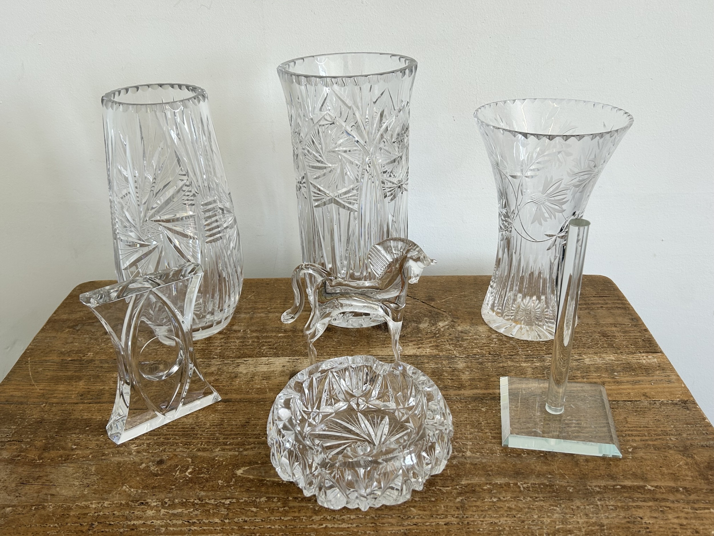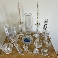 A box of mixed vintage glassware including large vases
