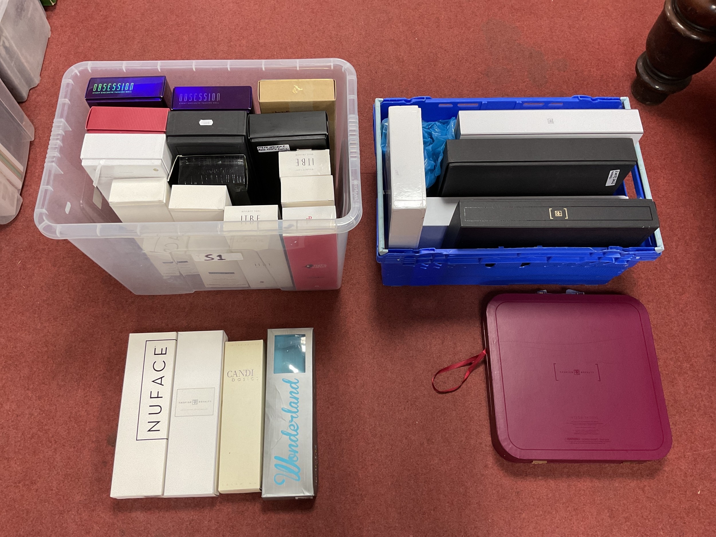 A Quantity Of Empty Integrity Toys Boxes. To Include Poppy Parker, Jason Wu Candi Basics, Wonderland Industry Style Lab, Fashion Royalty, Fabulous 40s Felines, Nu Face, Obsession, etc. Red Fashion Royalty Case Also Noted. COA's and Parts Of Stands Noted In A Few Boxes. (Two Boxes).