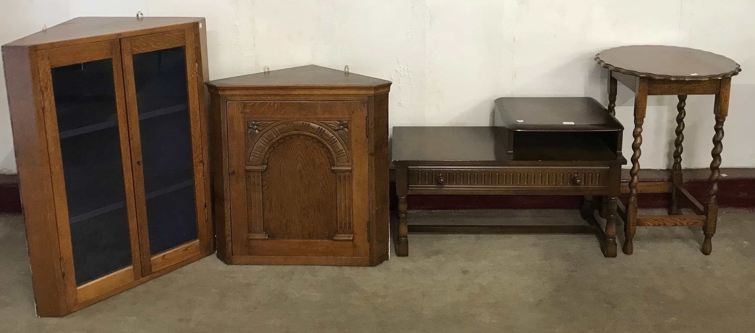 An oak freestanding corner cupboard, a barleytwist occasional table and a telephone seat