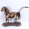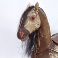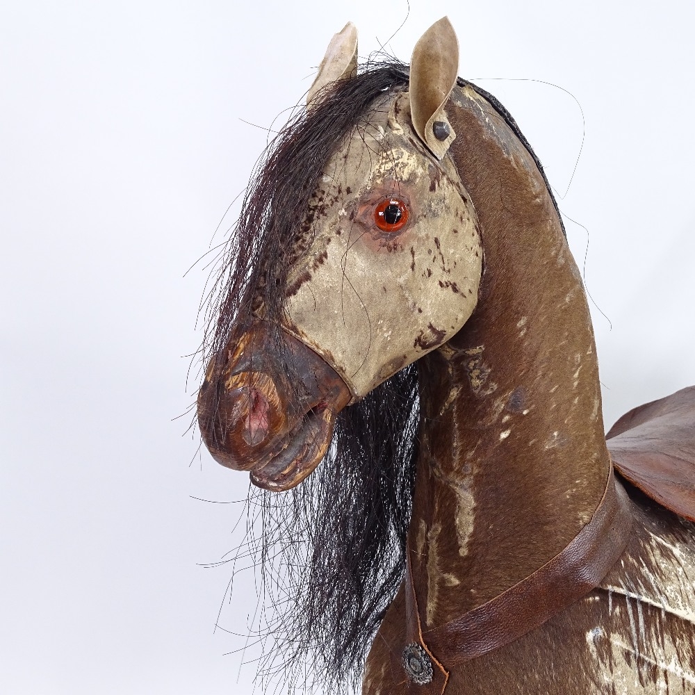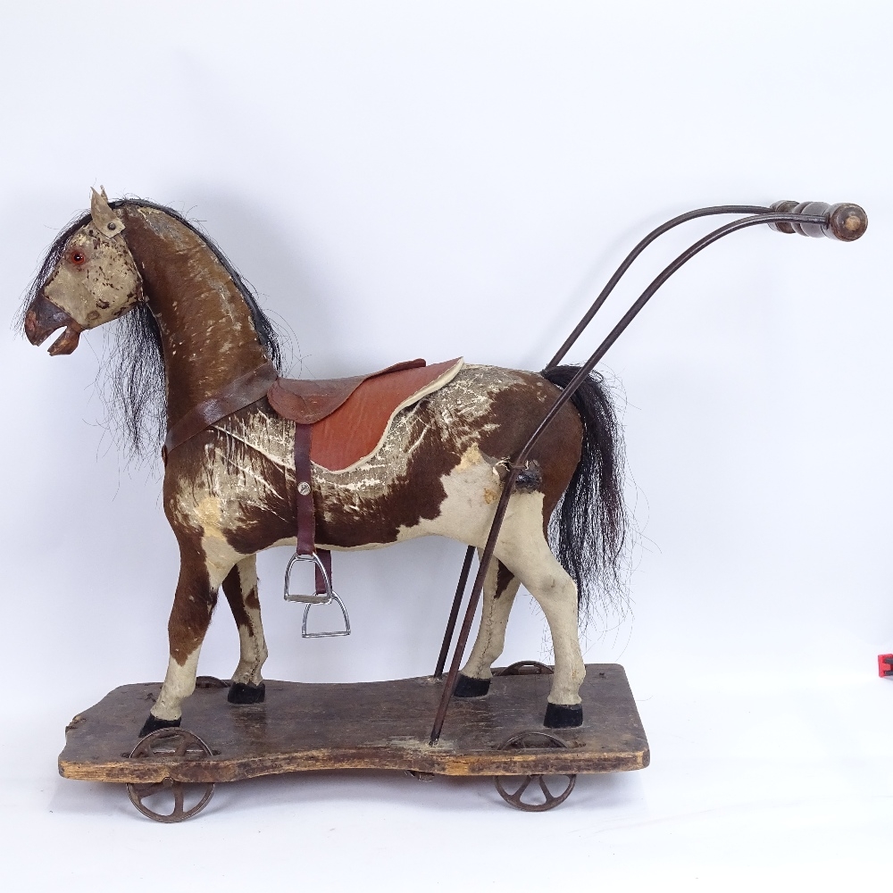 An antique German child's push-along horse toy, pony-skin covered with horse hair mane and tail, on pine plank base, base length 62cm