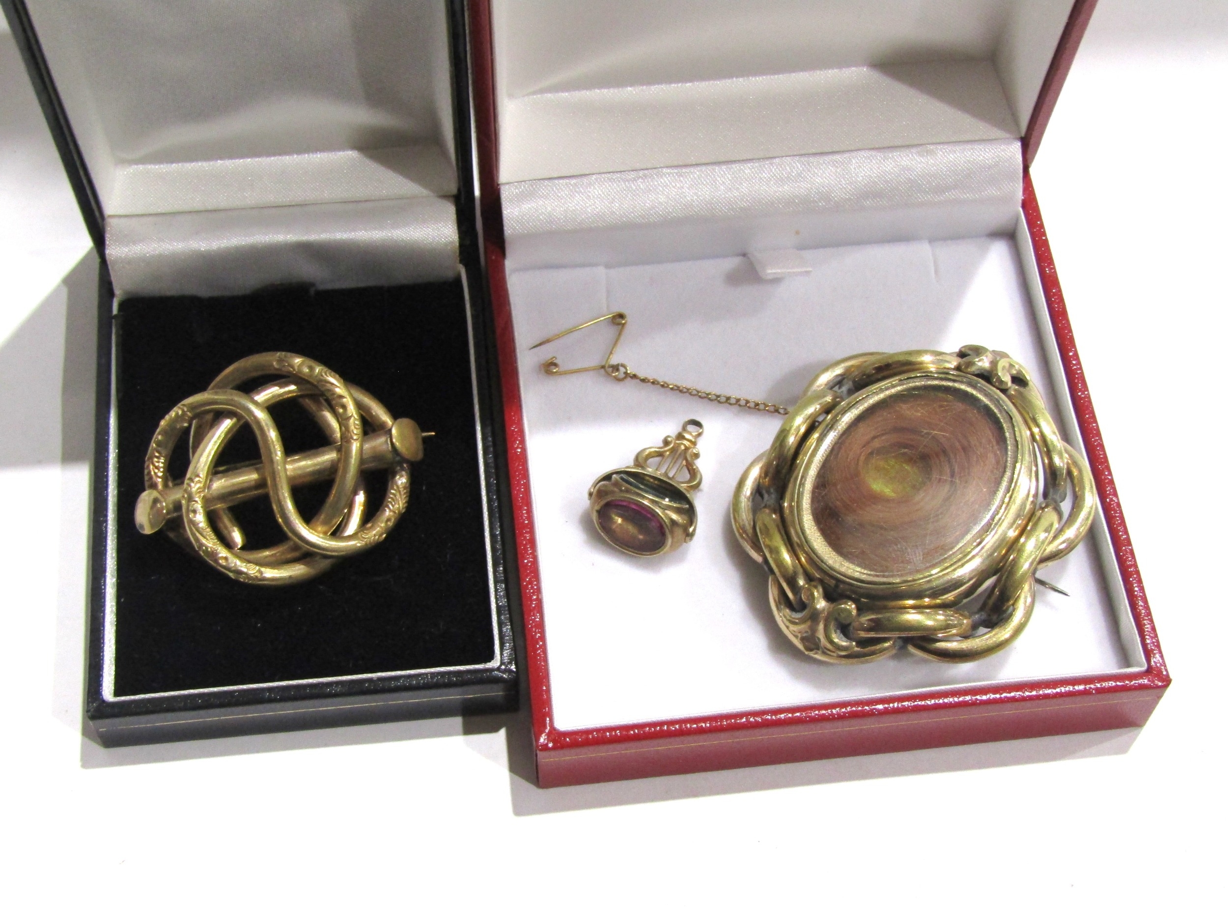Two Victorian brooches including memorial example, and a three sided fob (3)
