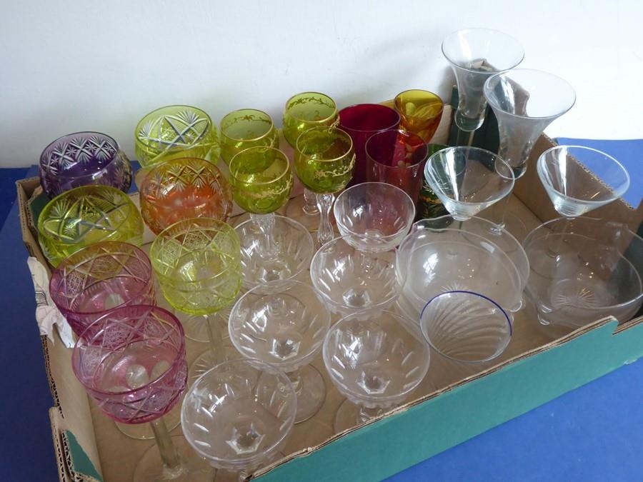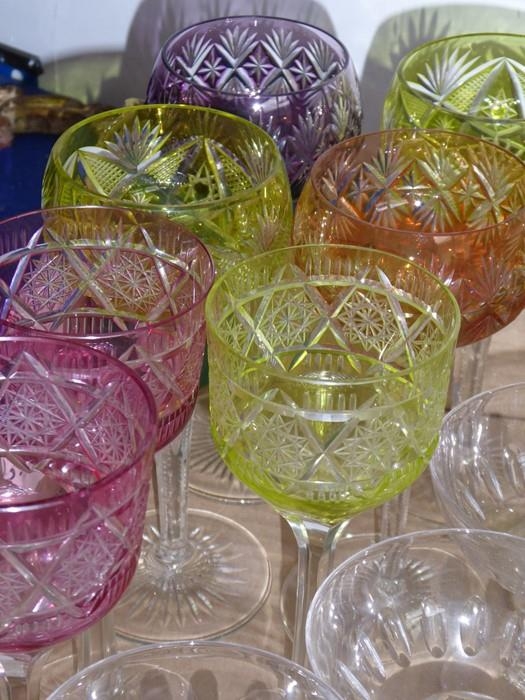 A good selection of glassware to include a set of four flash-cut hock glasses together with three other similar flash-cut glasses, a set of six hand-cut champagnes and a further selection of various drinking glasses etc. together with glass rinsers (selection)