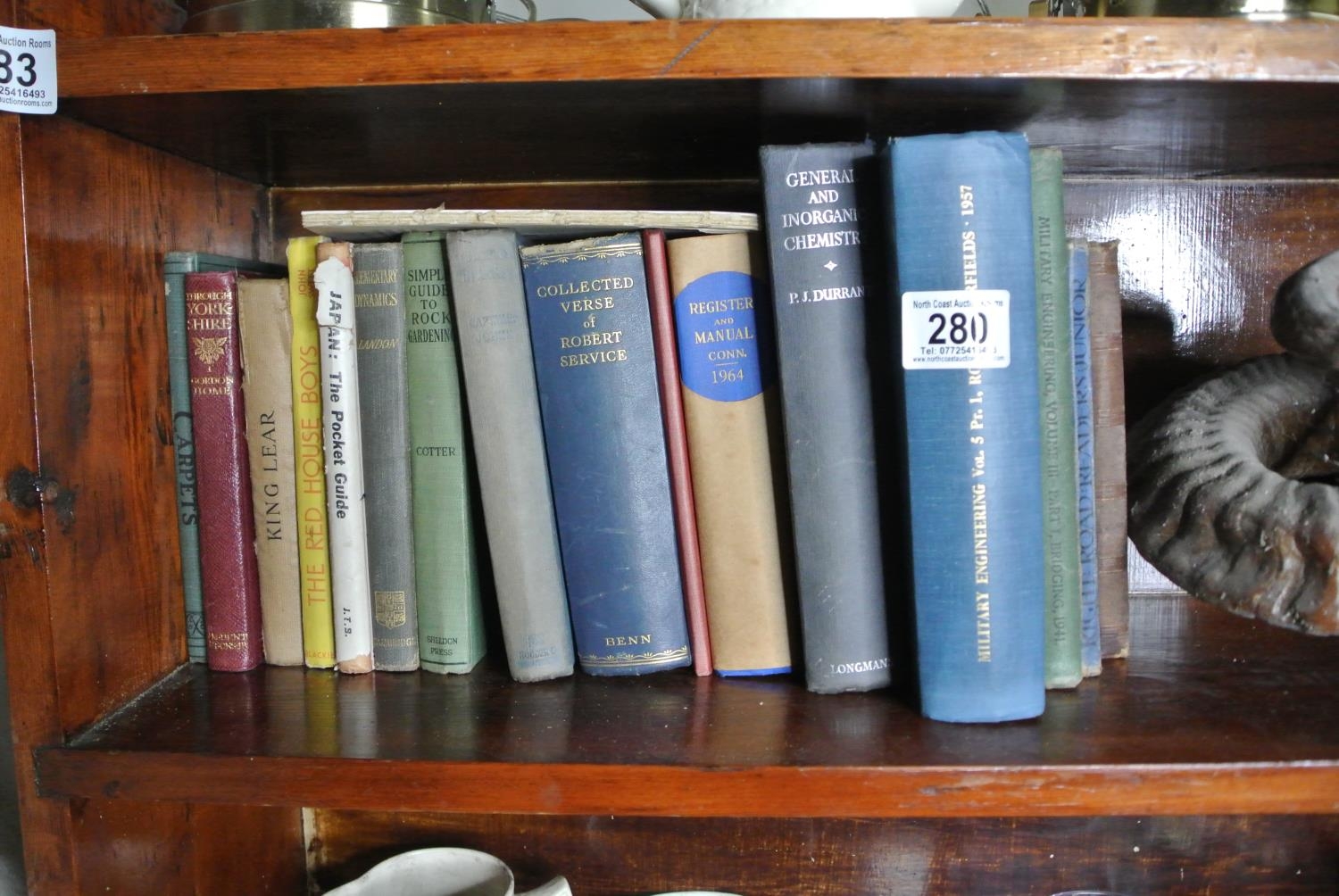 An assortment of vintage/ antique books to include a 1917 copy of Shakespeare's King Lear, a 1957 copy of Military Engineering, a 1869 copy of Wettenhall's Greek Grammar, and more.