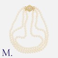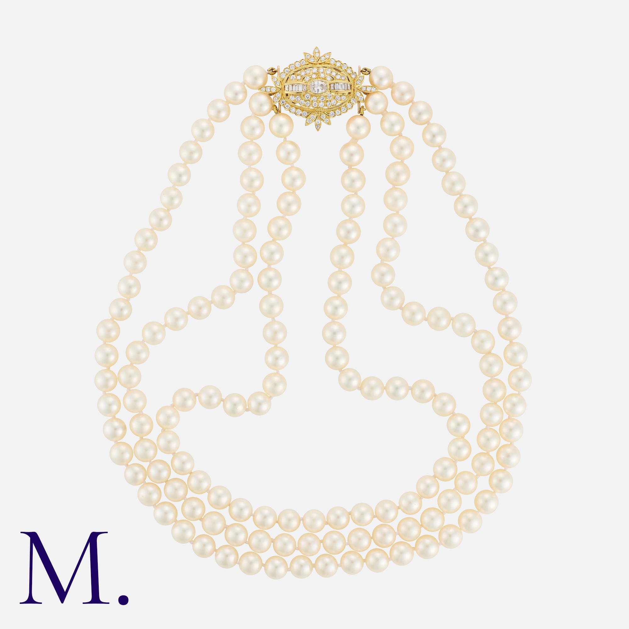 A Three Row Pearl Necklace in 18k yellow gold. Comprising three strands of pearls measuring from 6.5-7mm, terminating in a detachable diamond set clasp, with additional brooch fitting. Diamonds totalling approximately 1.50ct. Hallmarked for 18 carat gold.