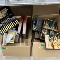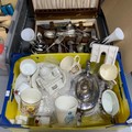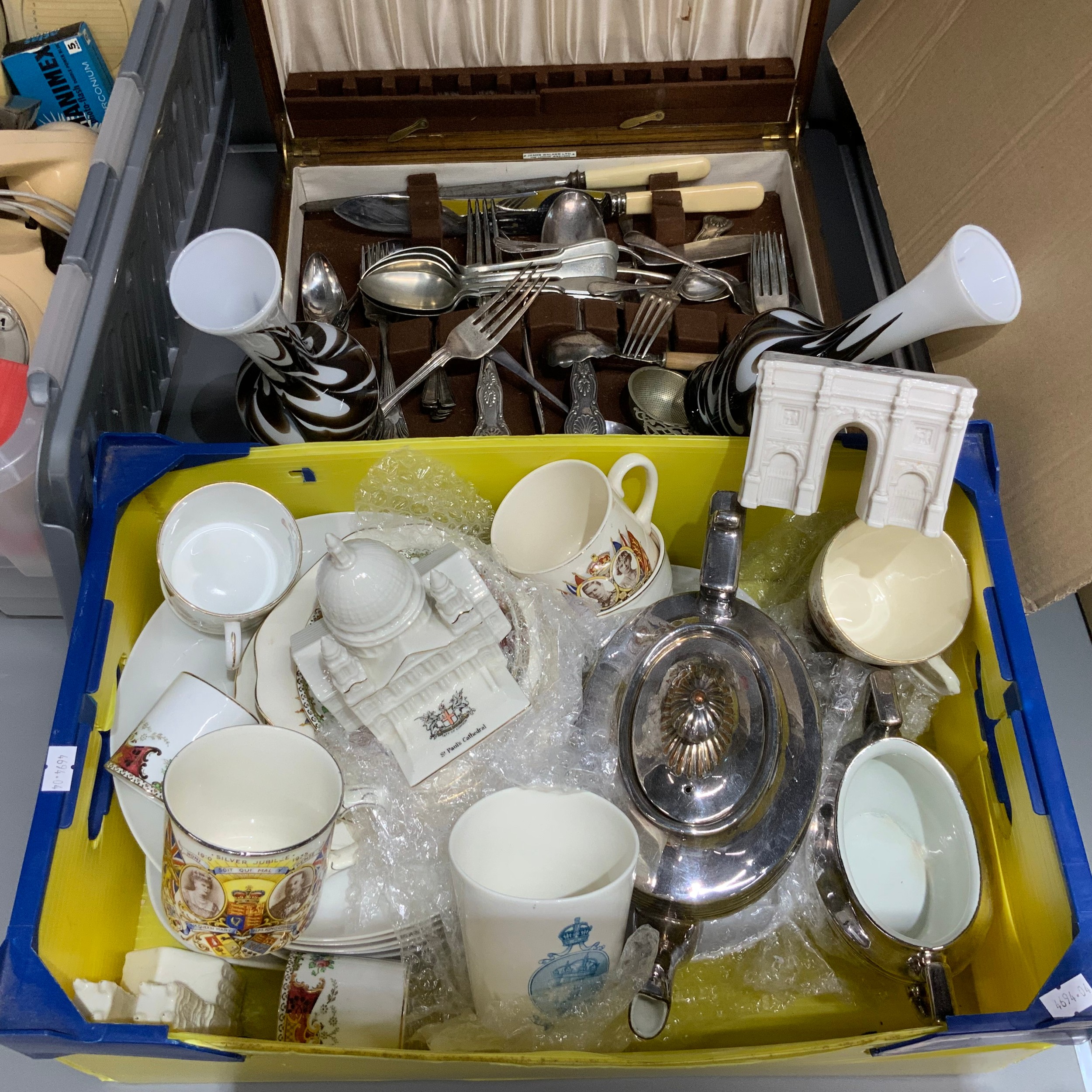 A part silver-plated canteen and tea pot, along with crested and coronation wares.