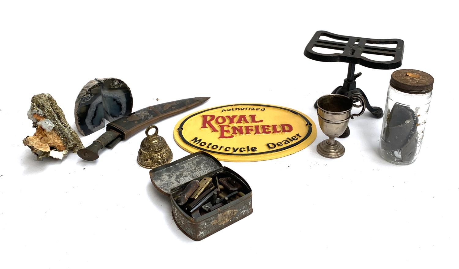 A mixed lot to include loaded sterling silver goblet; Royal Enfield reproduction plaque; trivet; kukri; geode crystal bookends, iron pyrite etc