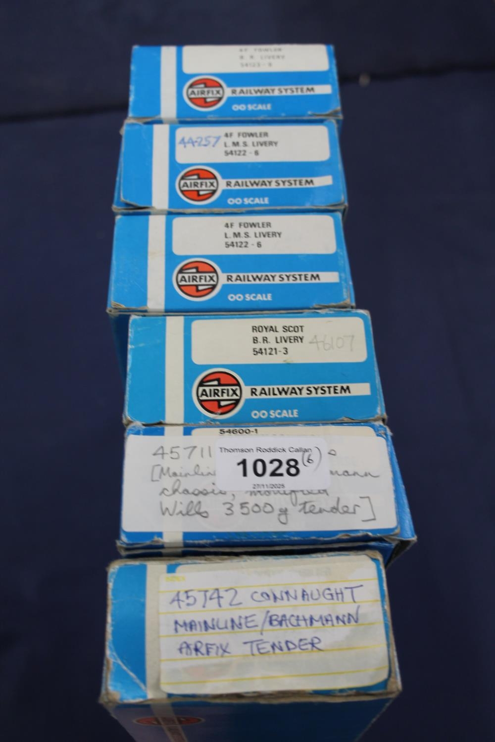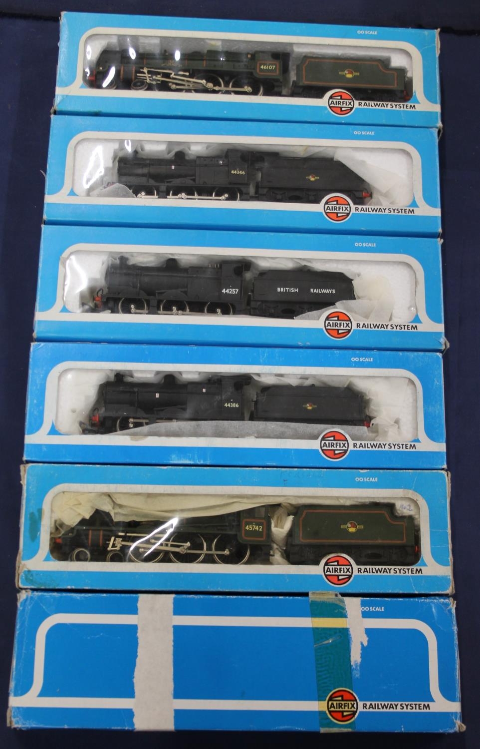 Airfix Railway System OO gauge model railway locomotives to include 4-6-0 Argyll and Sutherland Highlander tender locomotive 46107 BR green, 0-6-0 tender locomotive 44346 BR black, 0-6-0 tender locomotive 44257 BR black, 0-6-0 tender locomotive 44386 BR black, 4-6-0 Connaught tender locomotive (Bachmann) 45742 BR green and 4-6-0 Courageous tender locomotive (Bachmann) 45711 BR green, each in Airfix box. (6)