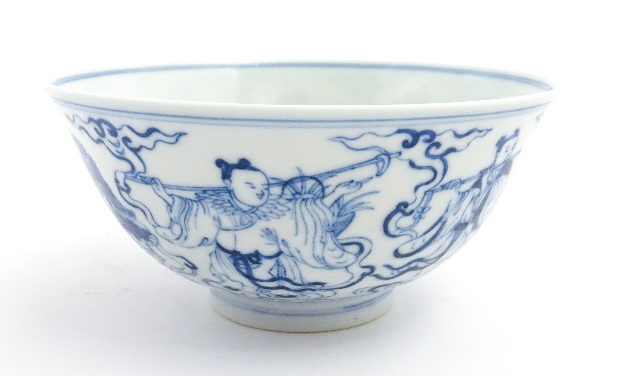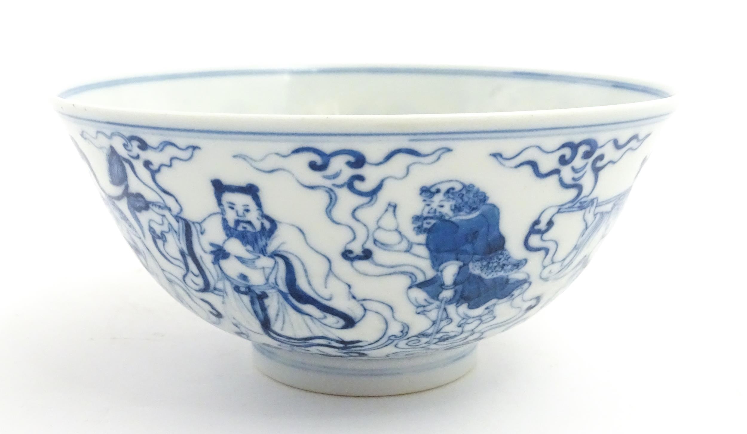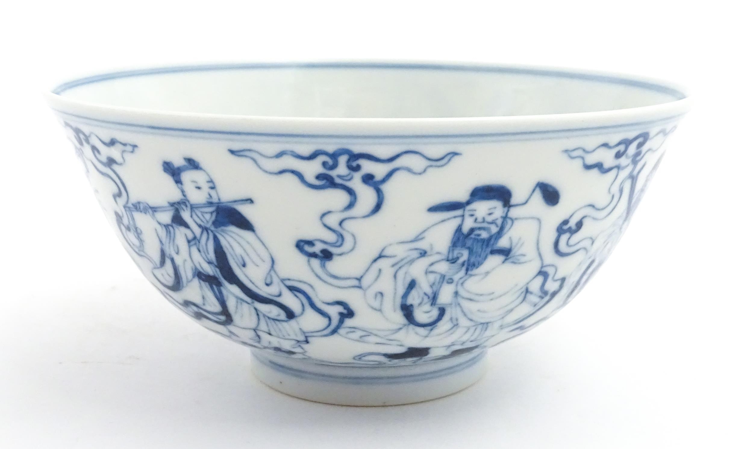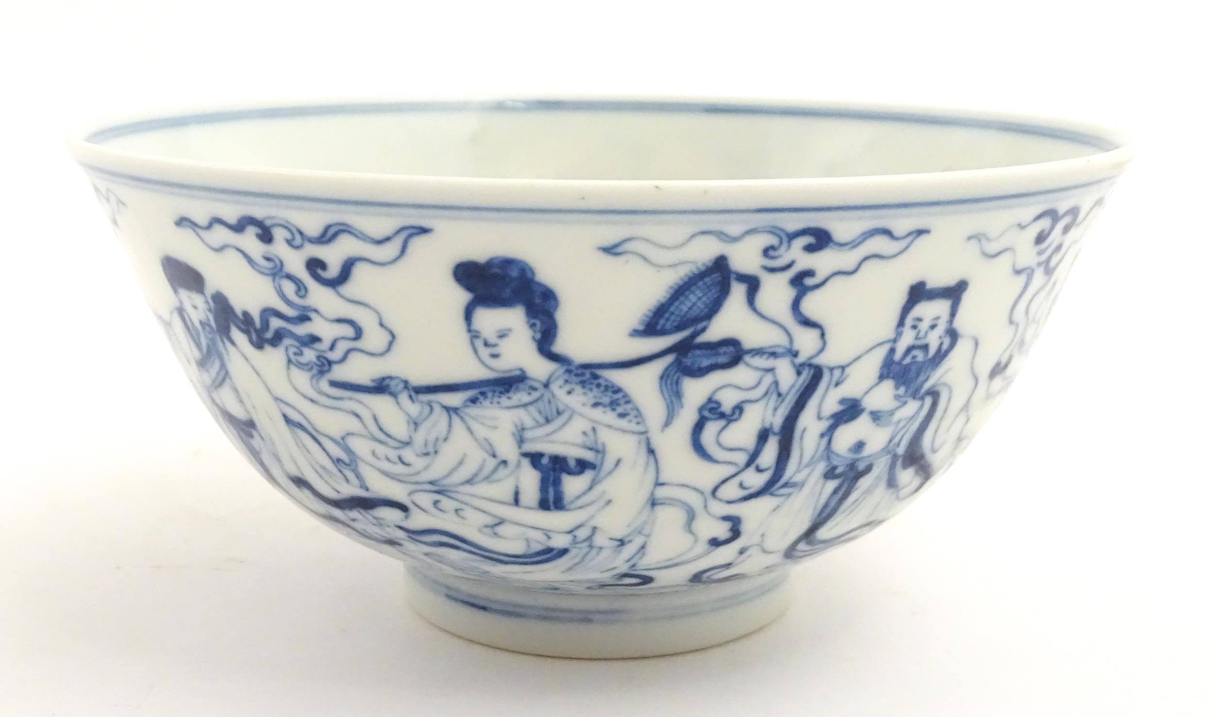 A Chinese blue and white bowl decorated with the Eight Immortals. Character marks under. Approx. 3" high x 6 1/4" wide