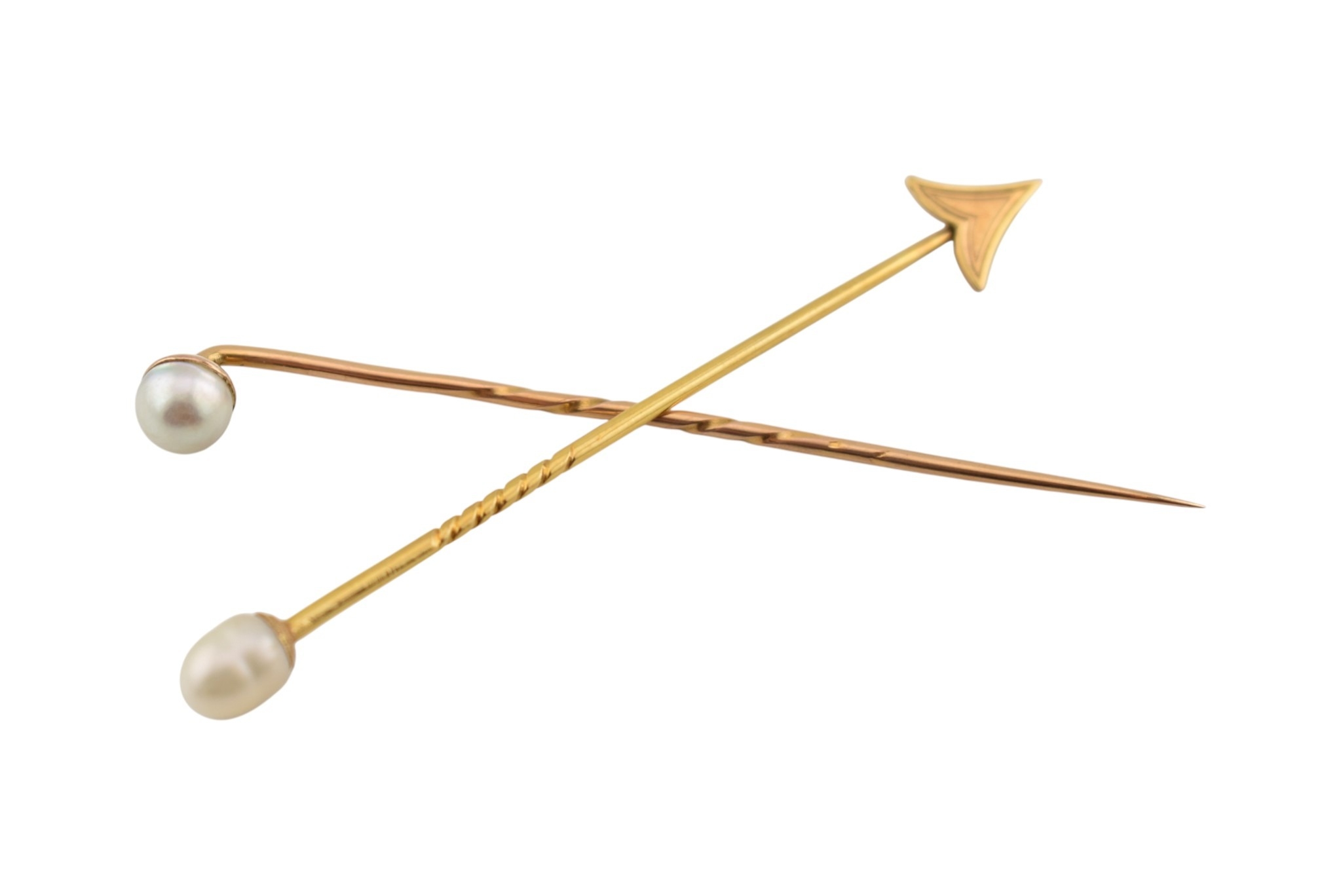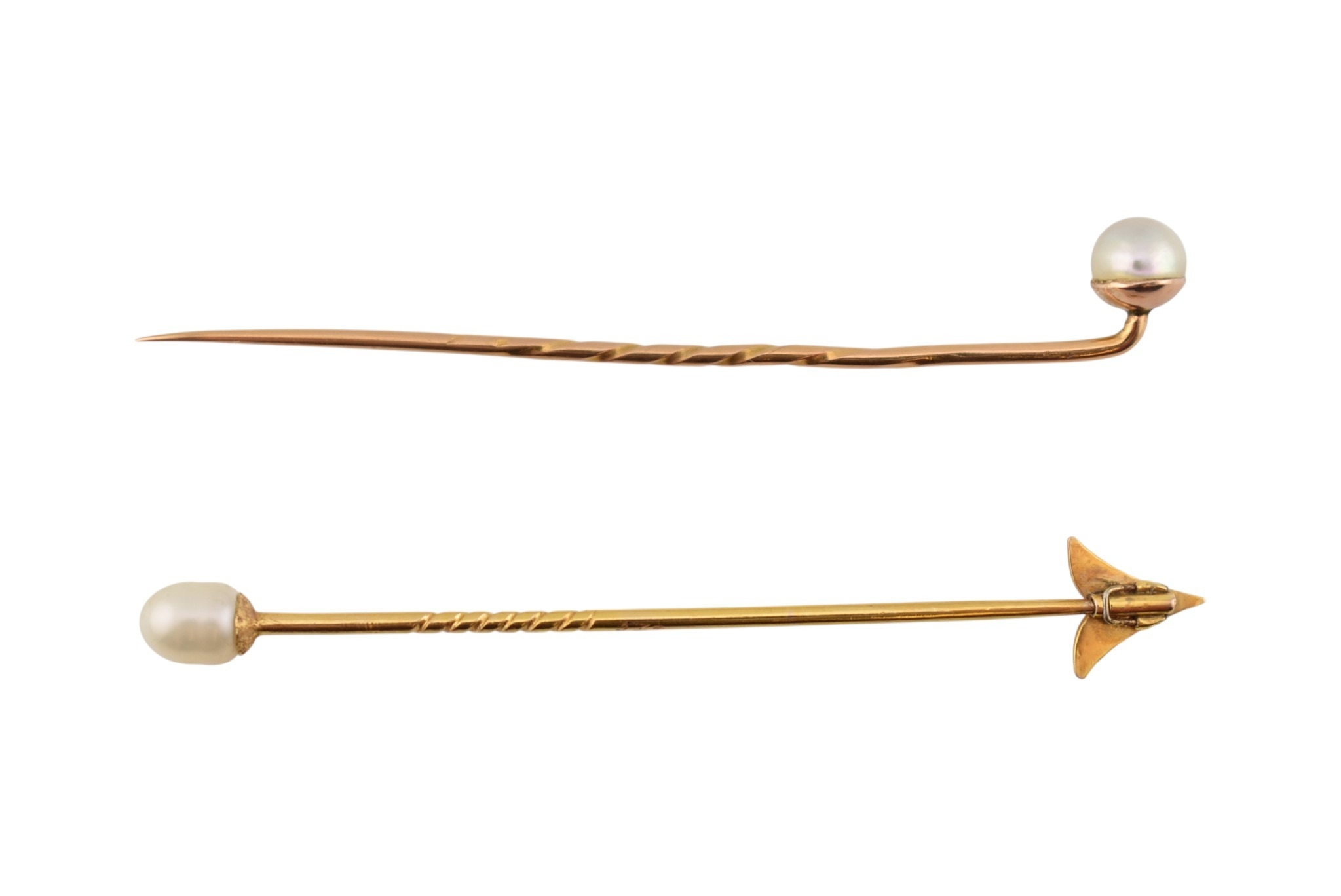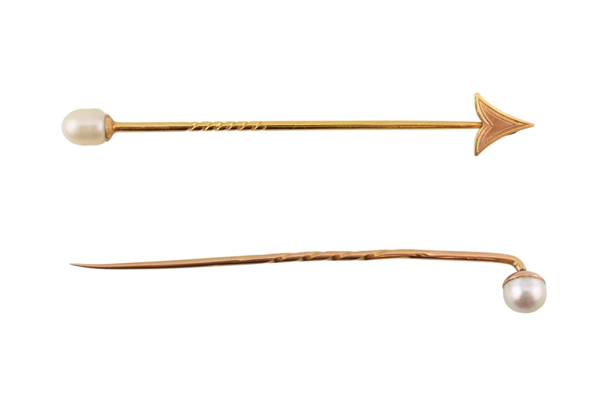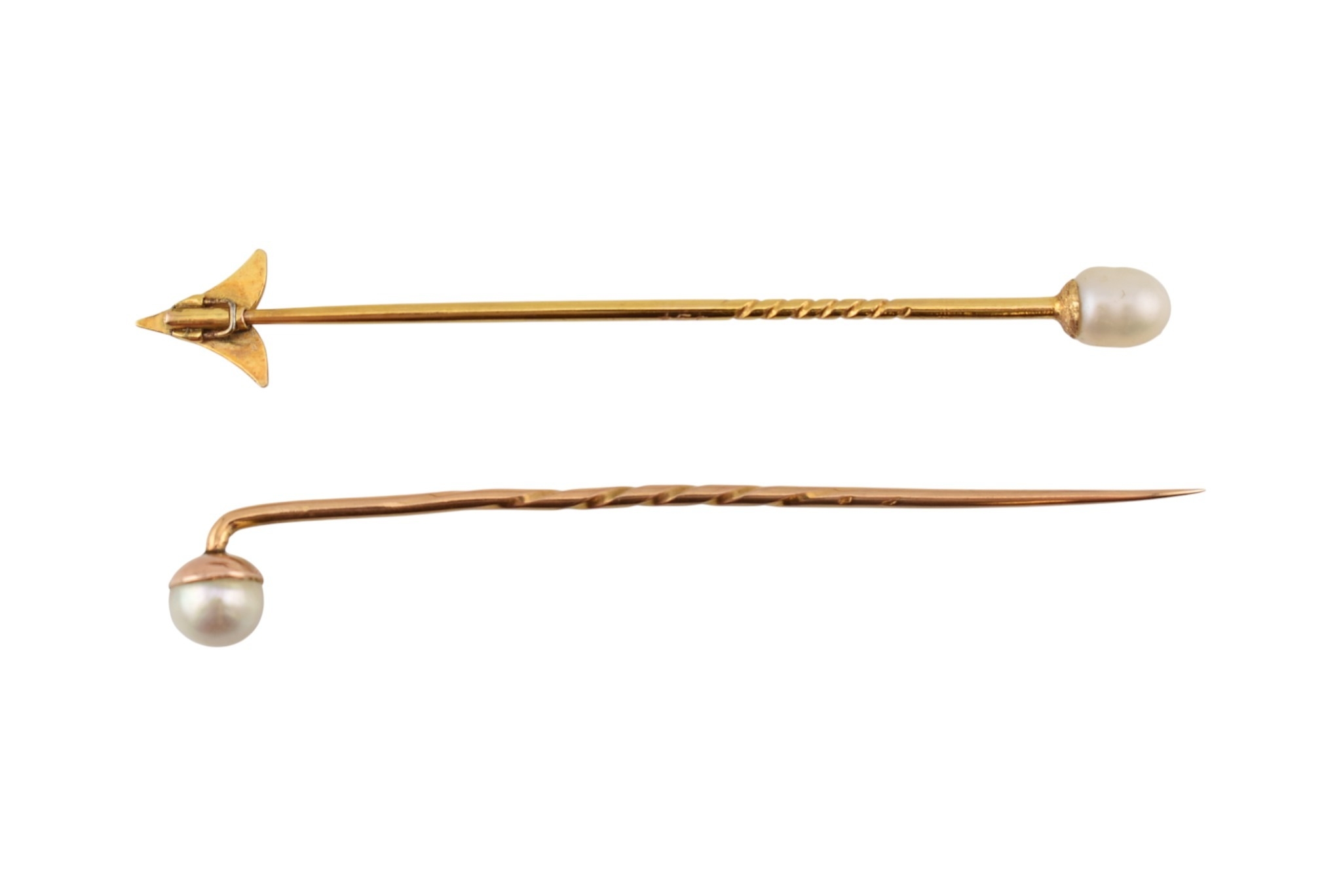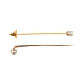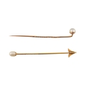 Two cased gold & pearl lapel stick pins. One with plain tapering pin, the other a jabot pin in the form of an arrowhead. Weight 3.5g. Measures 7cm approx