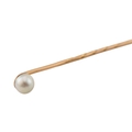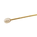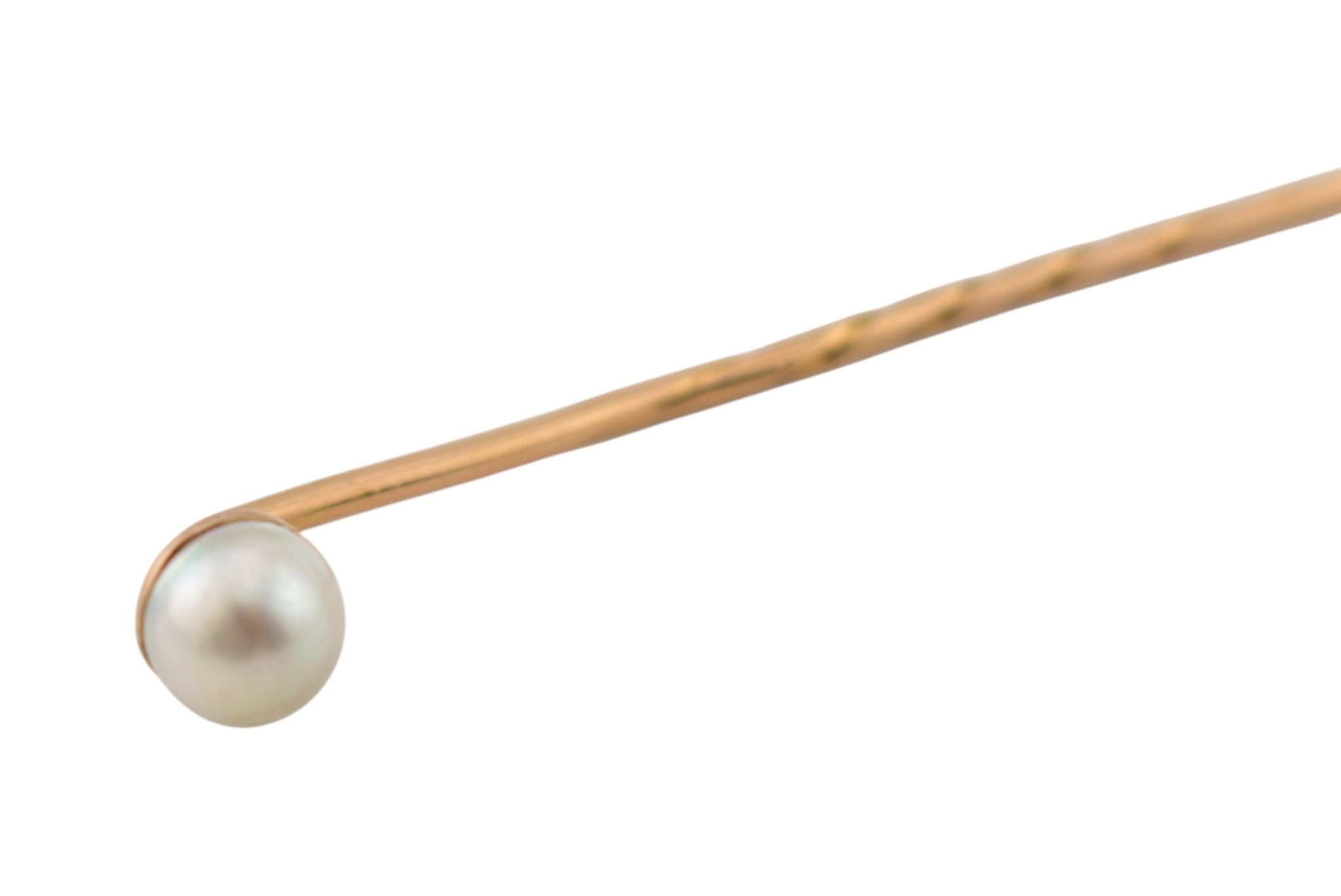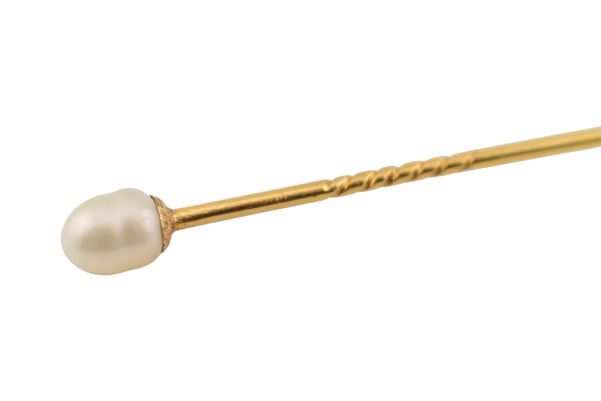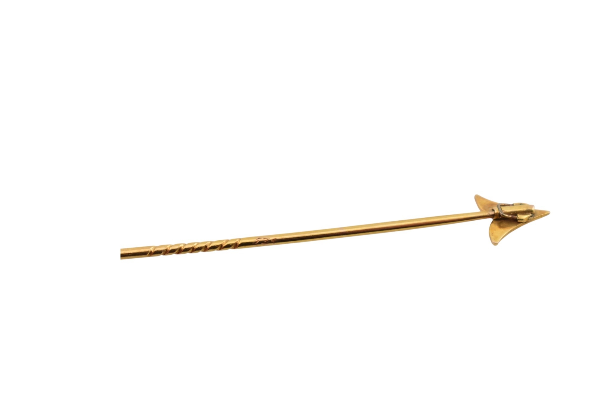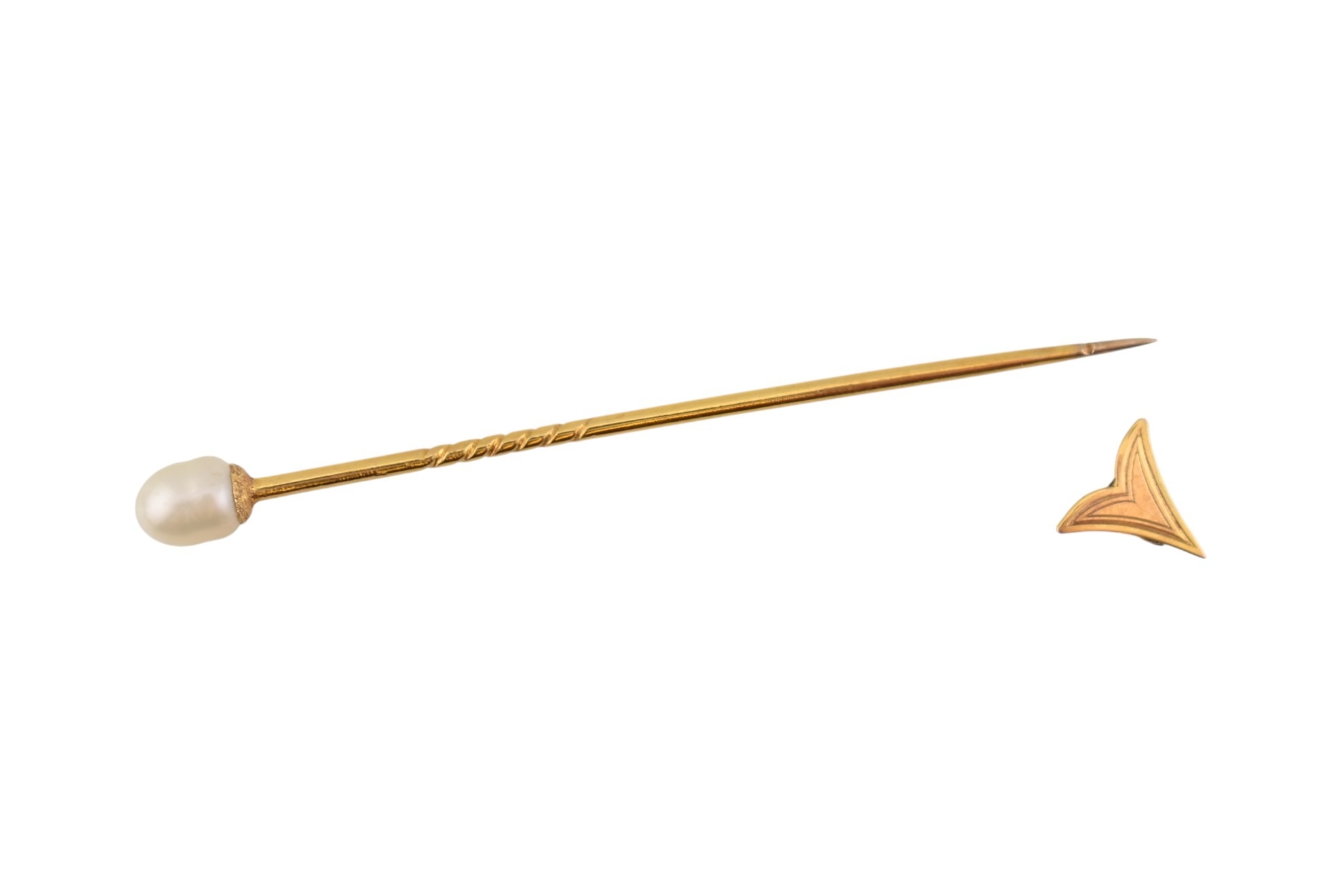Two cased gold & pearl lapel stick pins. One with plain tapering pin, the other a jabot pin in the form of an arrowhead. Weight 3.5g. Measures 7cm approx