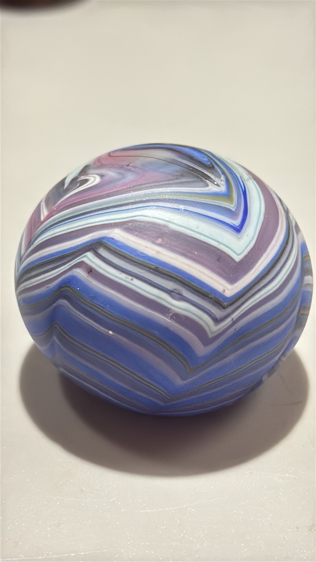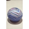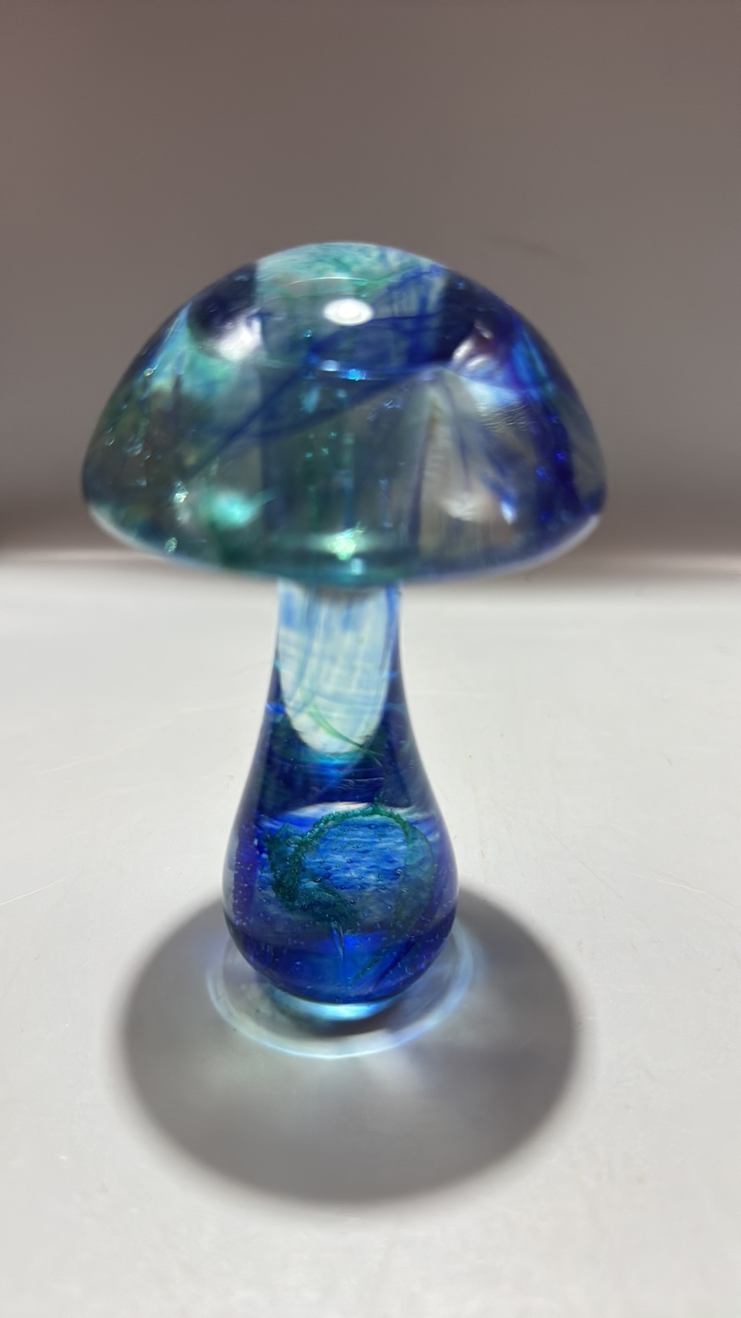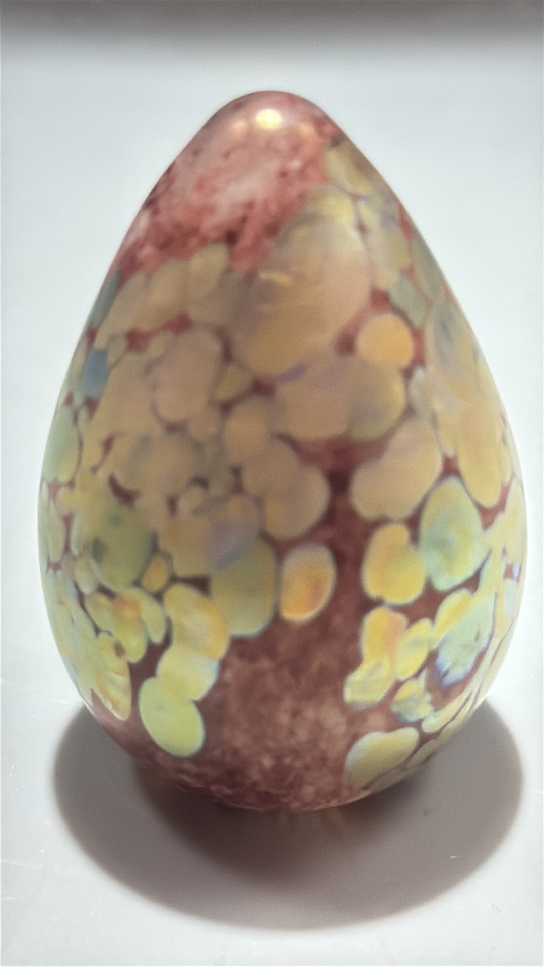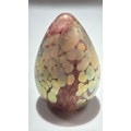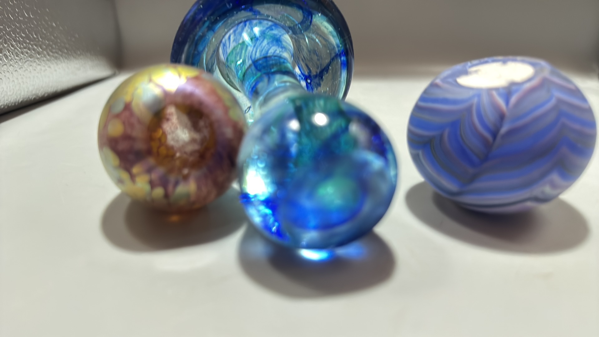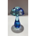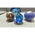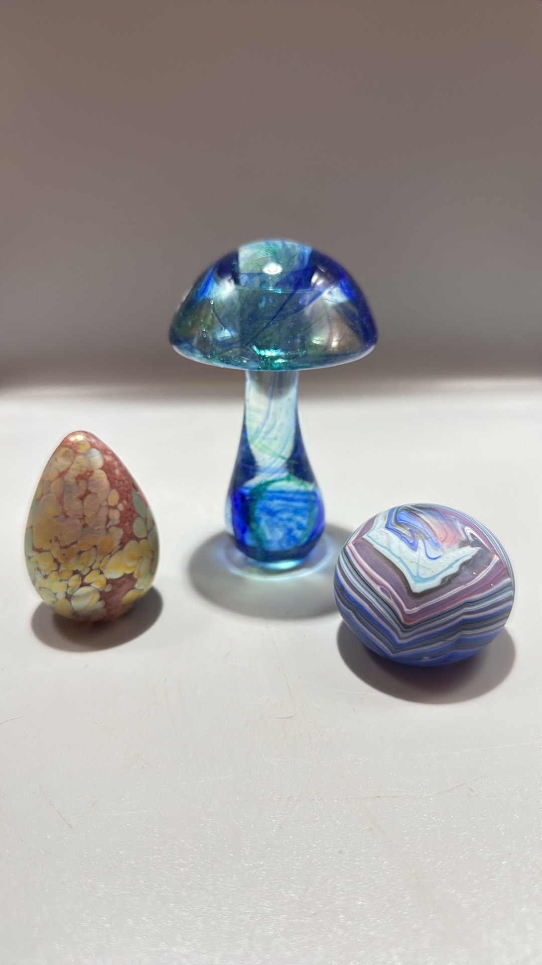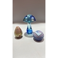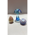 Set of 3 studio art glass paperweights: mottled yellow-pink egg, blue-green mushroom, and striated lilac-blue sphere, each solid blown glass, unsigned.
