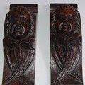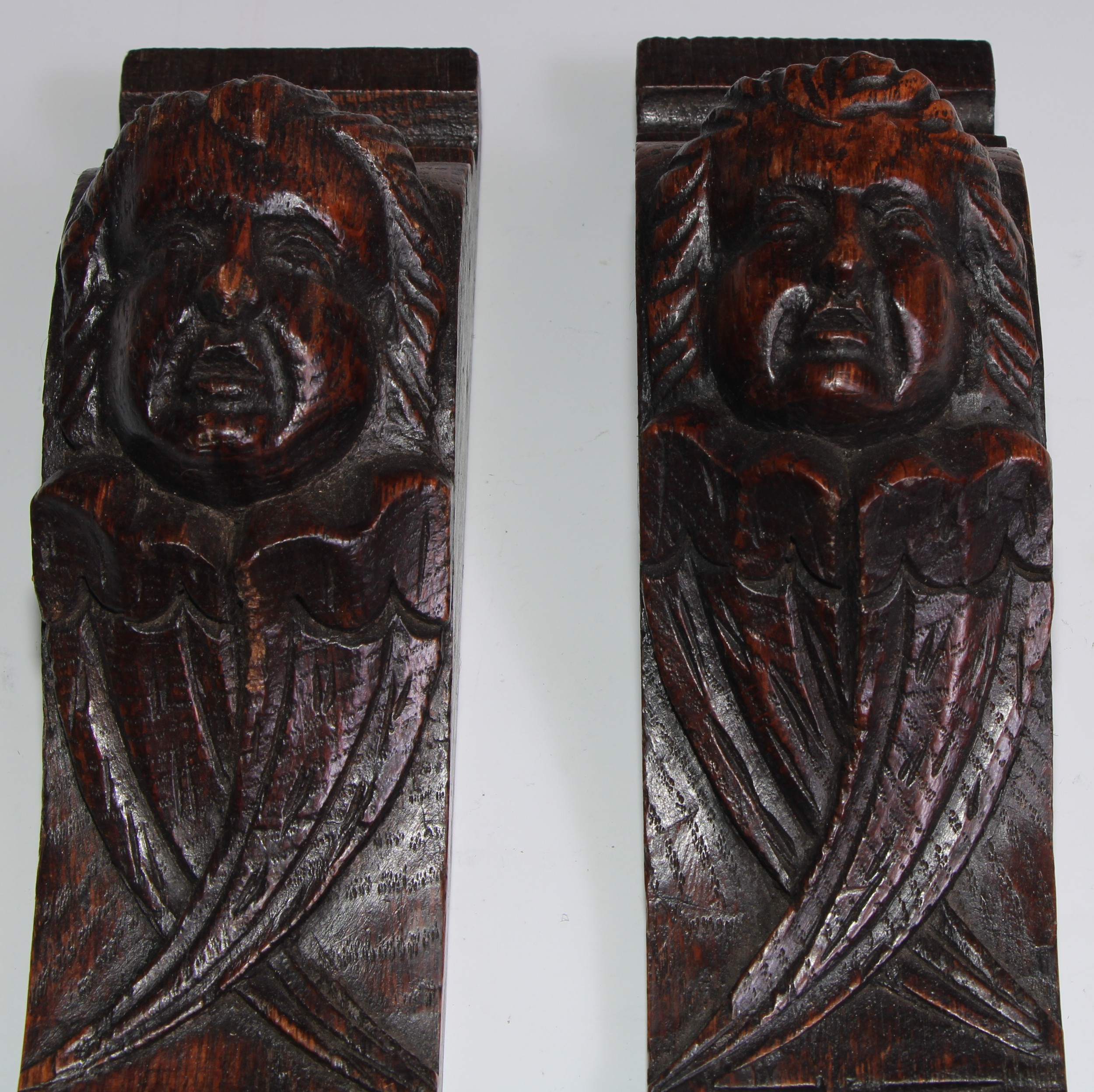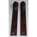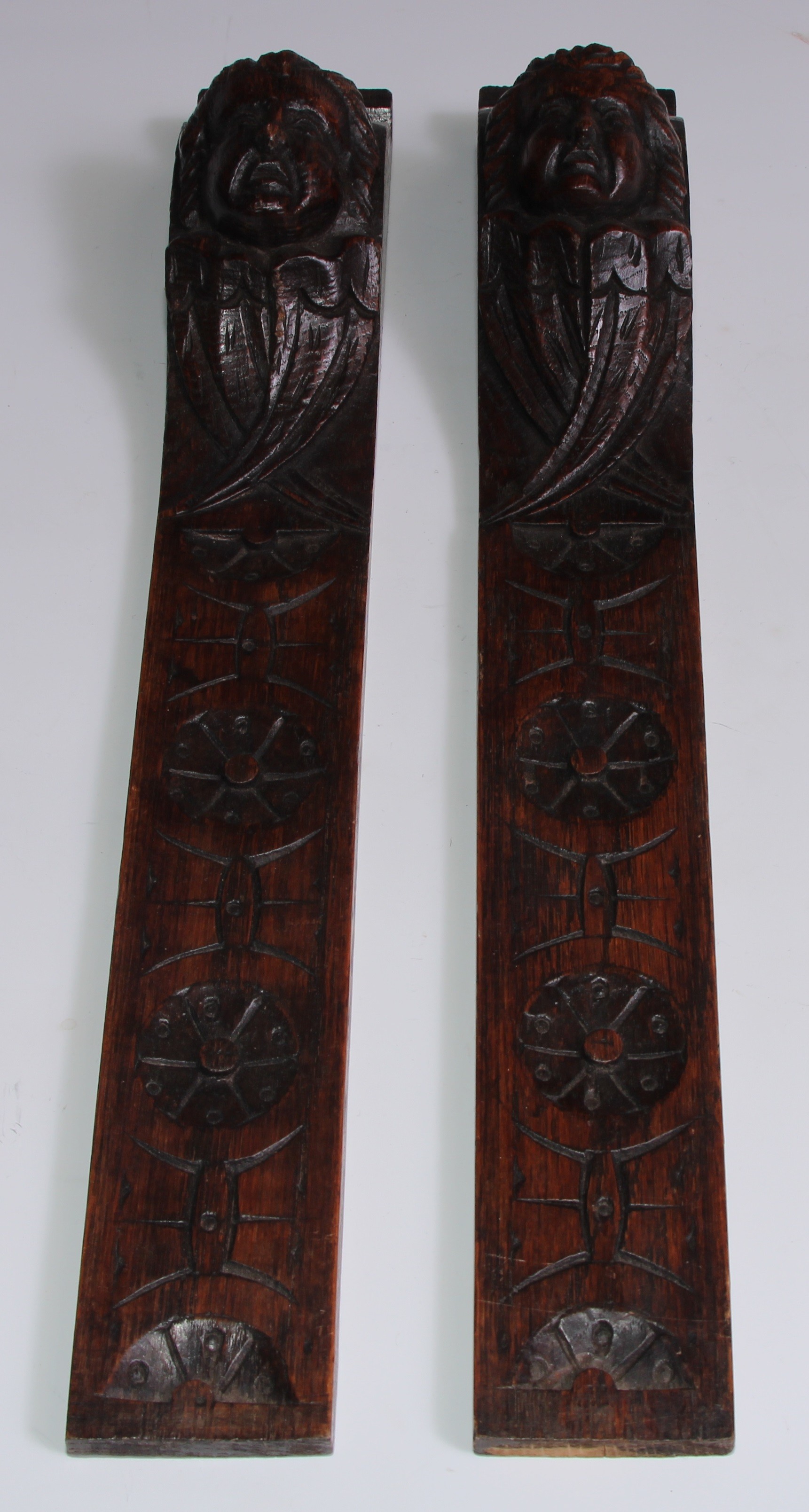 A pair of 19th century oak pilasters, carved with masks above stylised flowerheads, 46cm long