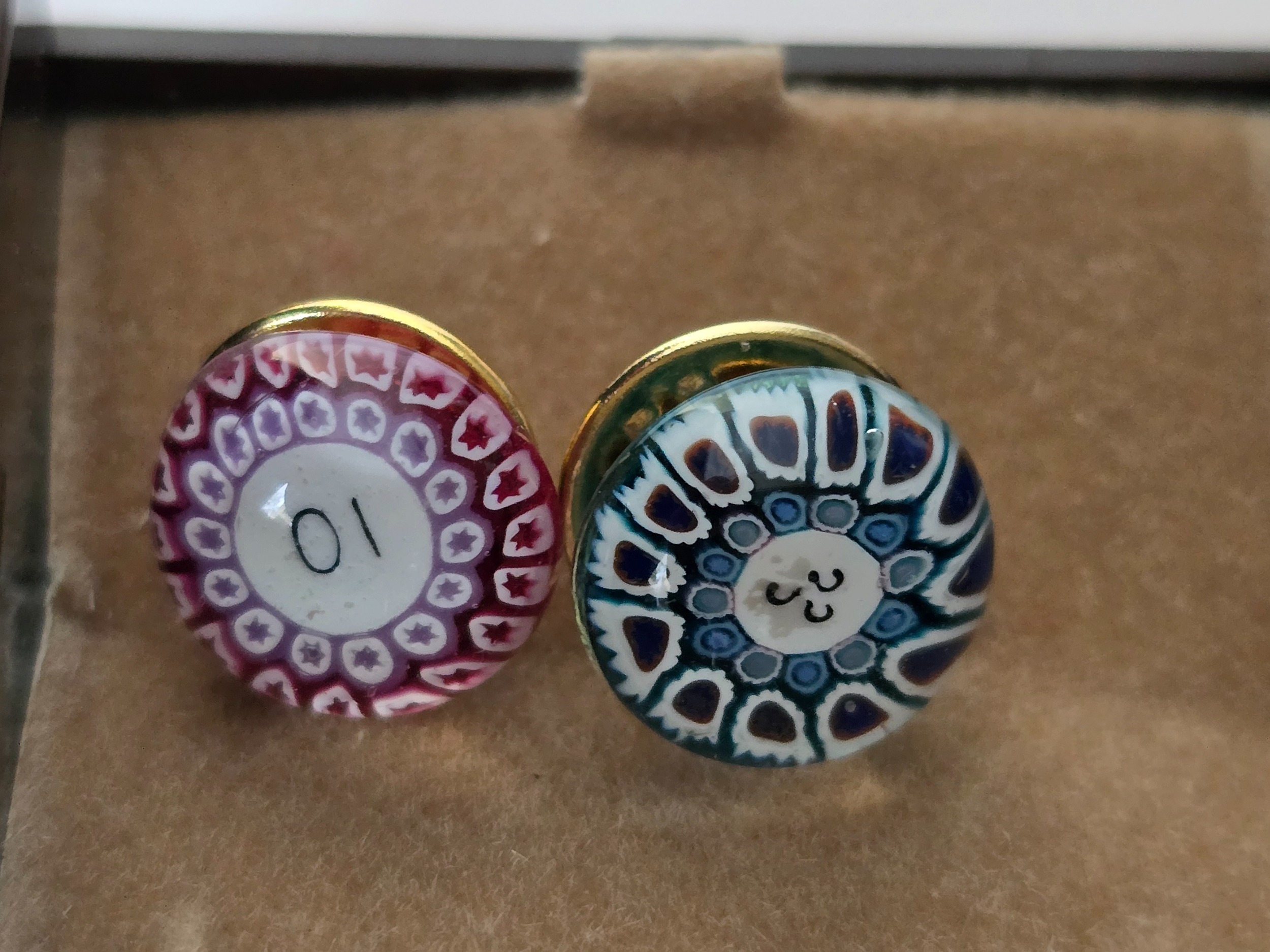 Two Caithness paperweight Tie pins/ Lapel pins. Attractive paperweight stones mounted on gold metal, with central CCC and 10 marks, probably denoting the 10th anniversary of the Caithness Collectors Club. Excellent condition.