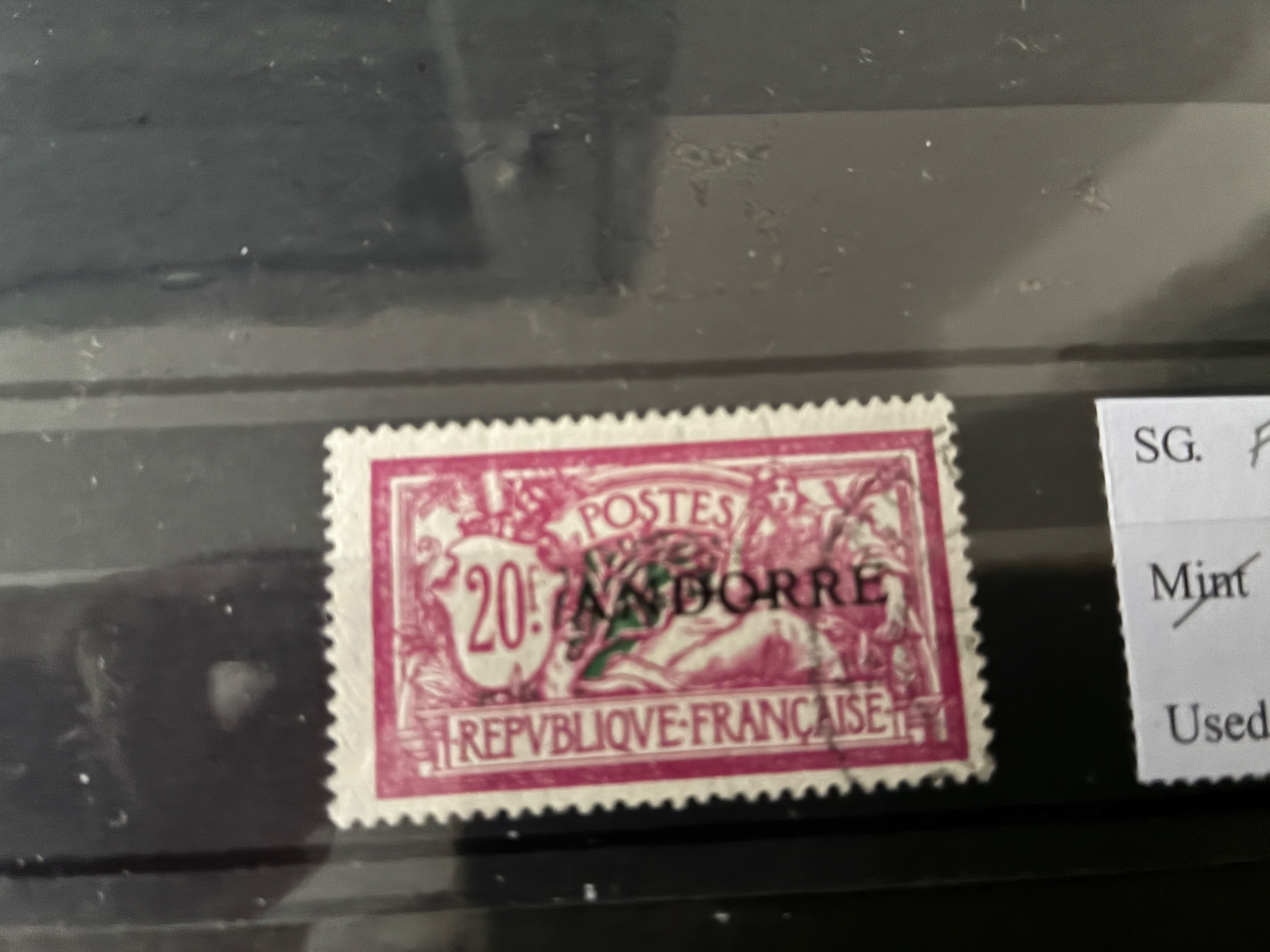 Andorra (French) 1931 20f mauve & green, vfu. (SG F23). Cat £650