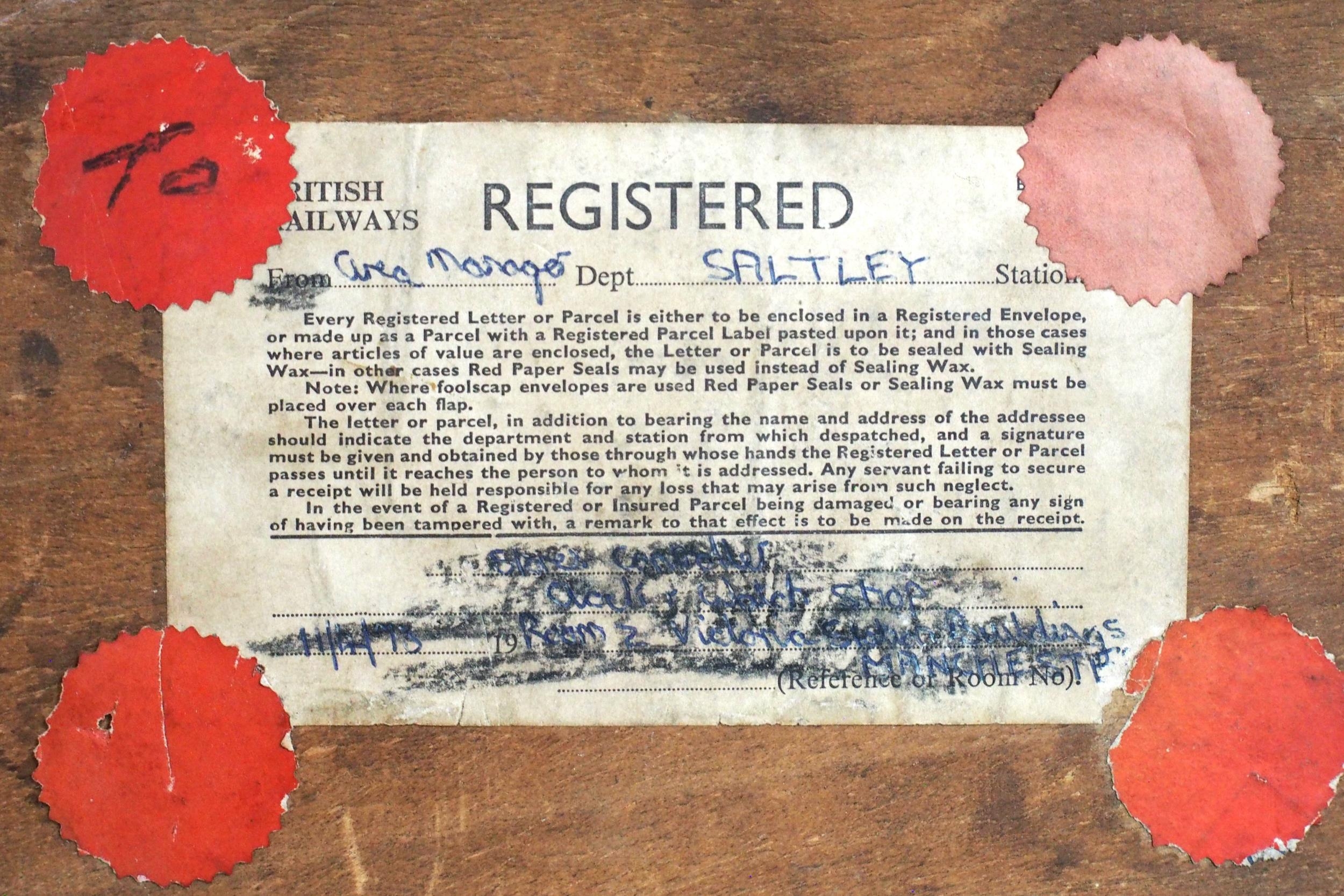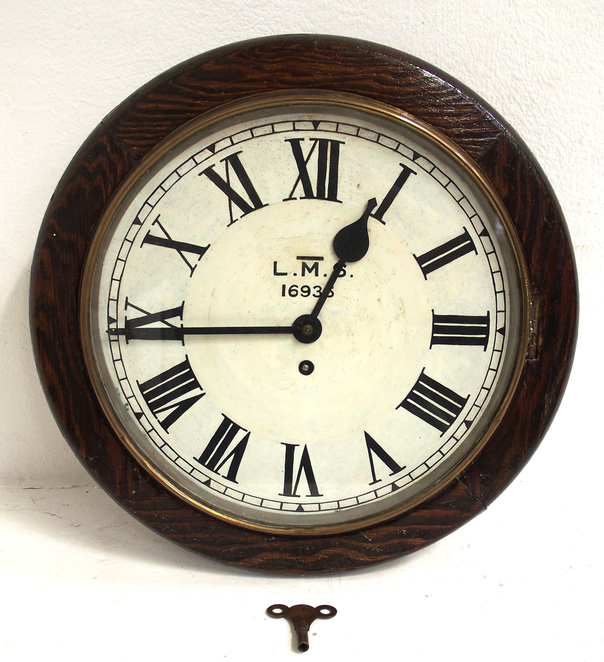 LMS 12" dial oak cased non Fusee wall clock No 16936, original face, British Railways on rear states it was stationed at the General Manager's Office Saltley, with key & in working condition. (Dispatch by Mailboxes/Collect from Banbury Depot)