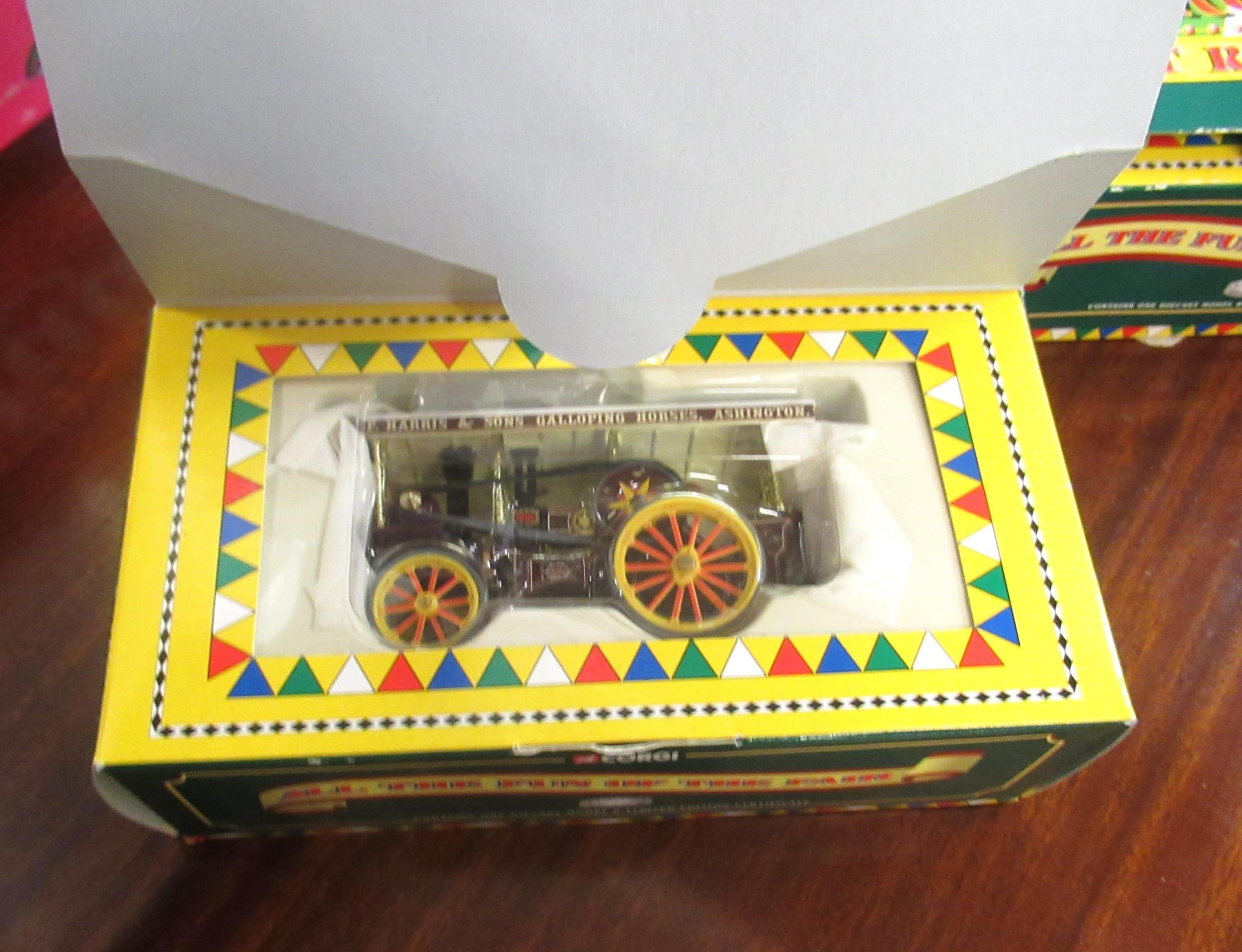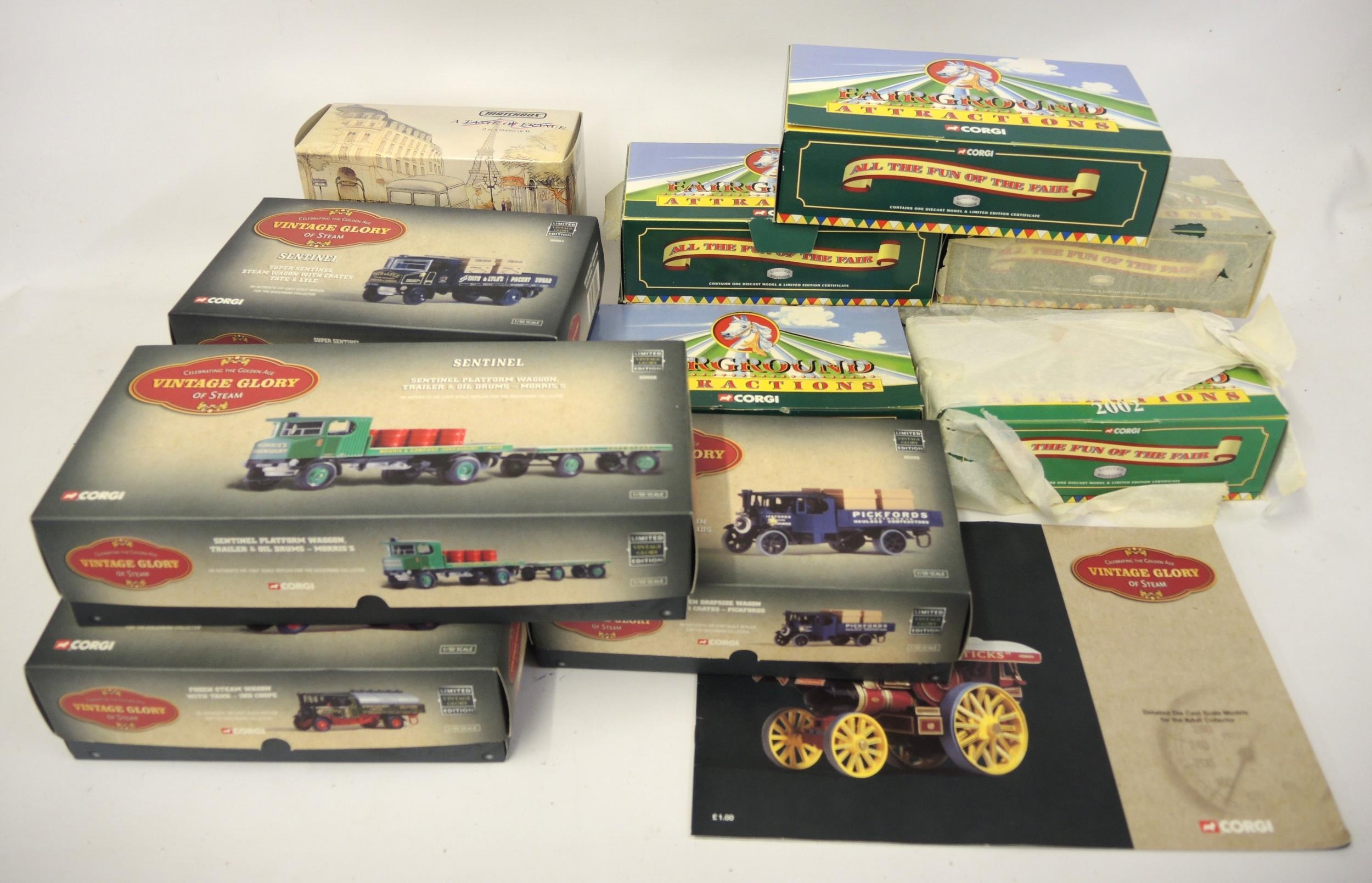Six boxed Corgi Vintage Glory of Steam Limited Edition unused boxed diecast vehicles, with catalogue and six Corgi fairground attractions diecast model vehicles (boxed)