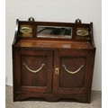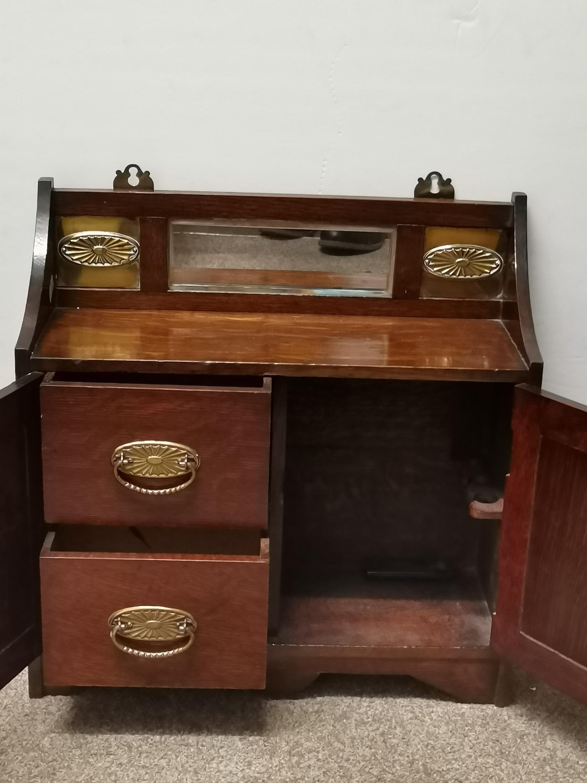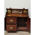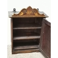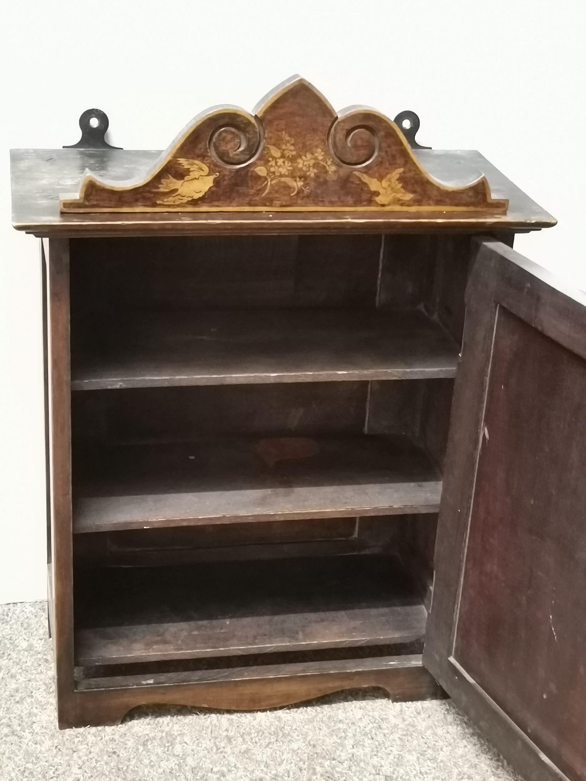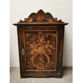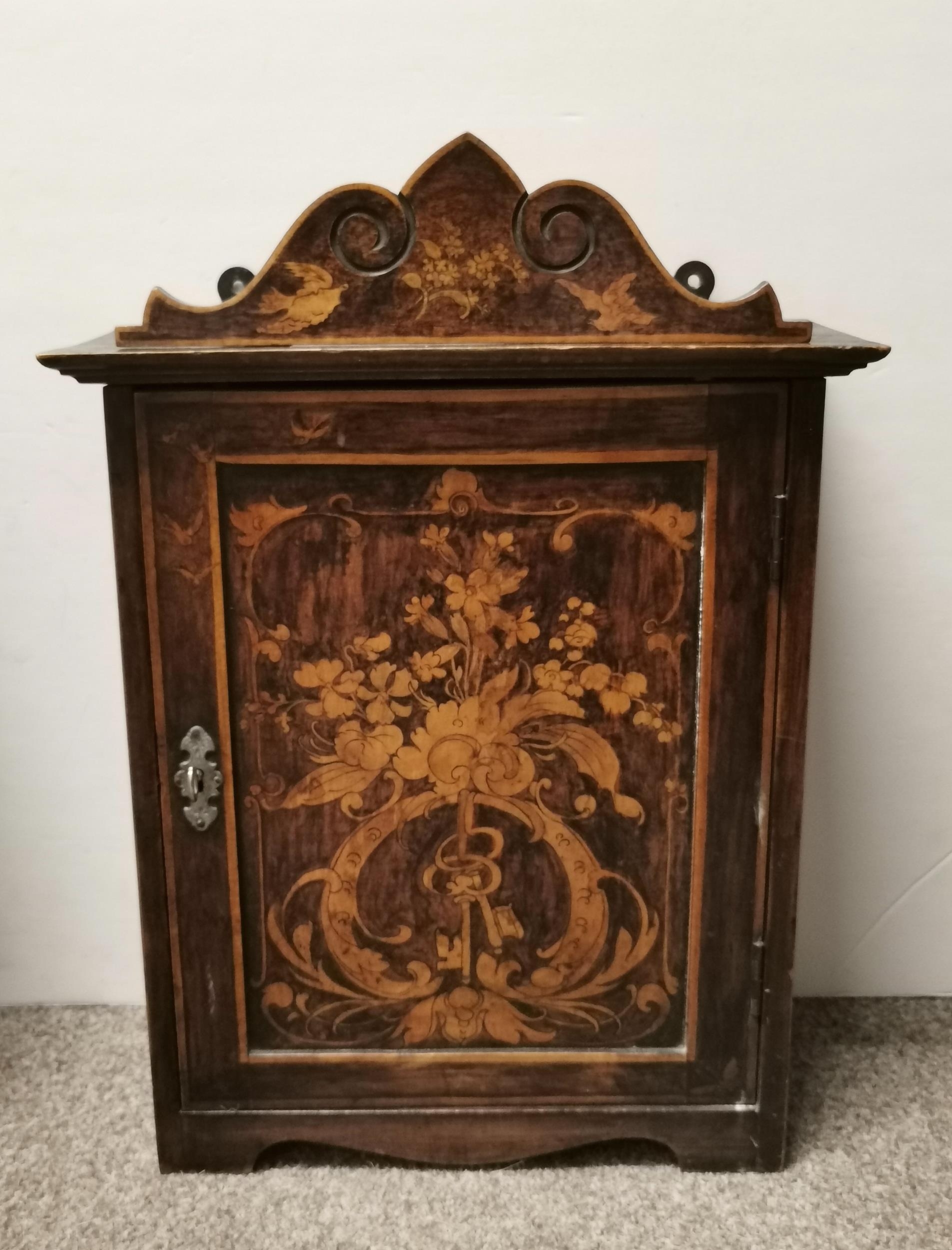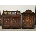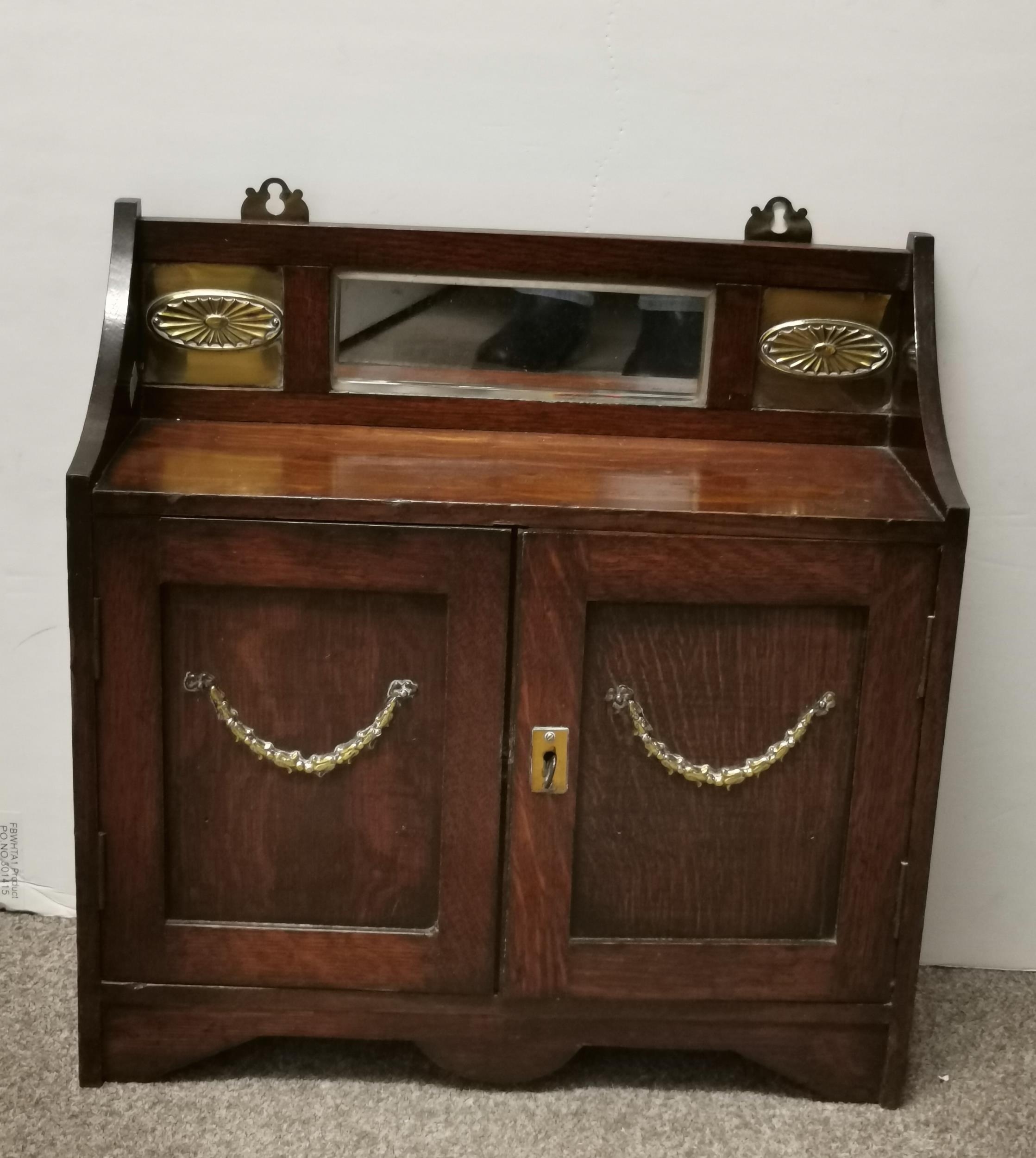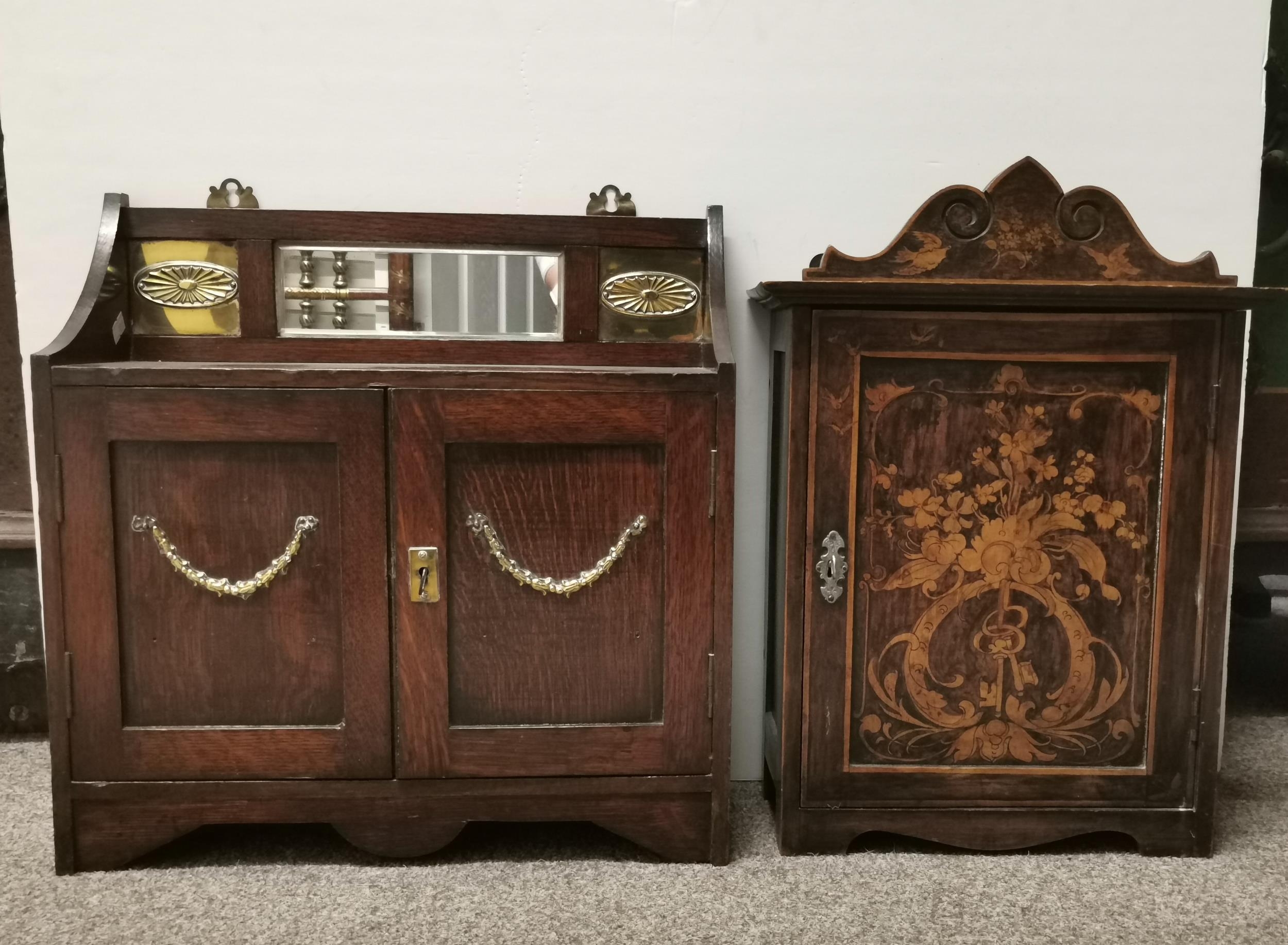 A small antique wall-hanging cabinet with inked marquetry-style decoration to front and sides; together with a brass-mounted wall-hanging smoker's cabinet with mirror back, fitted with pipe rack and two drawers. (2) Smoker's cabinet 40.5cm high, 39.7cm wide, 14.1cm deep