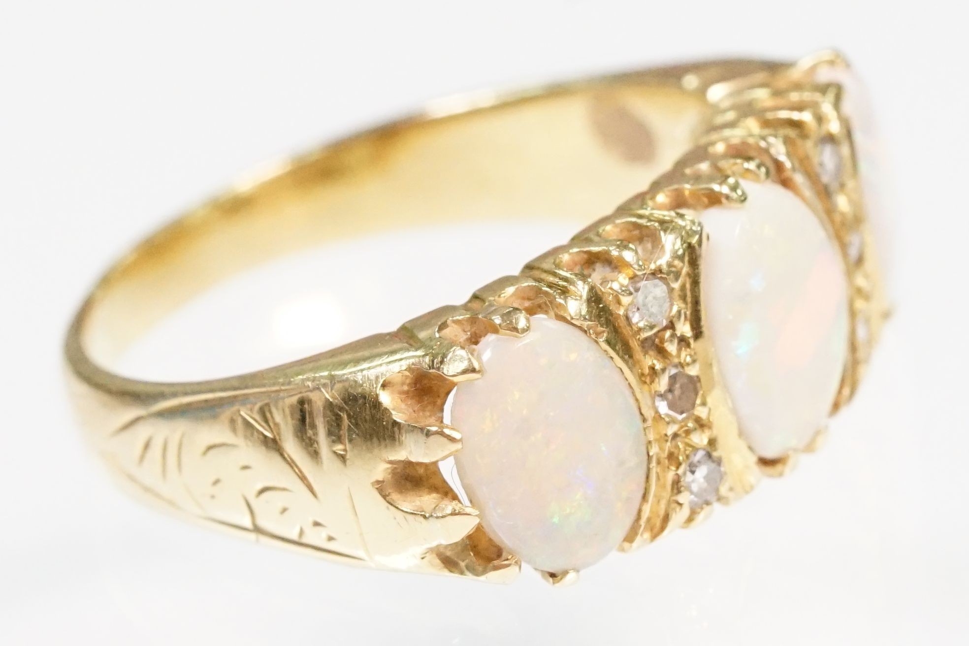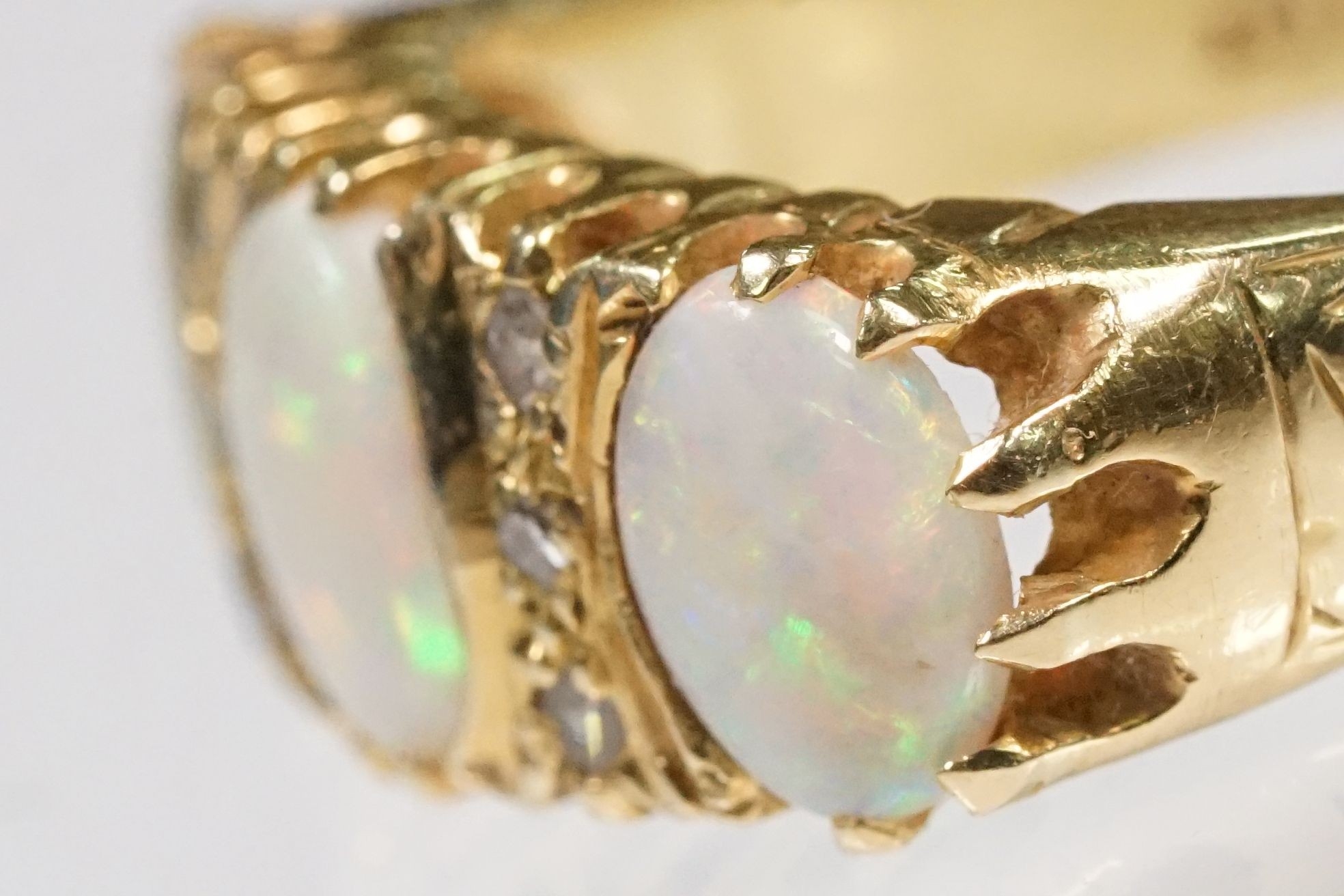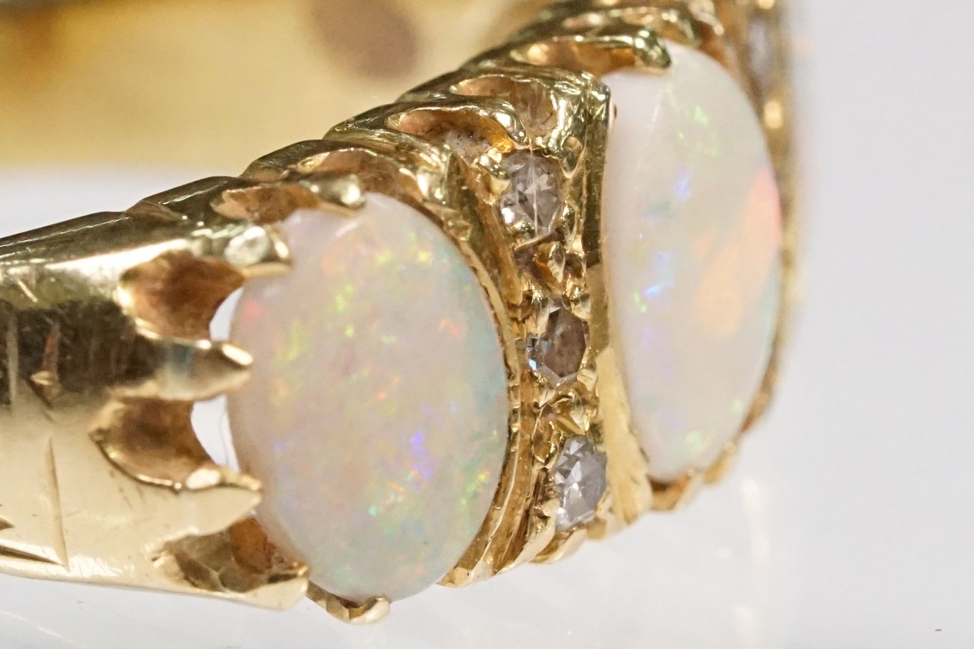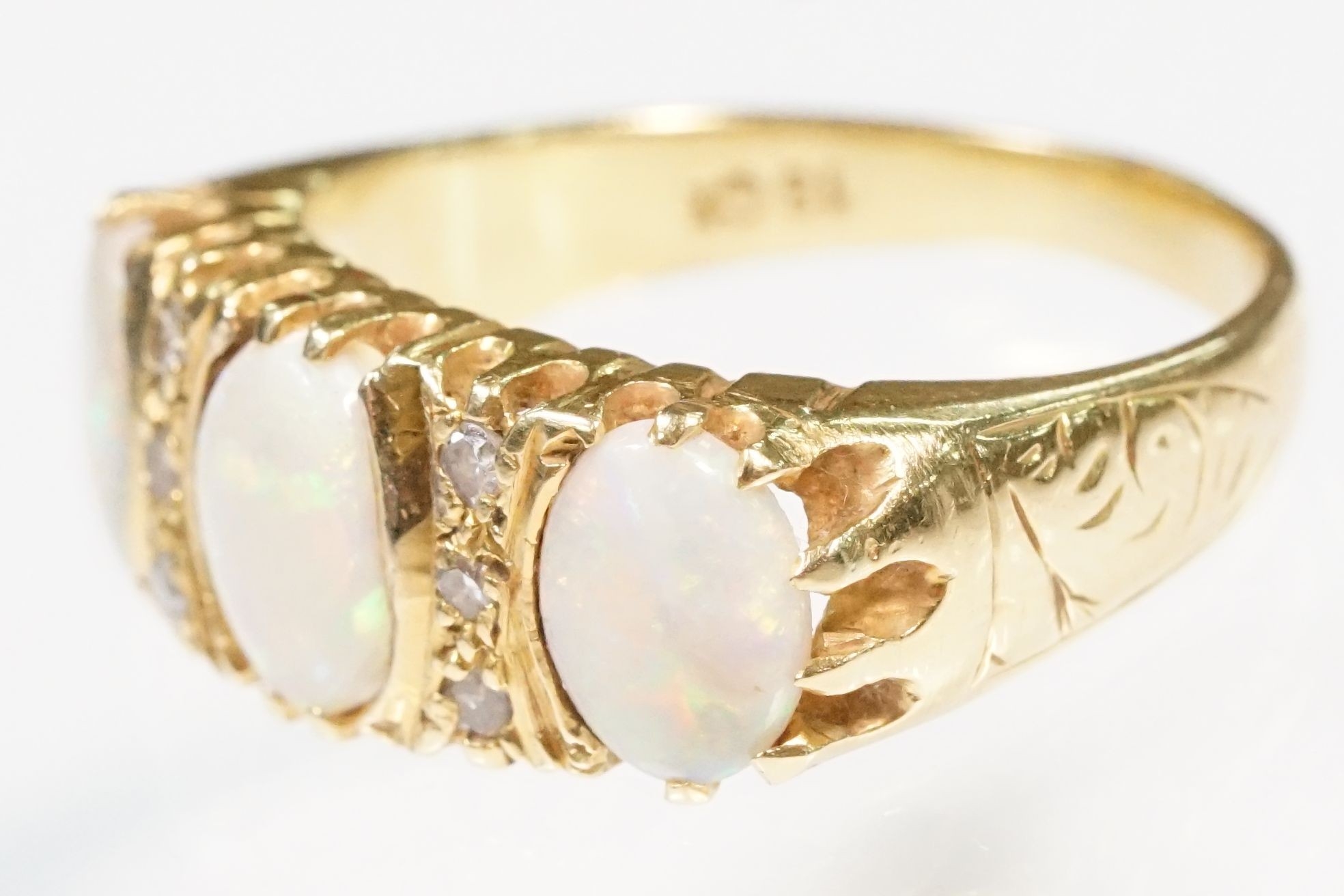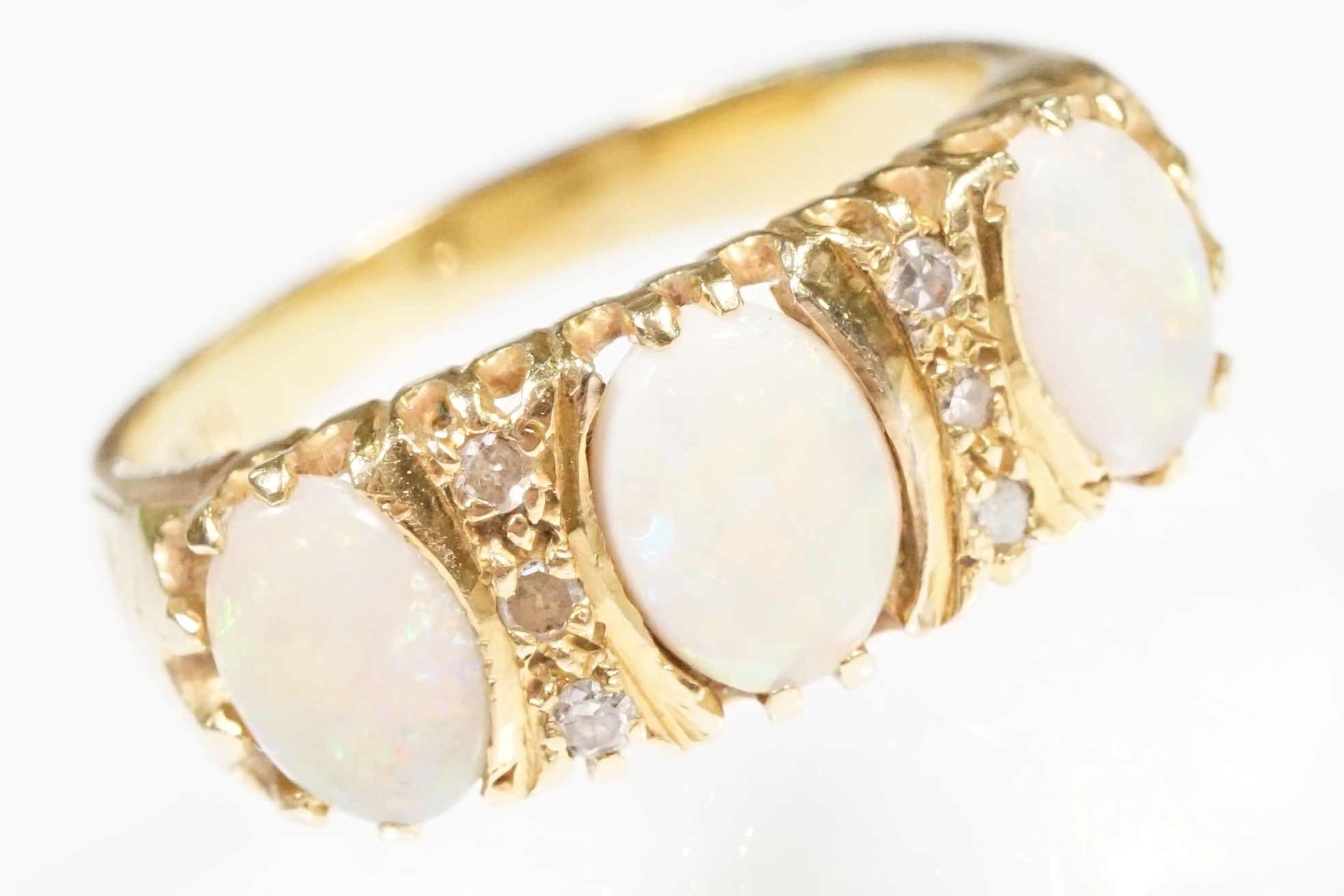 18ct gold, opal and diamond ring. The ring being set with three oval opal cabochons with six diamond accent stones. Shank marked 18ct. Size P.5. Opals measure approx 8 x 6mm.