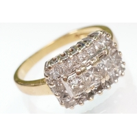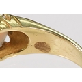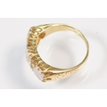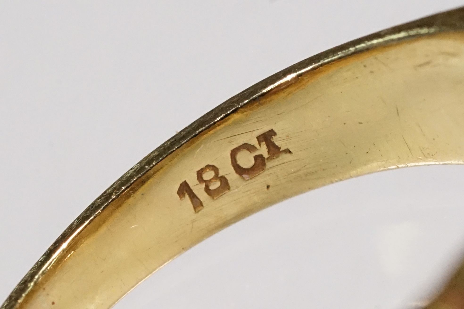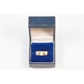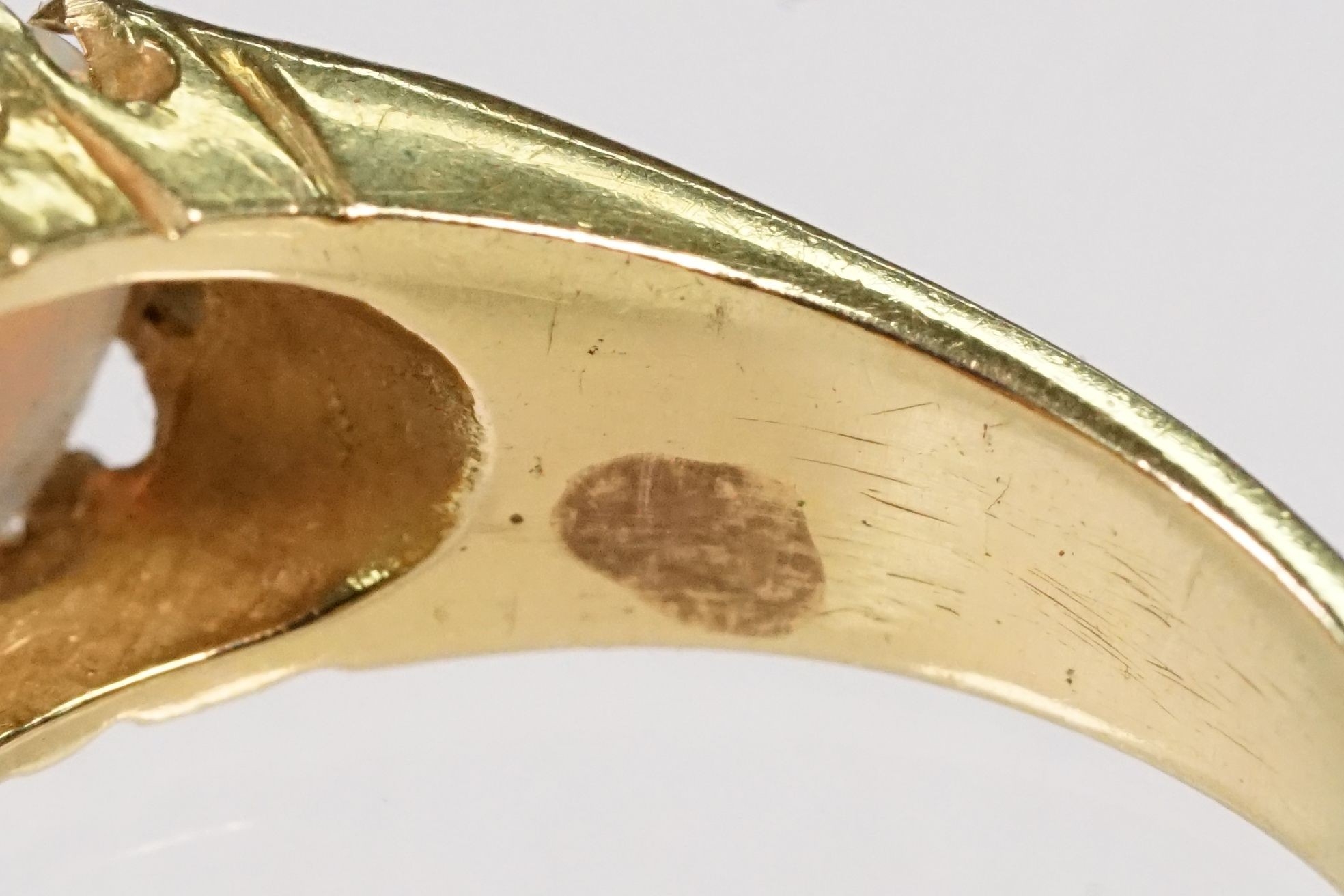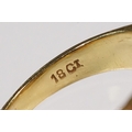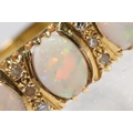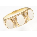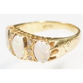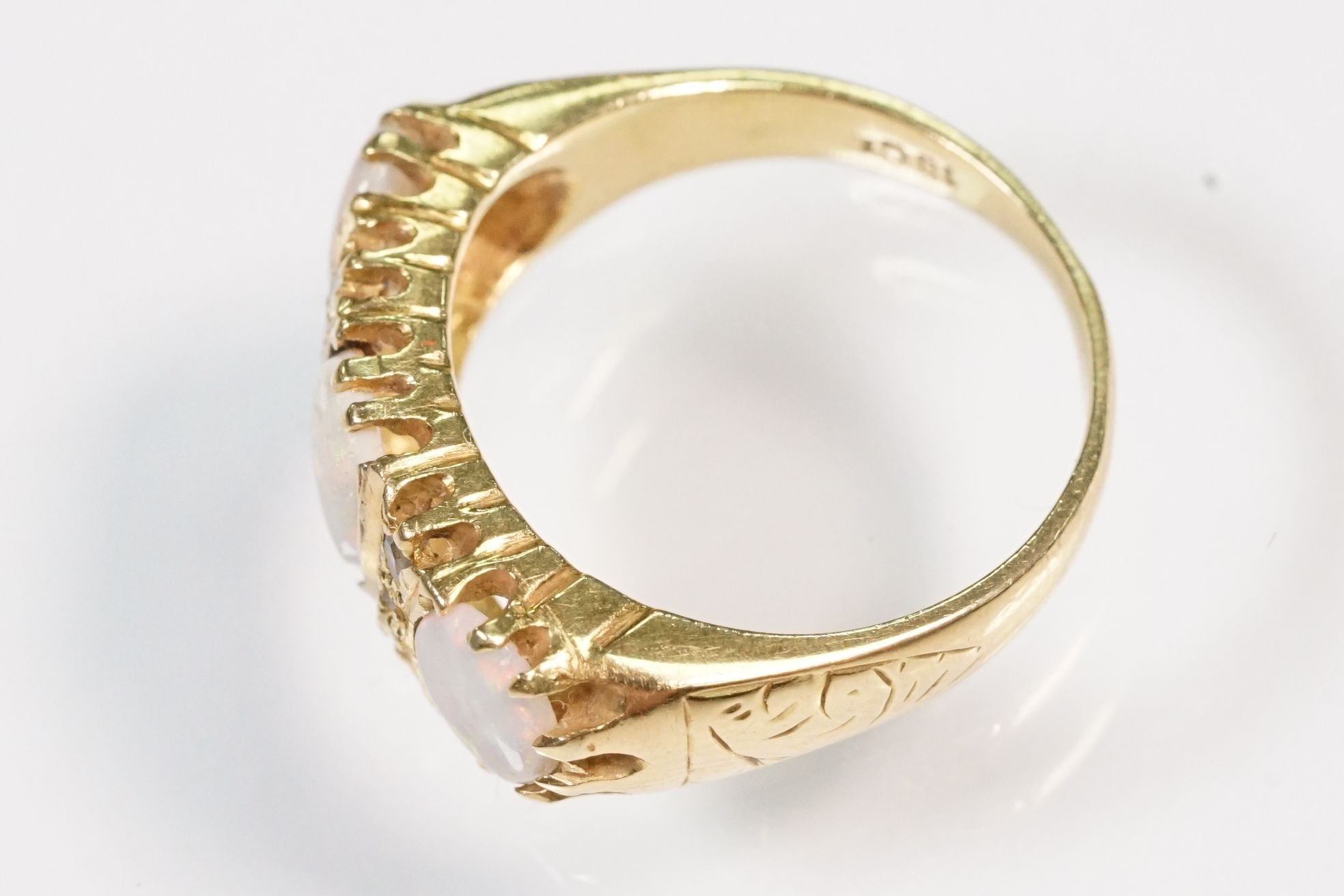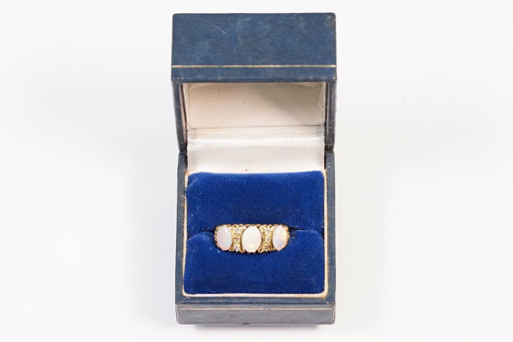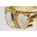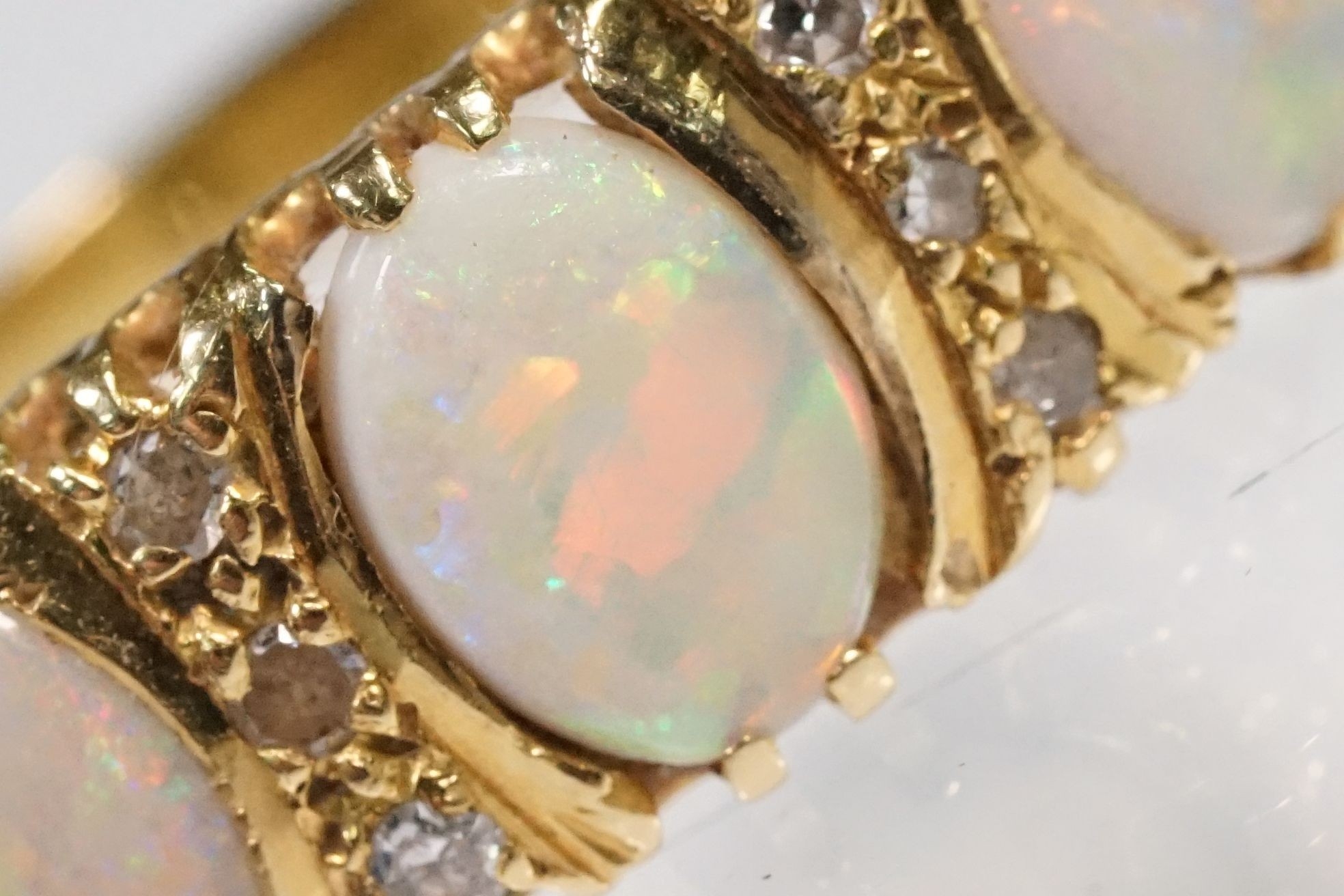 18ct gold, opal and diamond ring. The ring being set with three oval opal cabochons with six diamond accent stones. Shank marked 18ct. Size P.5. Opals measure approx 8 x 6mm.