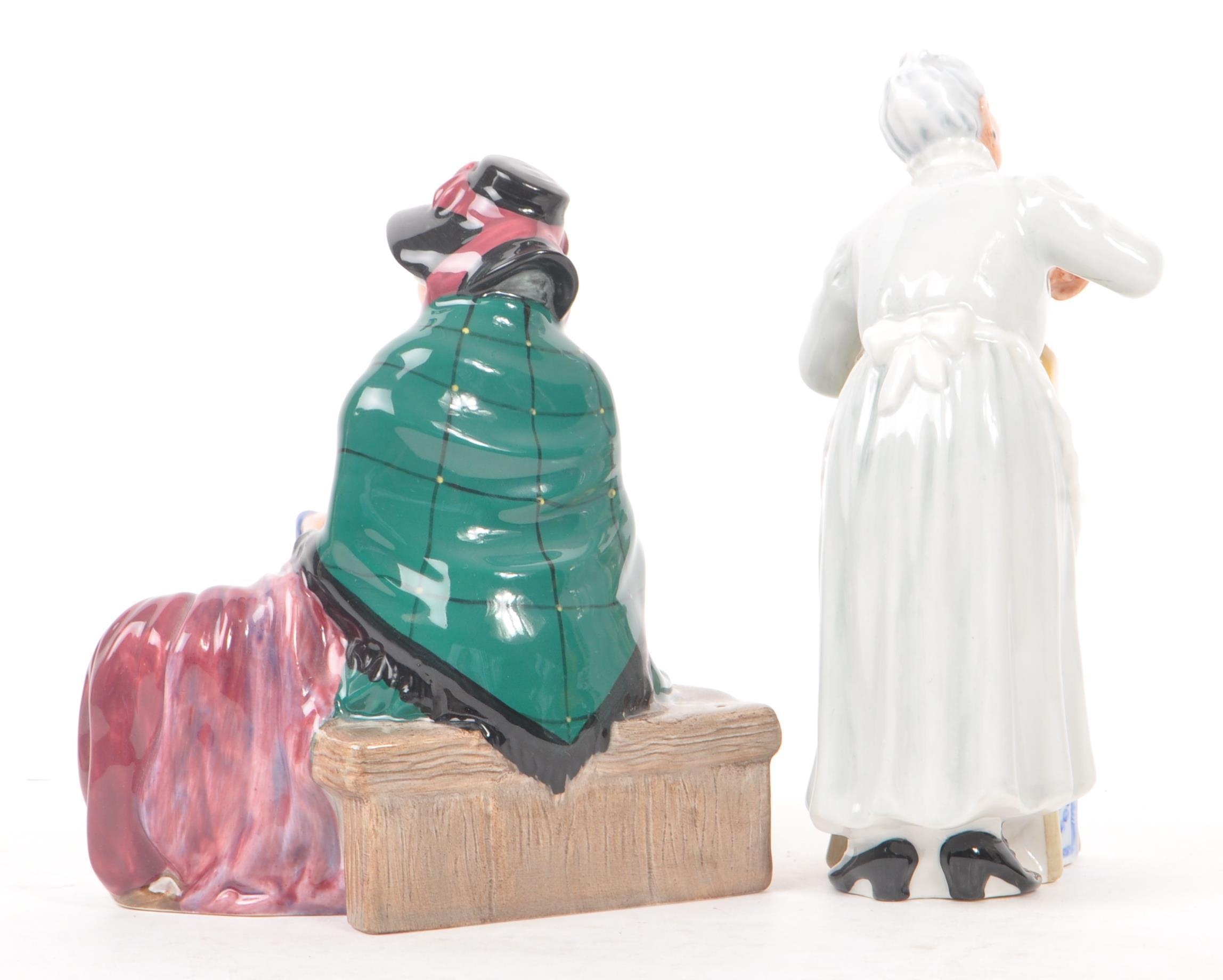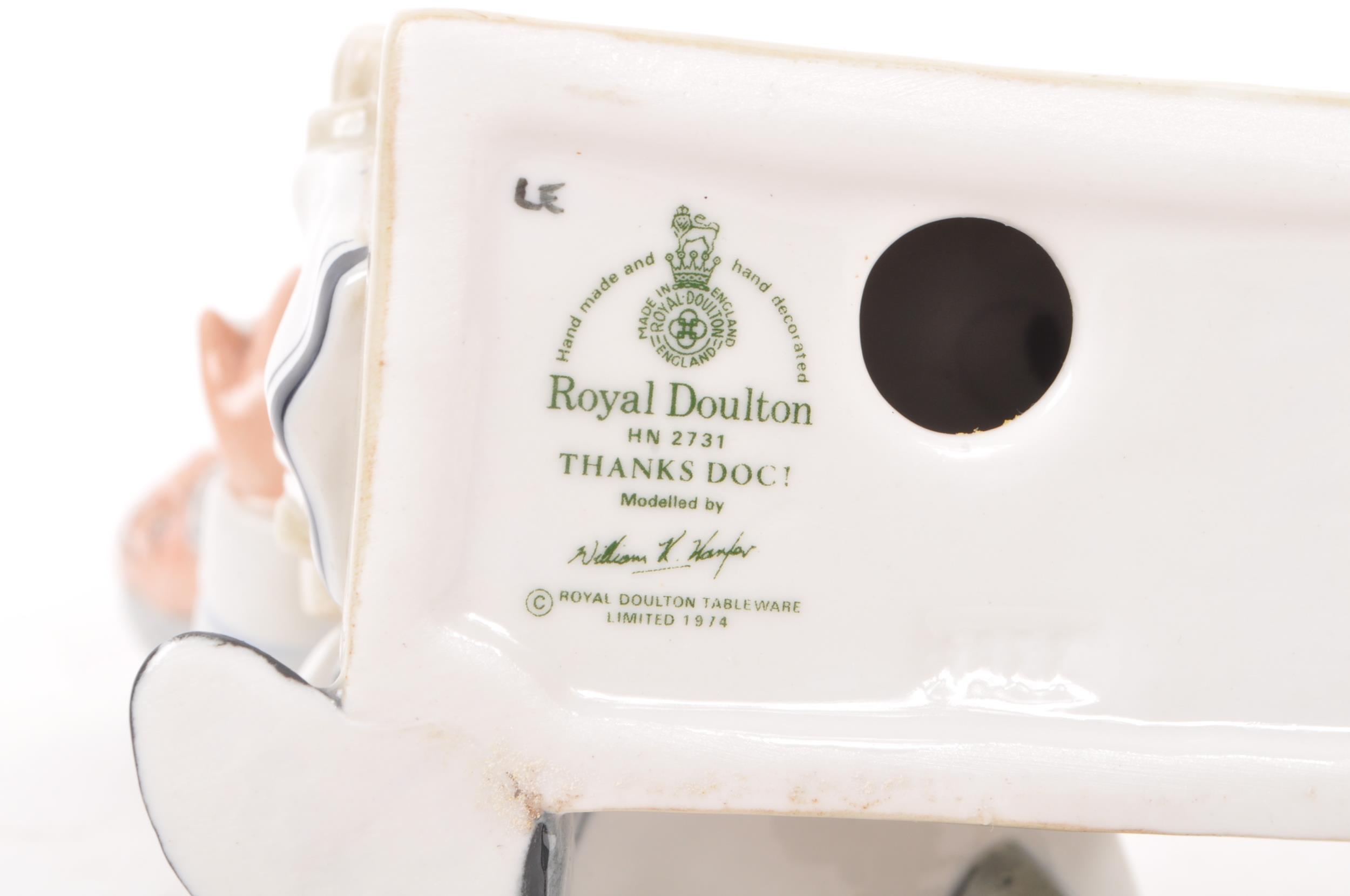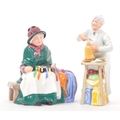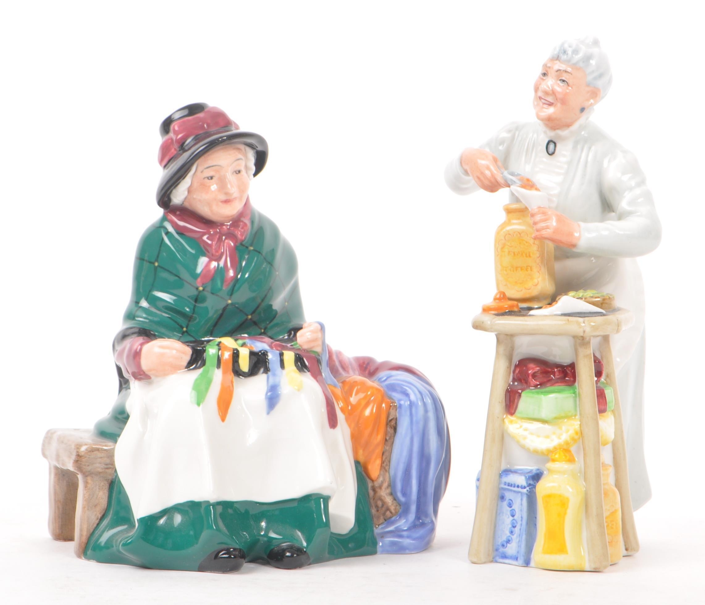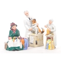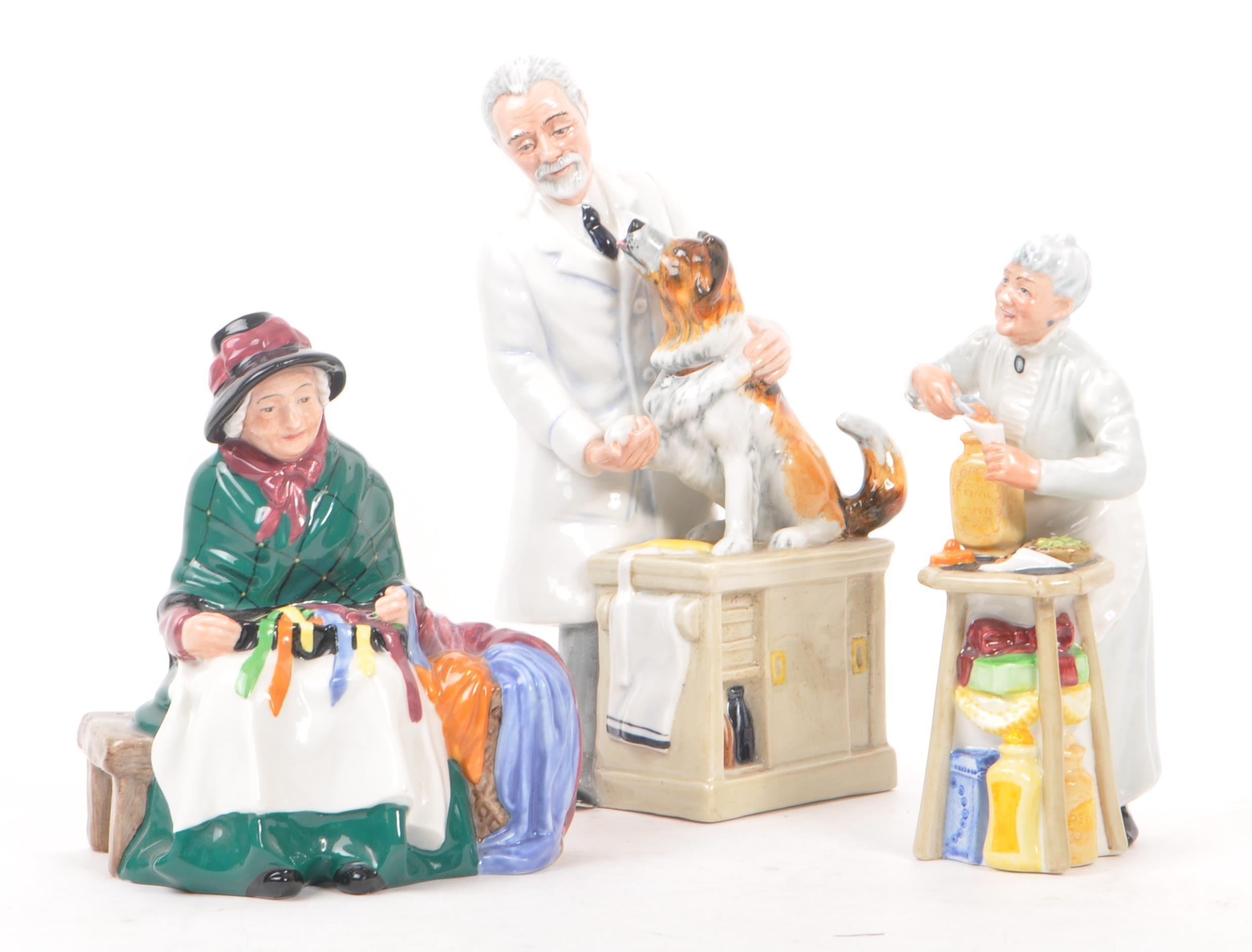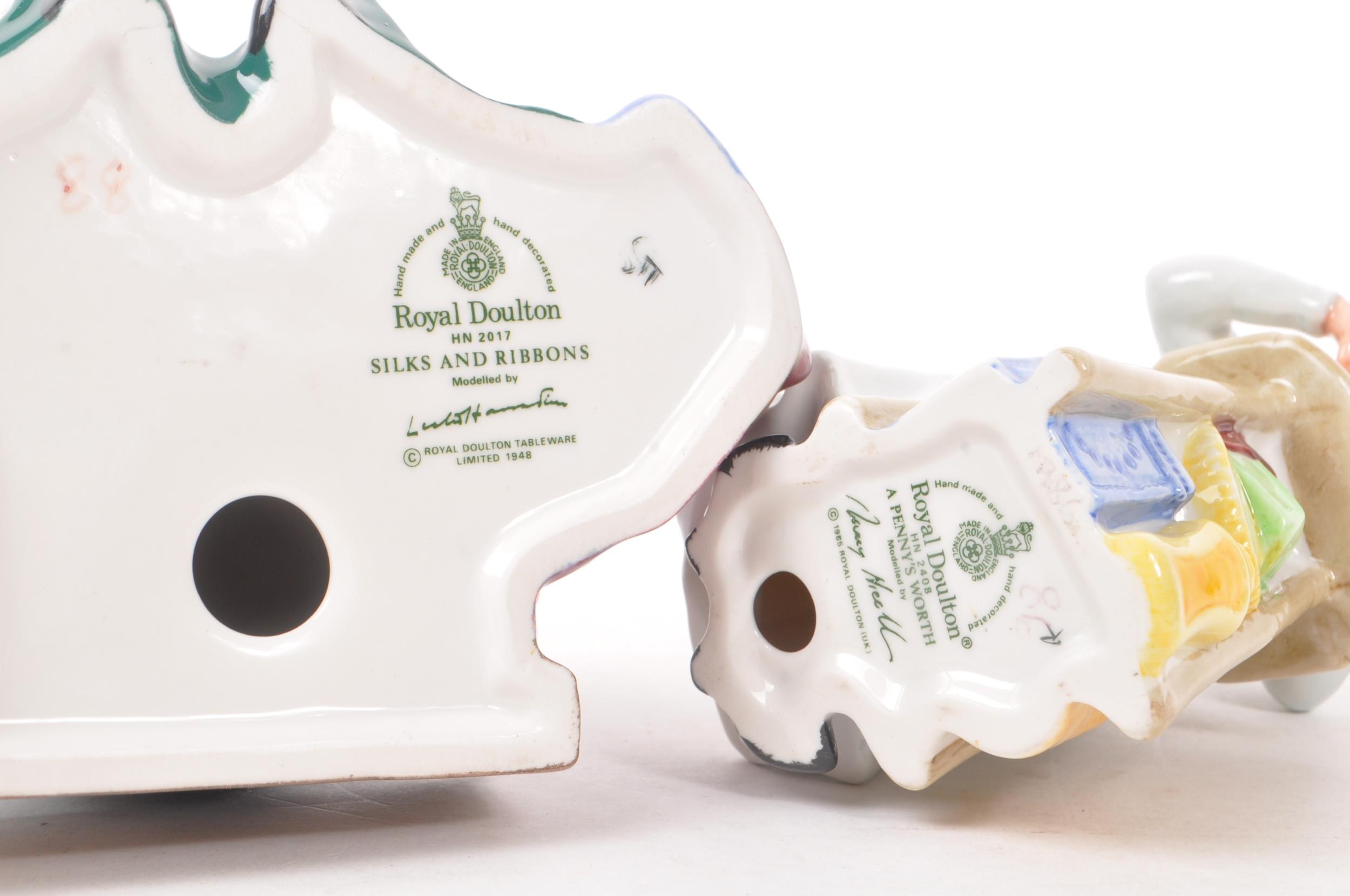 Royal Doulton - A collection of three 20th Century porcelain china Royal Doulton figurines comprising of: Thanks Doc HN2731, A Penny's Worth HN2408, and Silks and Ribbons HN2017. All stamped to base. Largest measuring approx. 22.5cm tall.