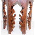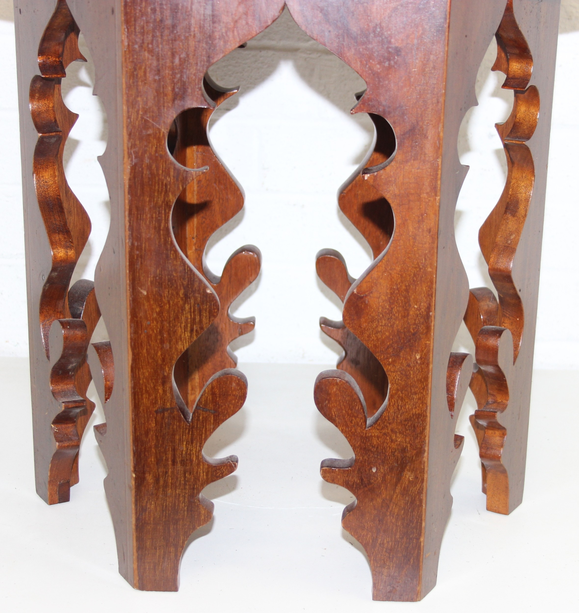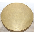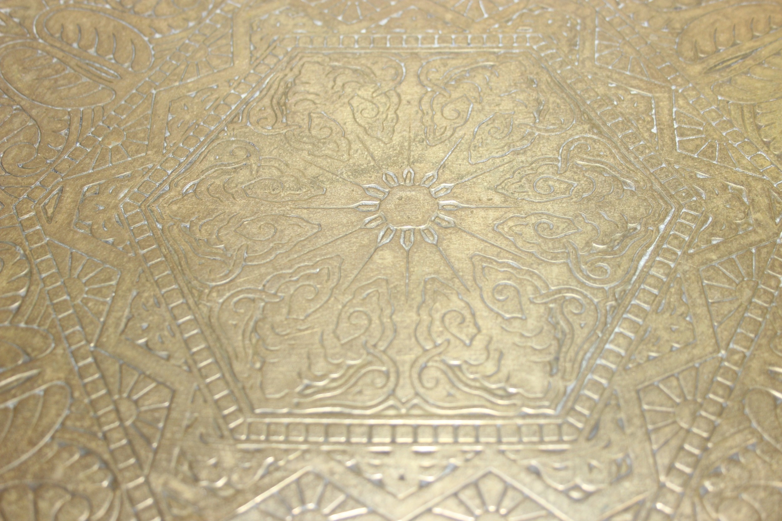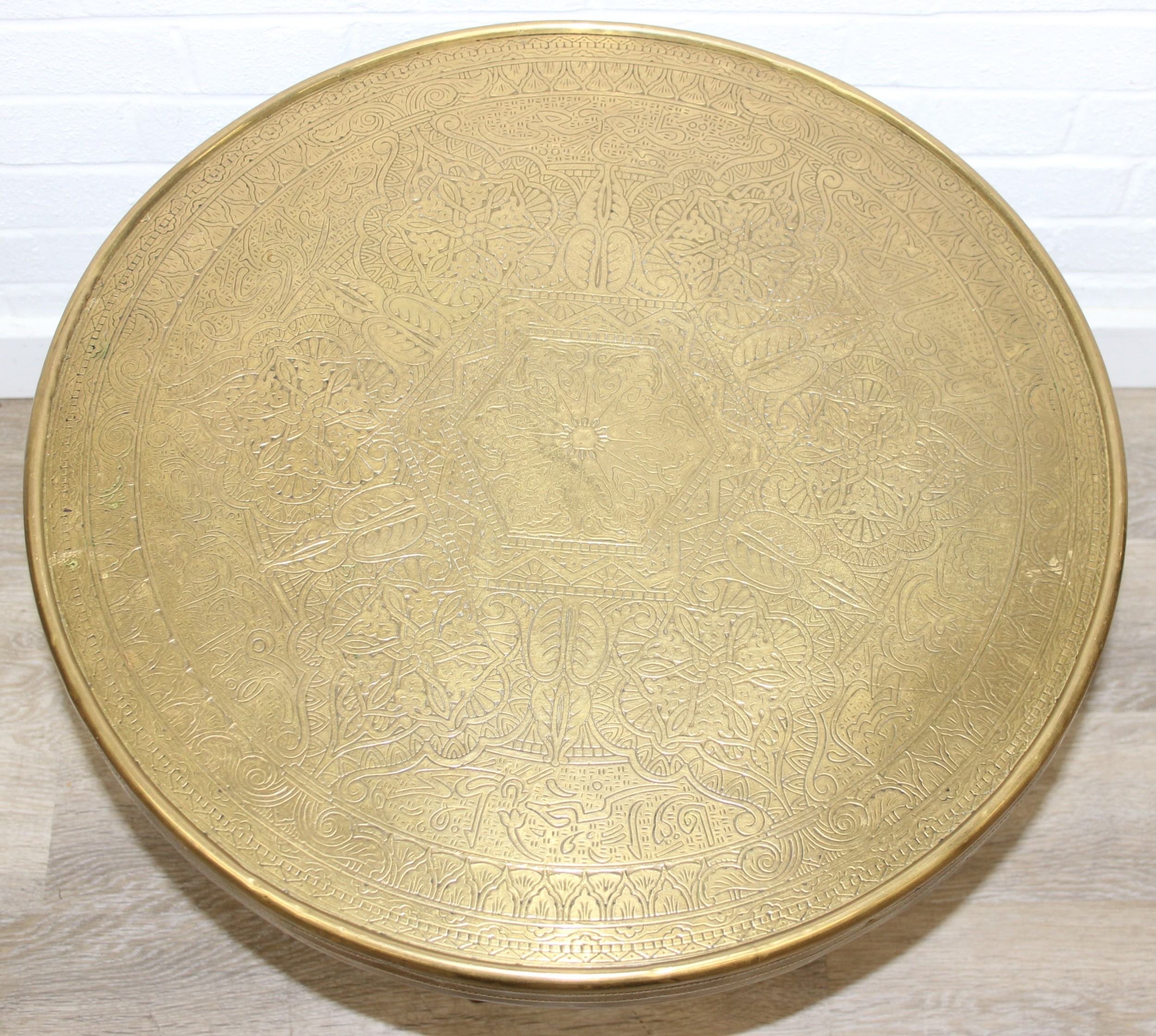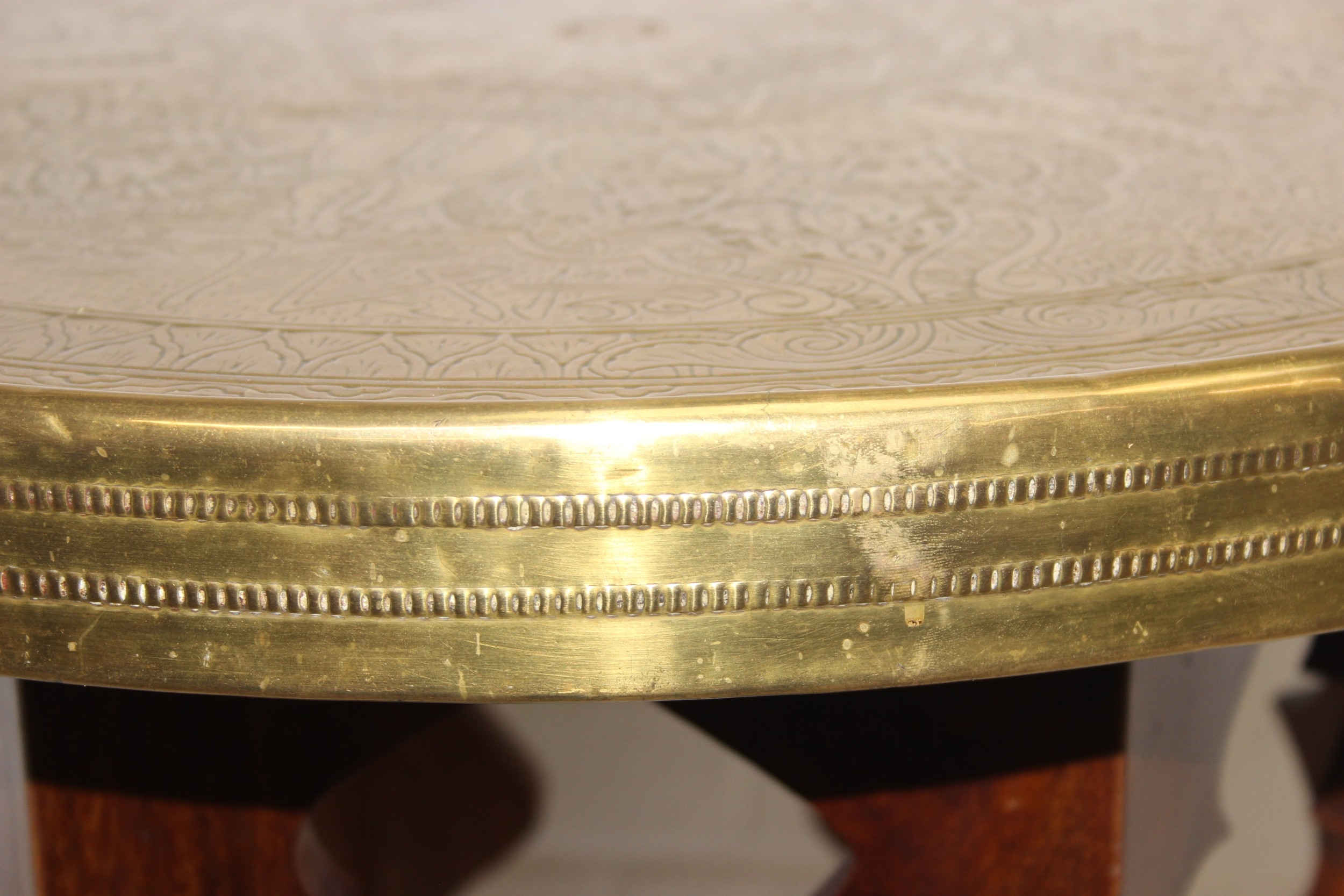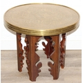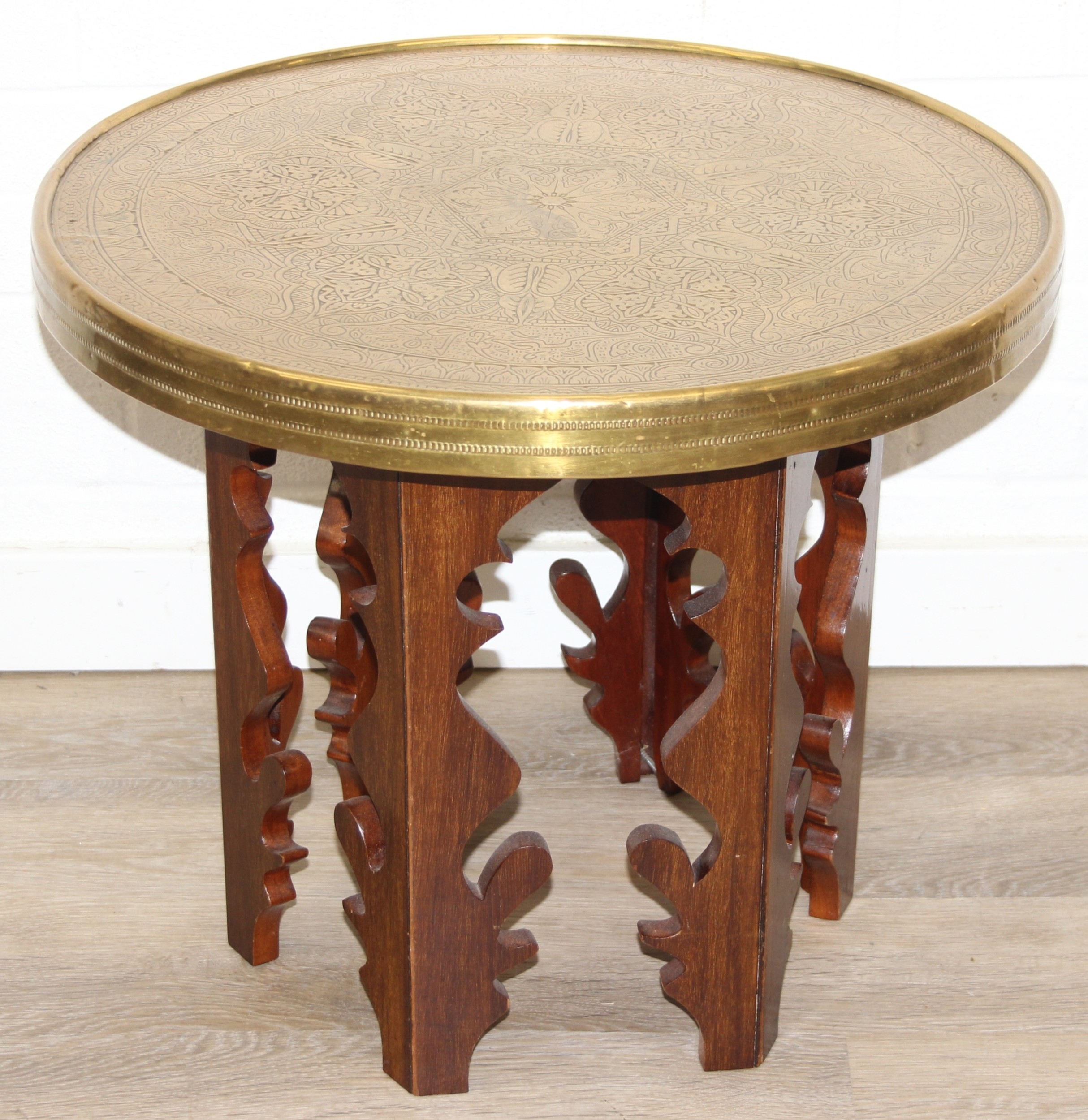 A small vintage brass topped table with Moorish style carved wooden base, 60cm in diameter x 50cm tall