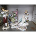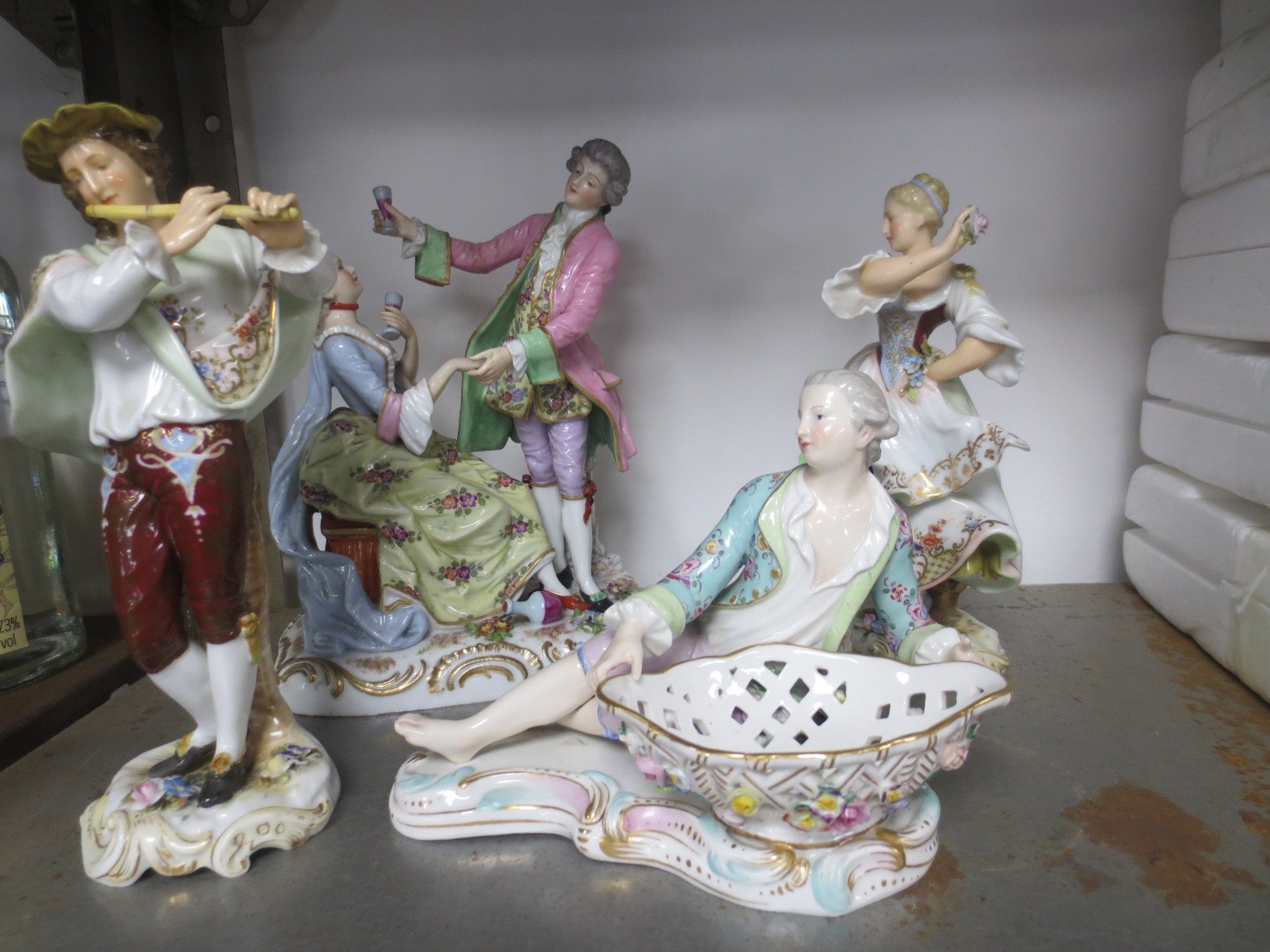Two Volkstedt porcelain figures, man playing flute and woman dancing (a/f chip to fingers). And two Meissen style figures, a group of man and woman drinking wine (a/f small chips to woman's hair), and a figural bonbon dish (a/f damage to foot), with crossed swords marks to base.