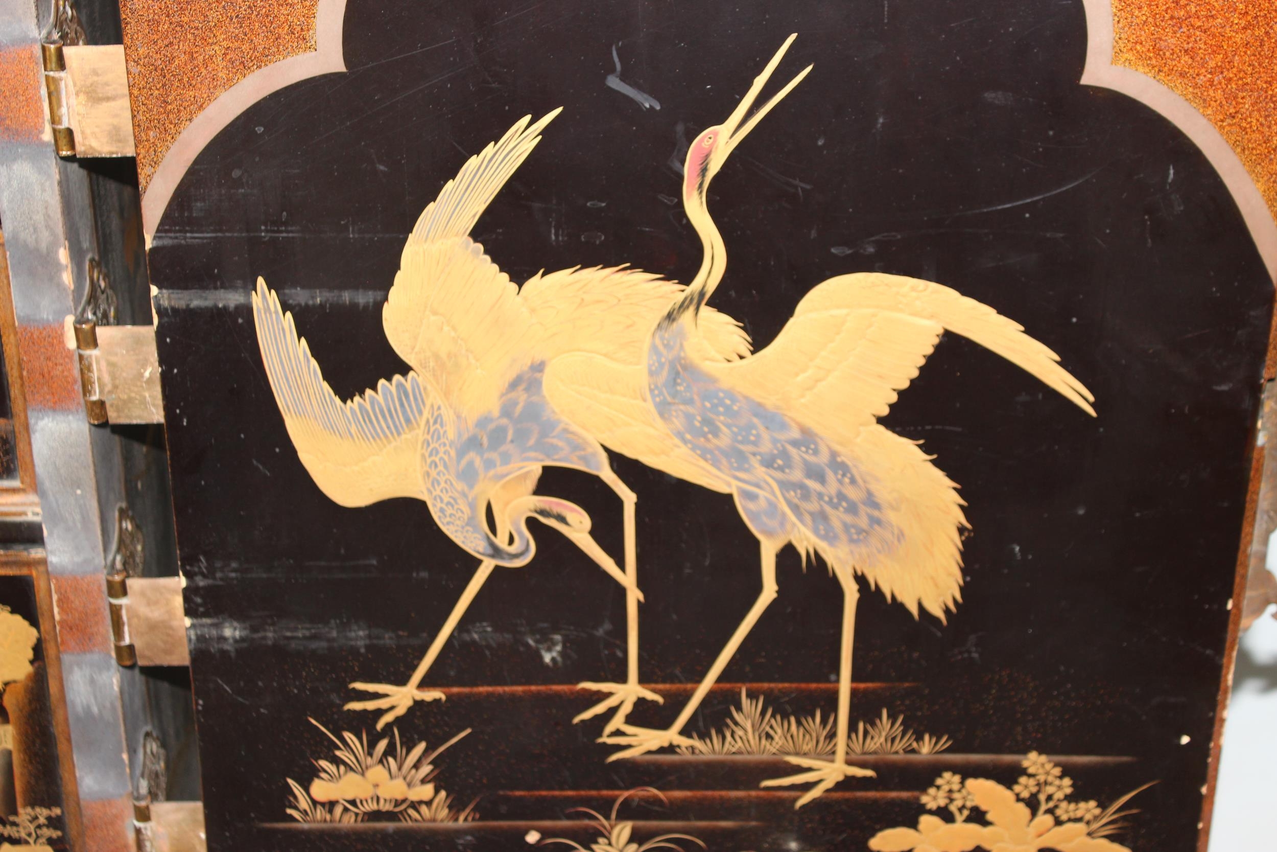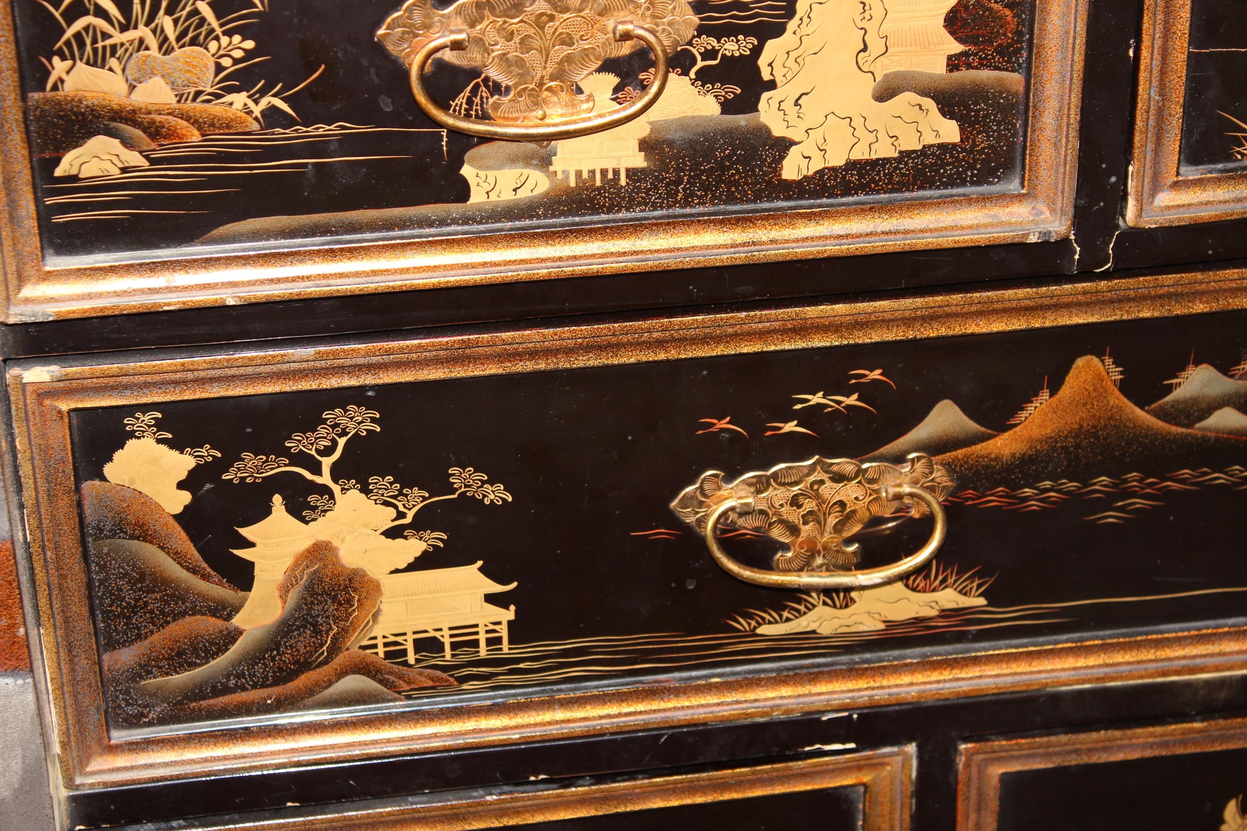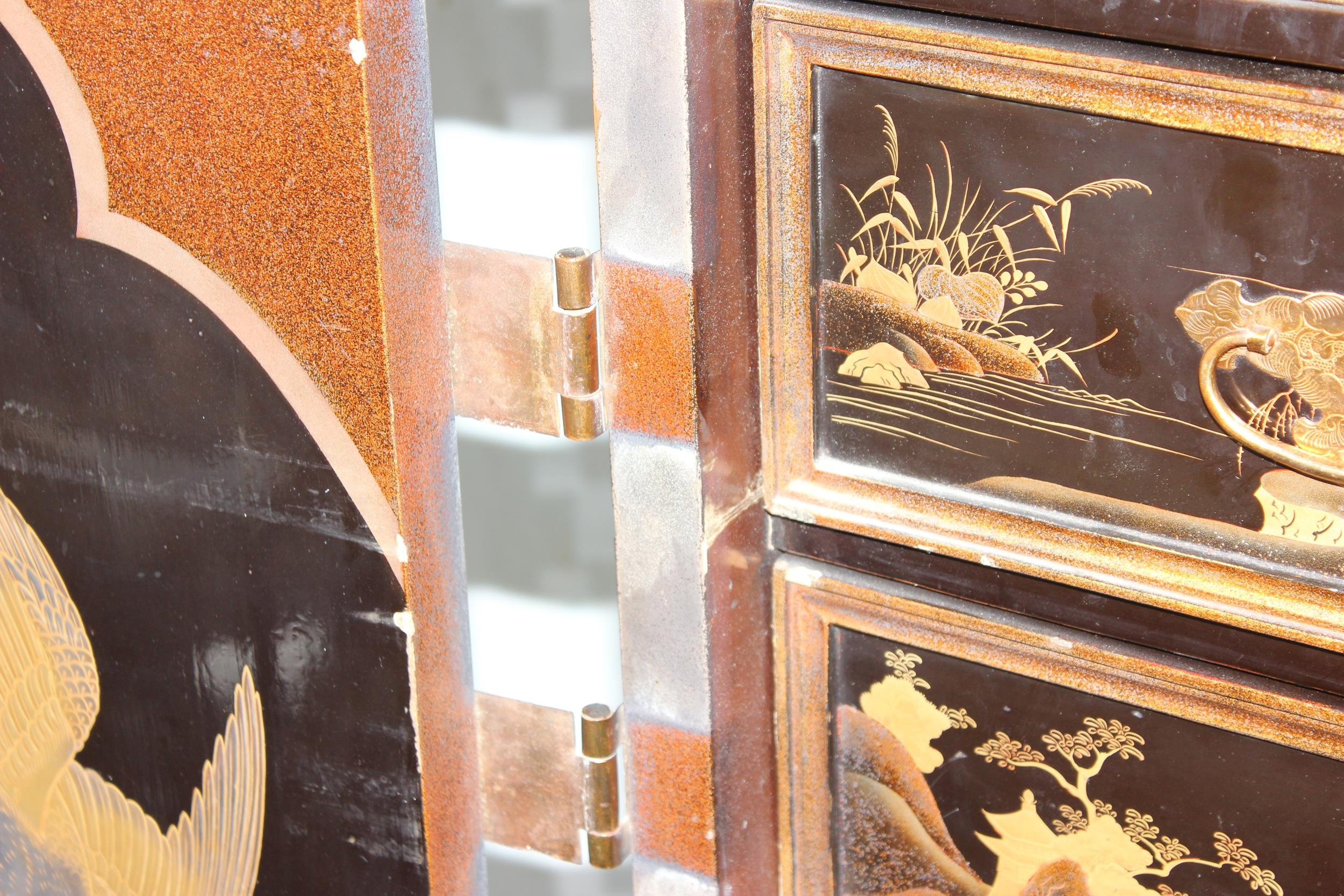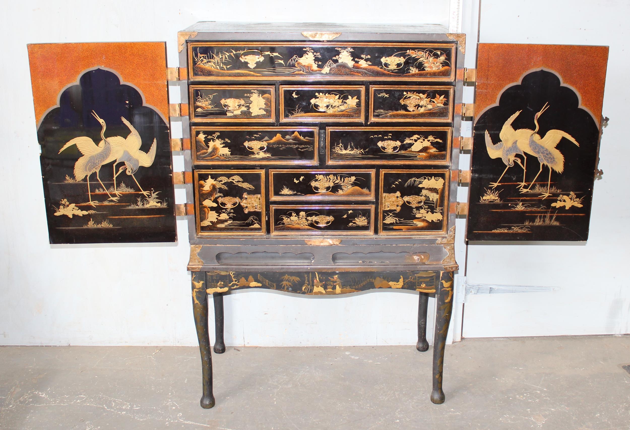 An antique Japanese lacquered cabinet on stand with brass fittings and original key, likely c.1800 or earlier. The cabinet opens to show a bank of various sized lacquered drawers with 2 lower cupboards, all decorated with scenes of Japanese landscapes, flora and fauna, the interior of the doors decorated with cranes. The exterior with a Japanese landscape and mounted with elaborate gilt metal hinges and lockplate, The stand likely English made c.1800