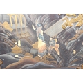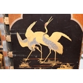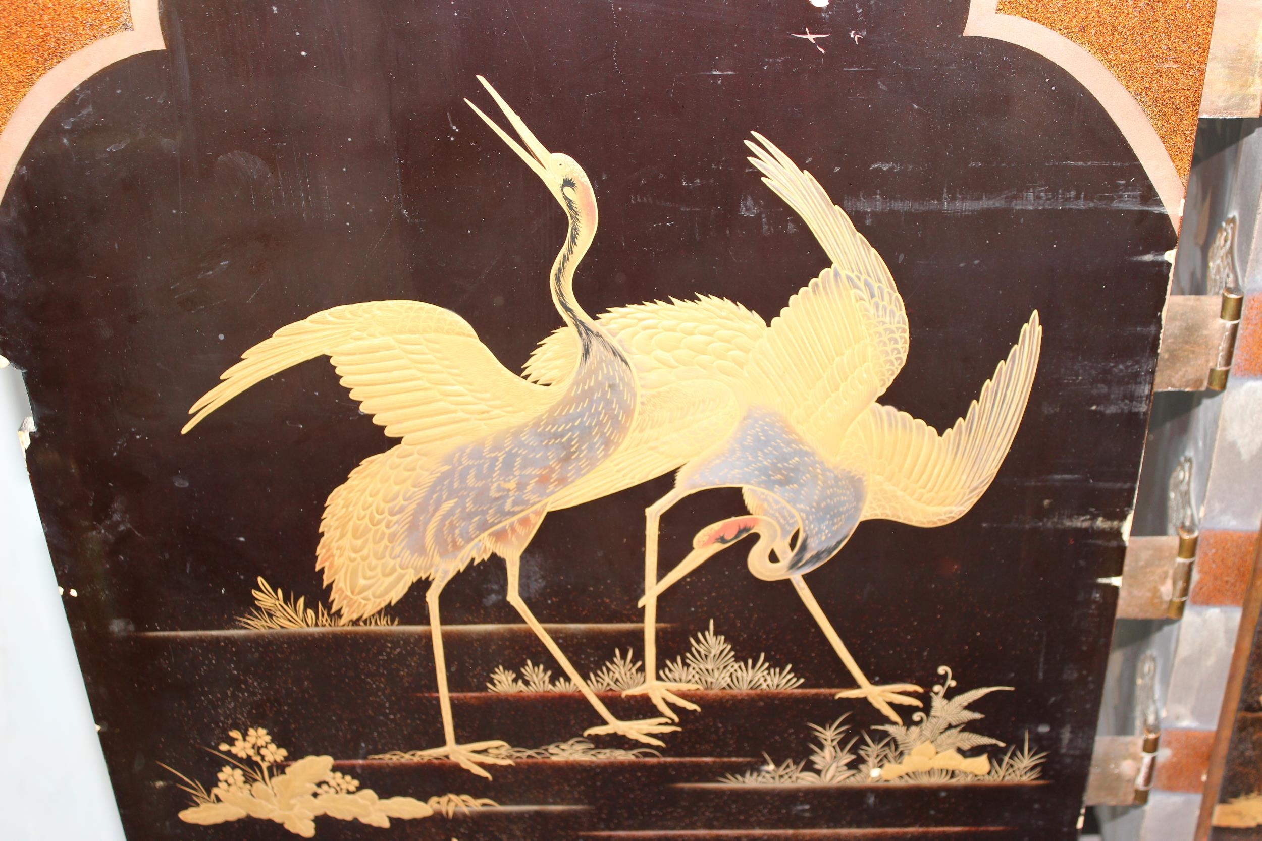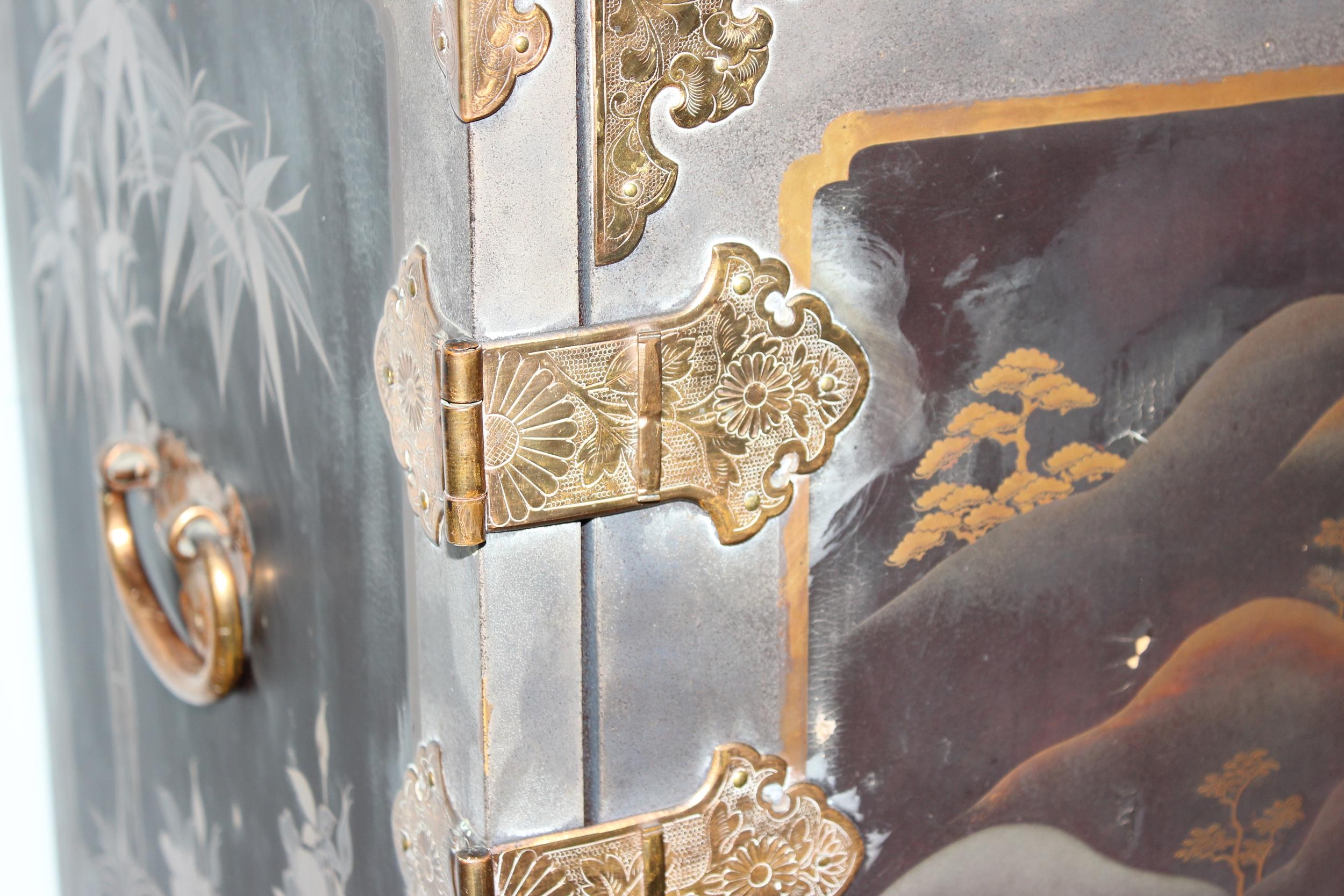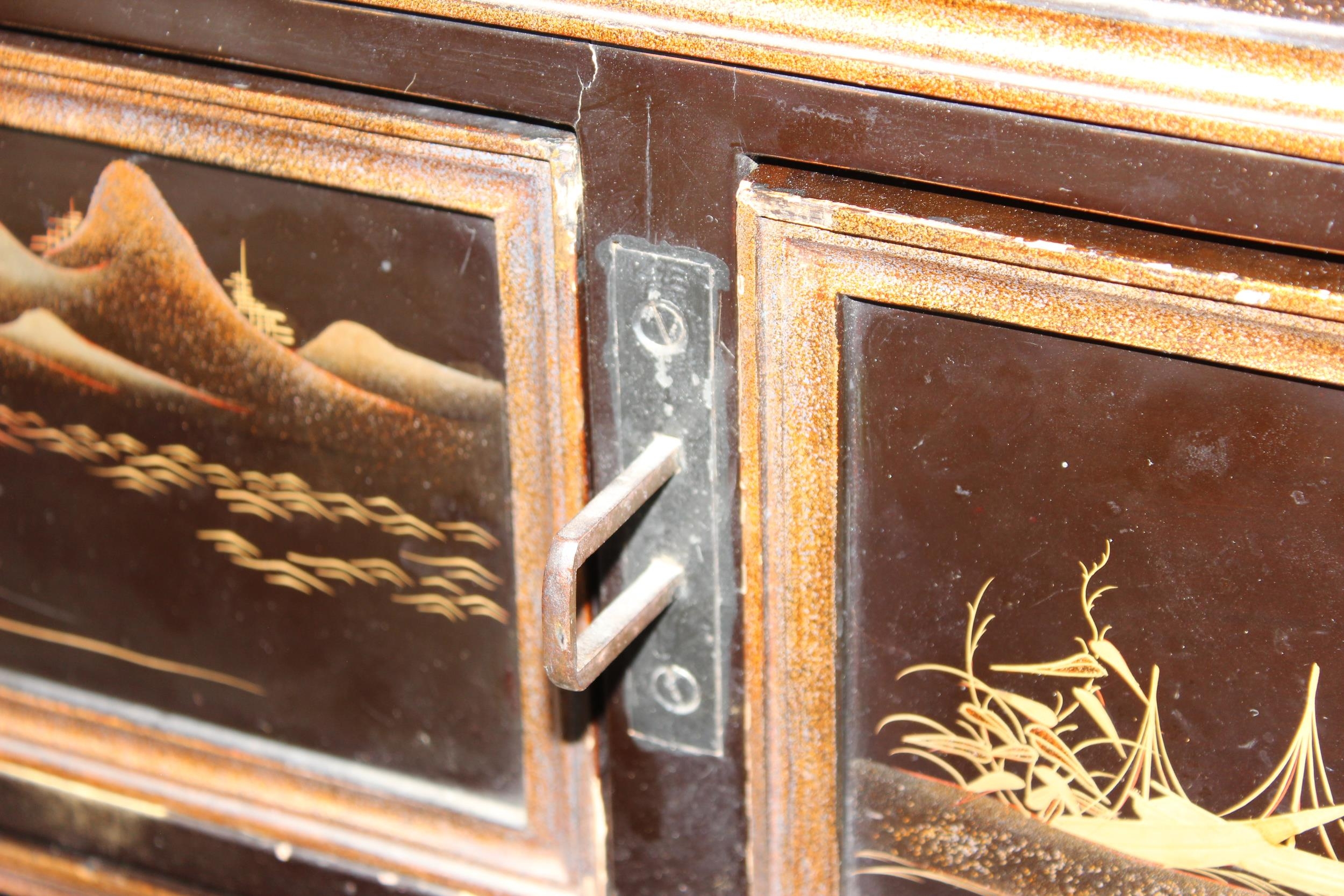 An antique Japanese lacquered cabinet on stand with brass fittings and original key, likely c.1800 or earlier. The cabinet opens to show a bank of various sized lacquered drawers with 2 lower cupboards, all decorated with scenes of Japanese landscapes, flora and fauna, the interior of the doors decorated with cranes. The exterior with a Japanese landscape and mounted with elaborate gilt metal hinges and lockplate, The stand likely English made c.1800