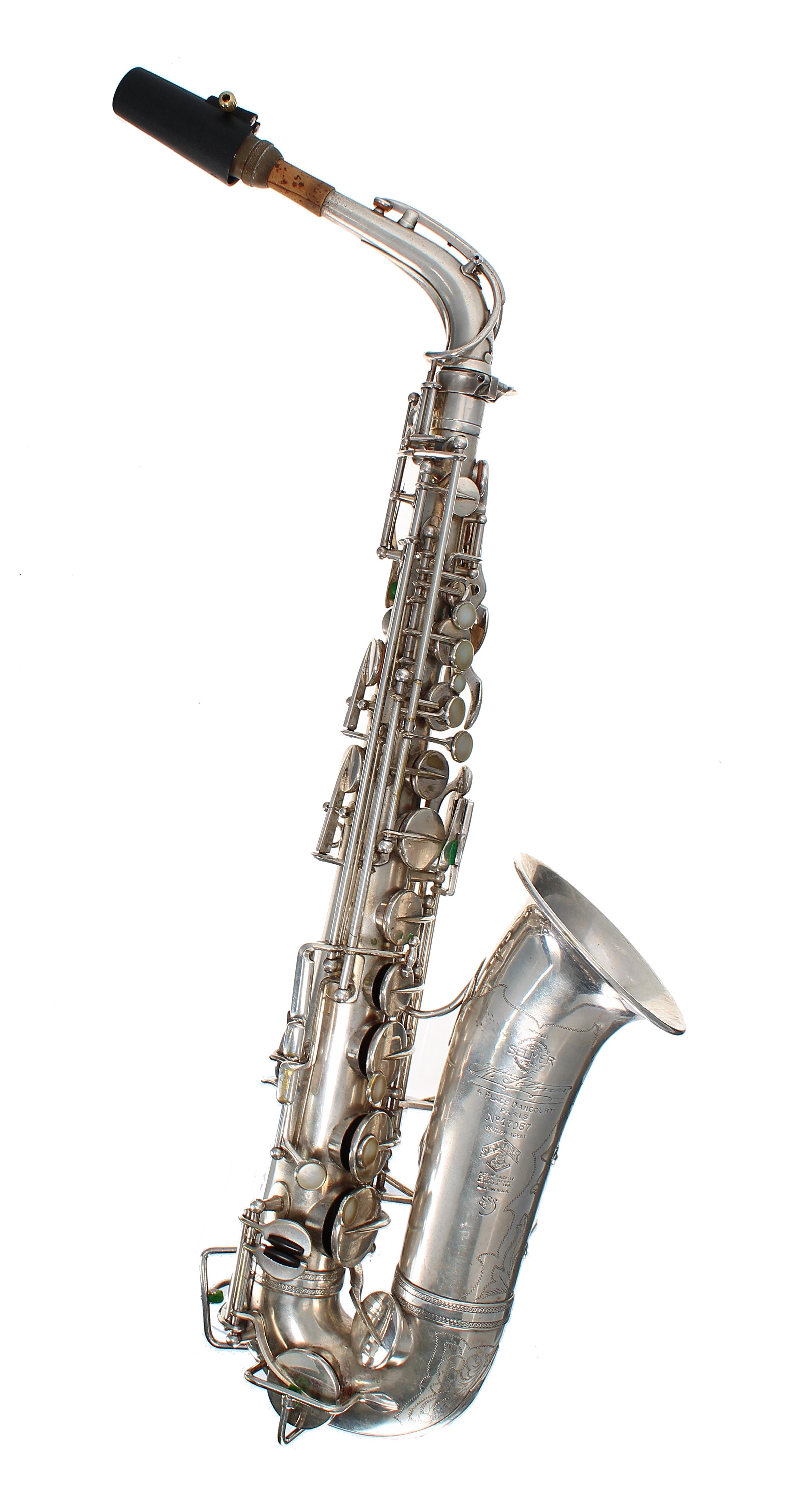 Selmer cigar cutter alto saxophone, silver plate, ser. no 17087, circa 1932, with Selmer Soloist D mouthpiece with cap and ligature, case