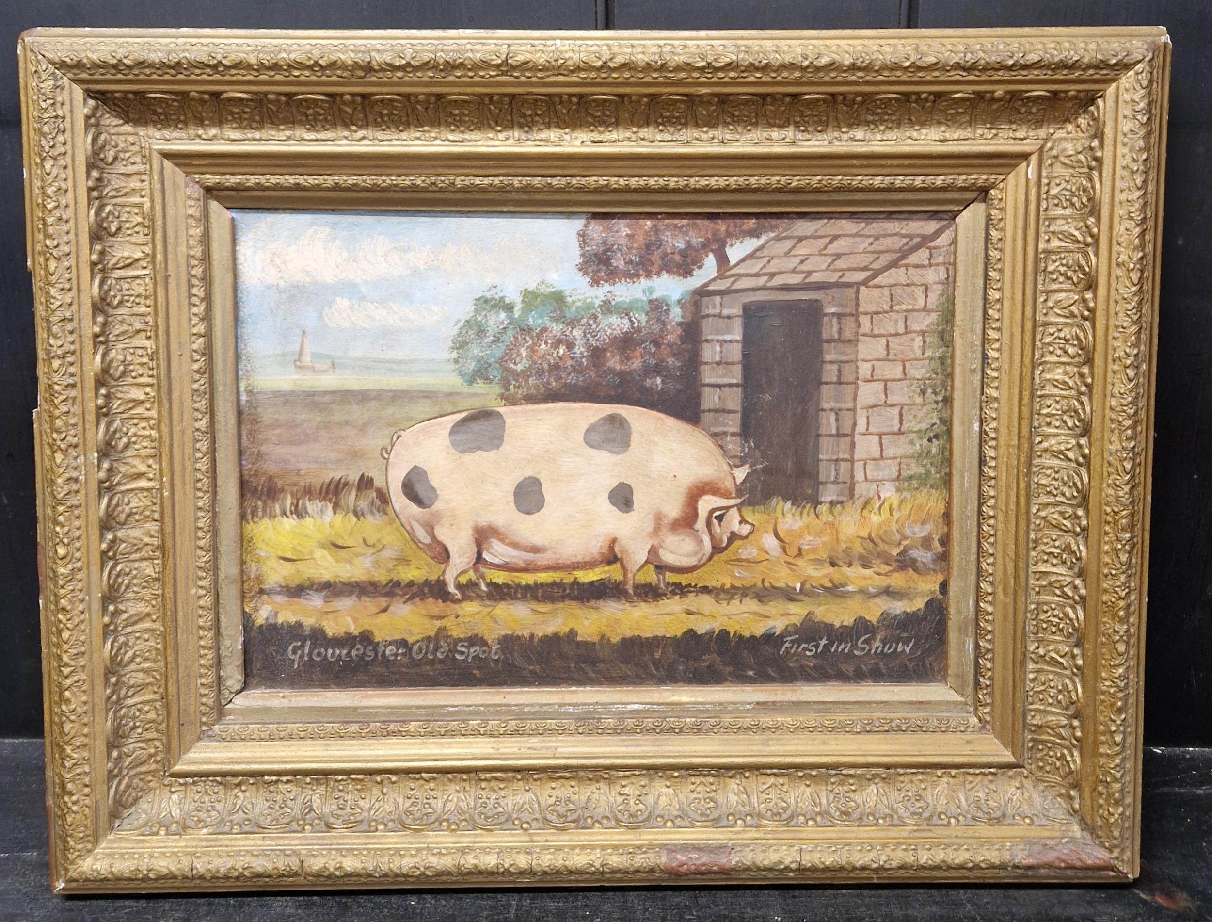 ENGLISH SCHOOL, A late twentieth century oil painting of a prize pig titled 'A Gloucester Spot'. qty (R6).