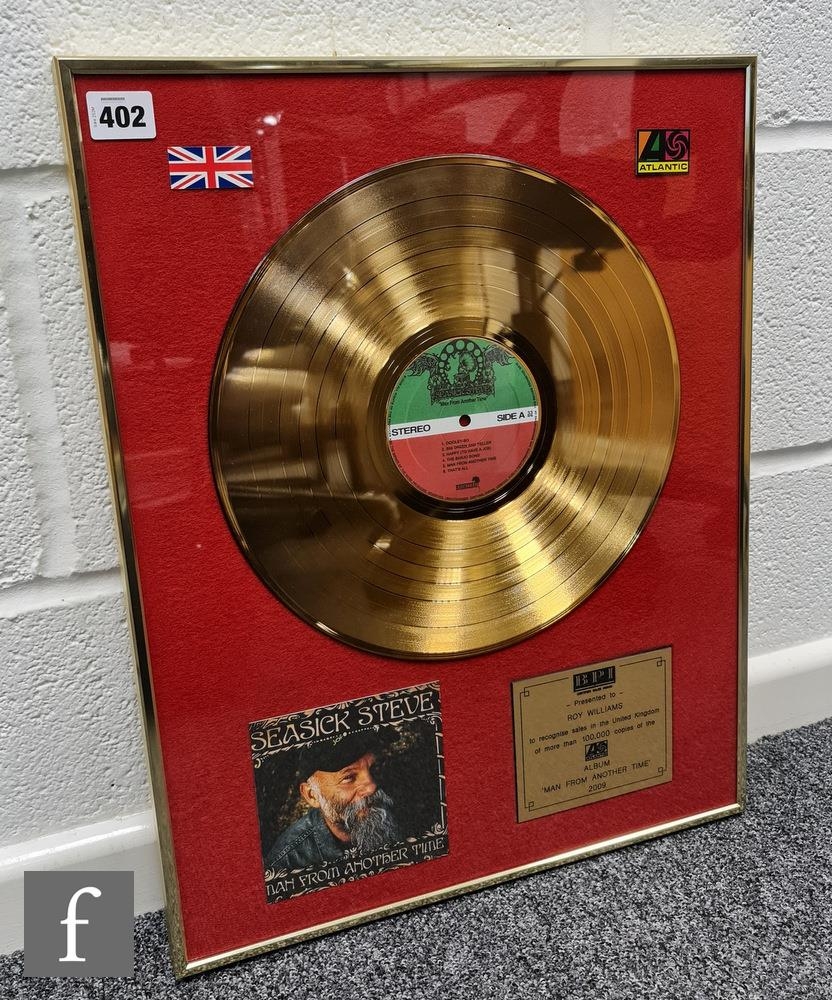 A Seasick Steve gold disc montage commemorating the 100,000 sales of the Man From Another Time album, with plaque dedicated to Roy Williams, 2009.