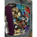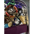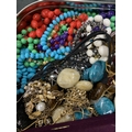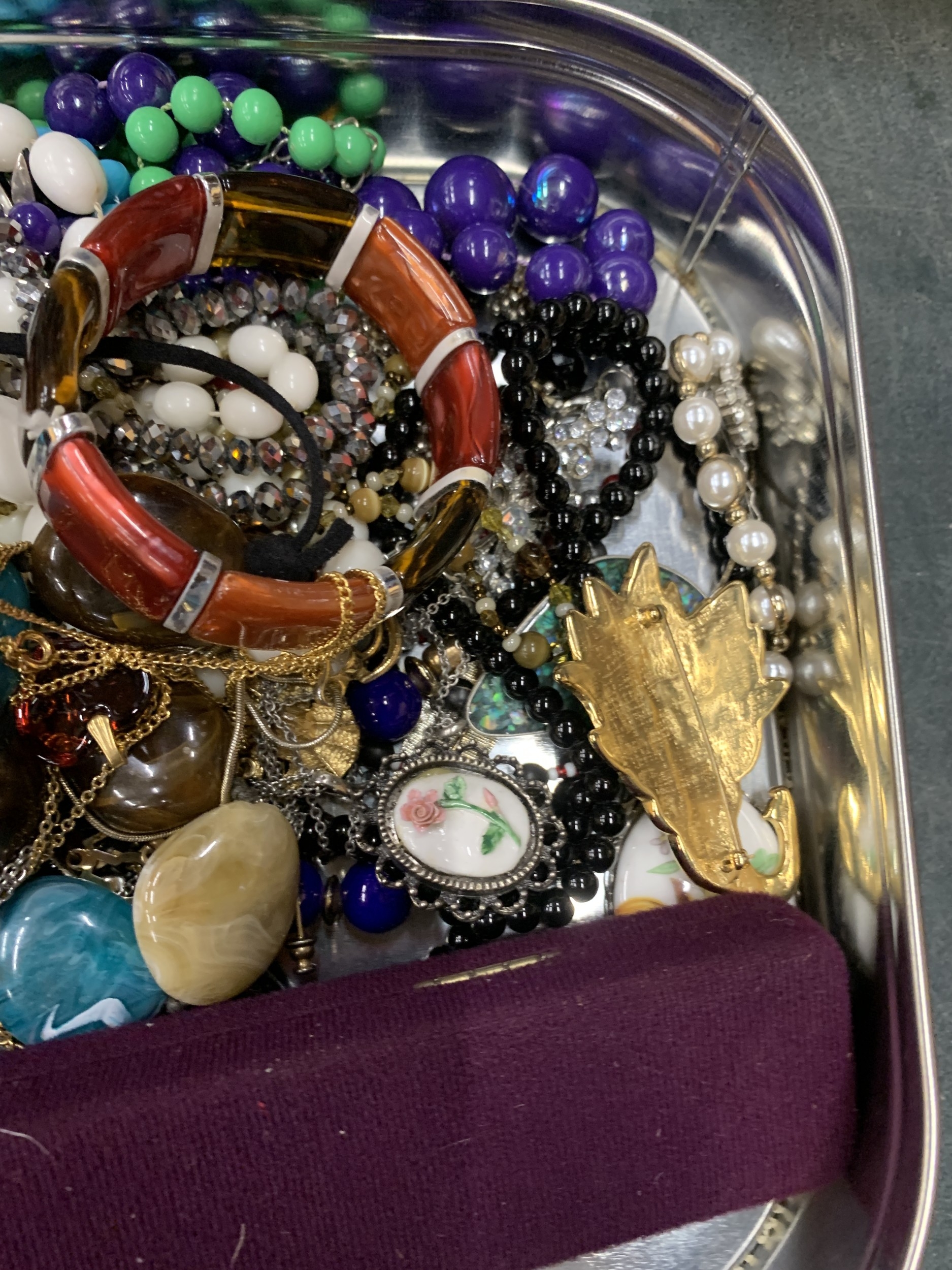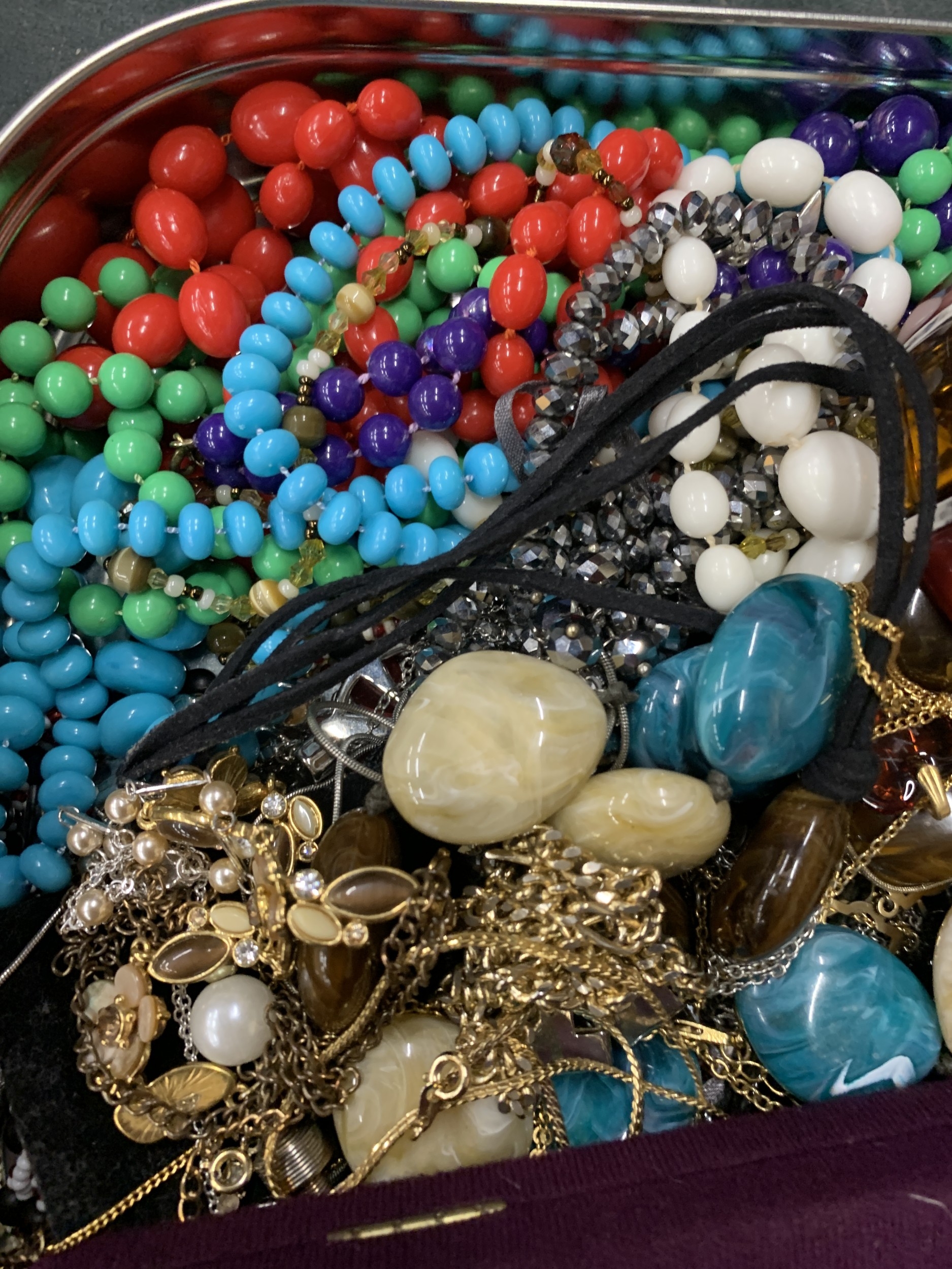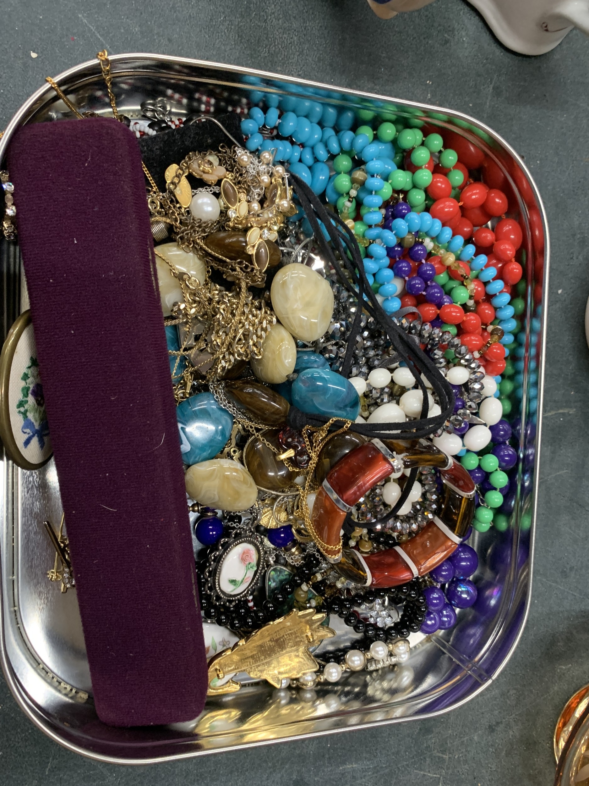 A QUANTITY OF COSTUME JEWELLERY TO INCLUDE CHAINS WITH PENDANTS, BEADS, BRACELETS, BROOCHES, ETC