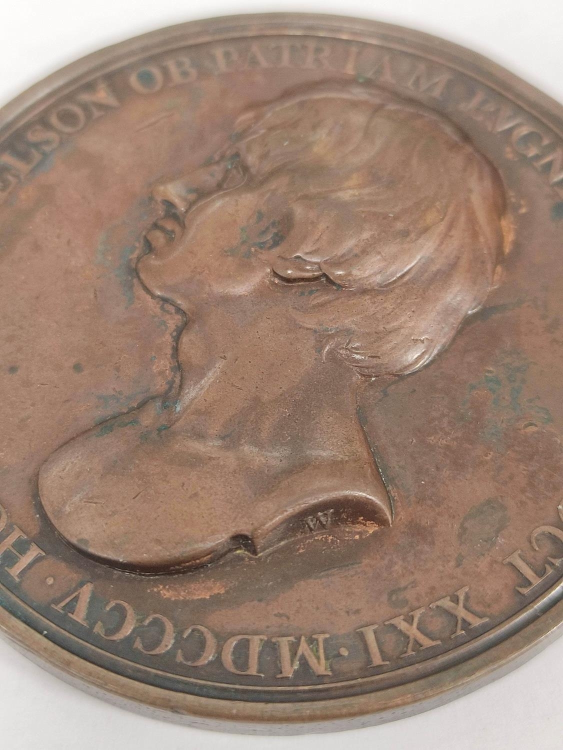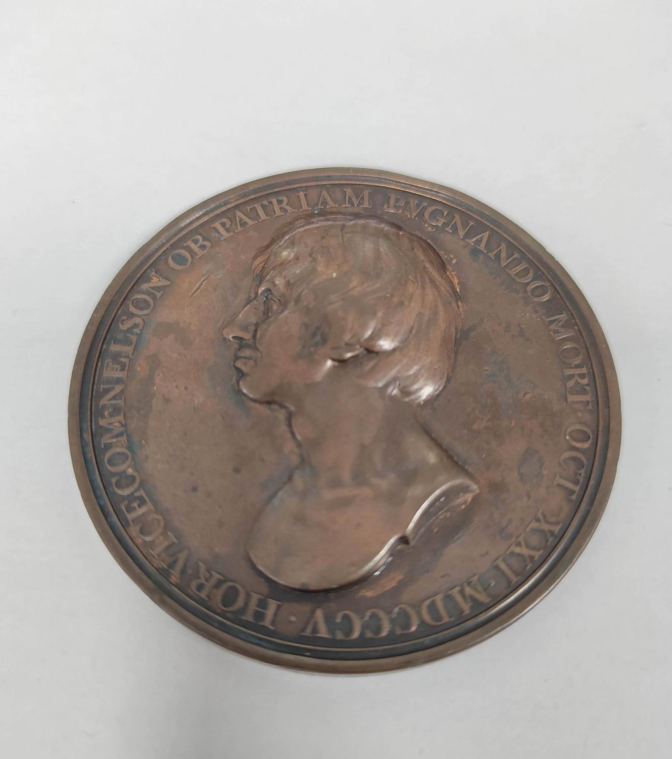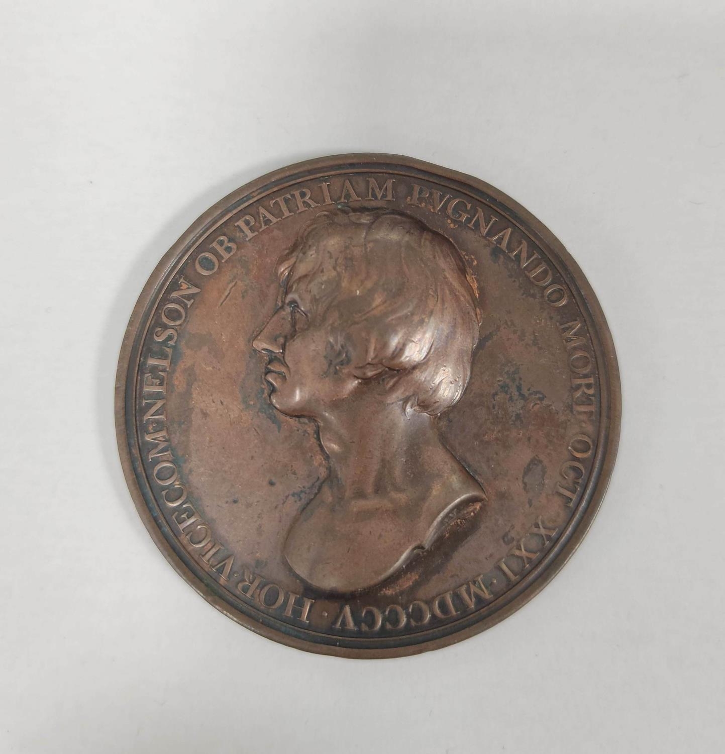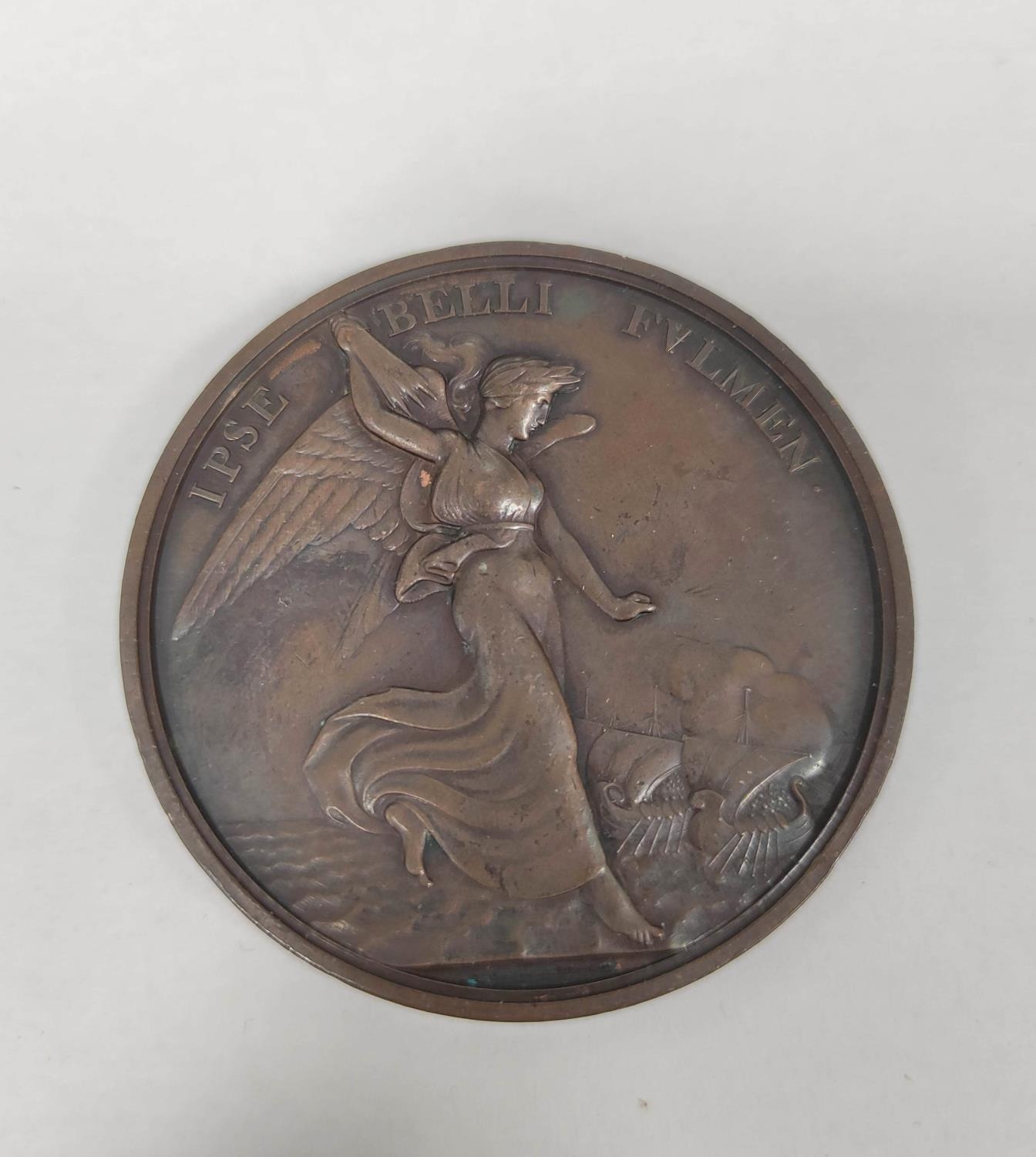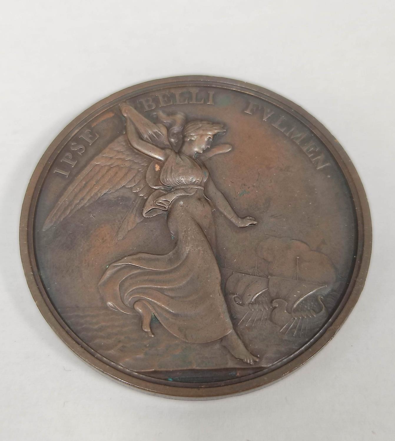 Great Britain. 1805 Horatio, Admiral Lord Nelson, Death at the Battle of Trafalgar copper medal, by Thomas Webb. Obv bare head of Nelson facing left / rev. IPSE BELLI FVLMEN, Bellona, thunderbolts in hand, approaches war galleys. Diameter 53.5mm. After a design by John Flaxman.