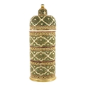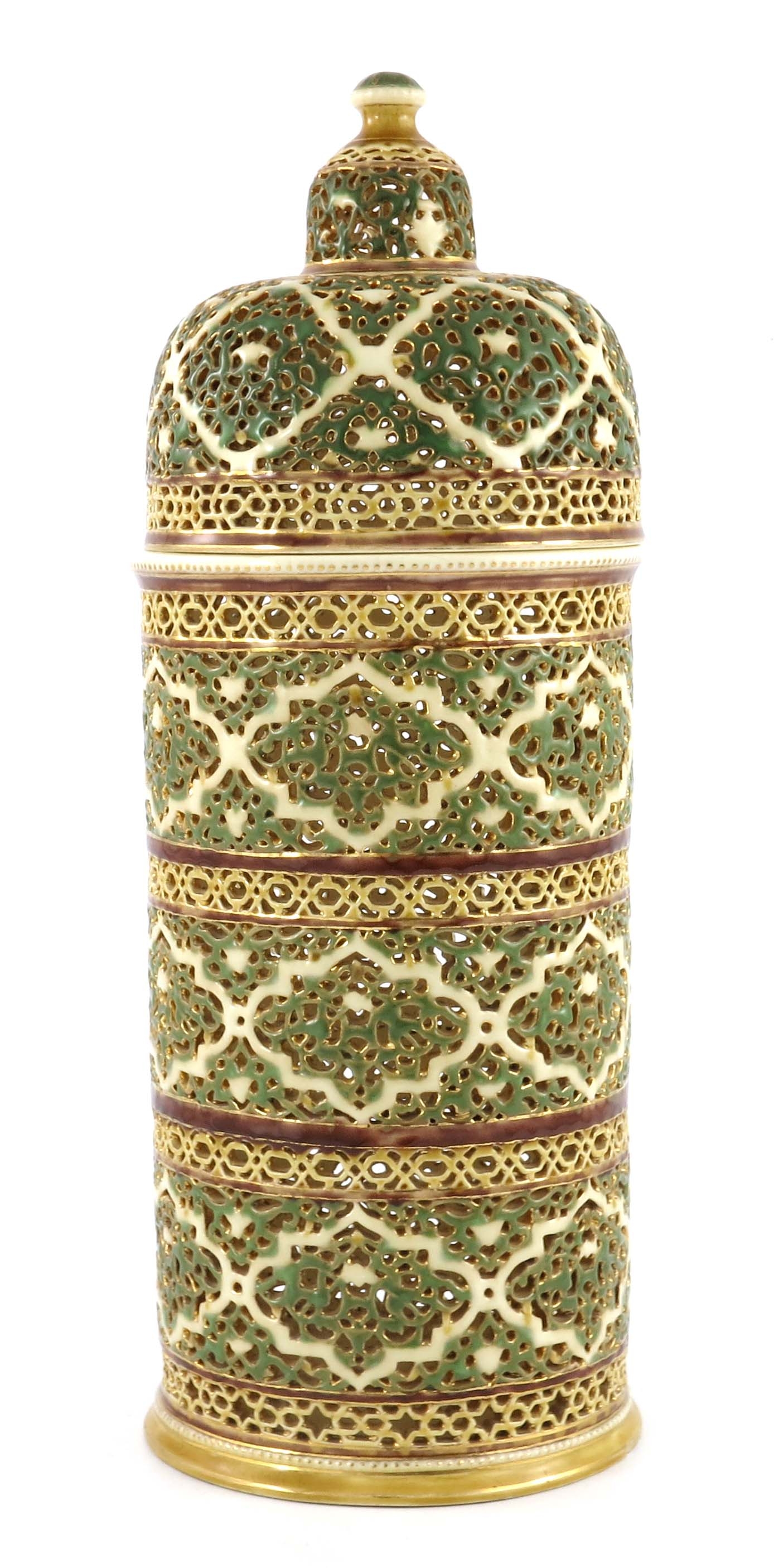 Zsolnay, Pecs, a large Hungarian reticulated vase and cover, cylindrical form with domed lid, pierced with bands of knotted foliate scroll cartocuhes and geometric borders, highlighted in gilt, impressed and painted marks , 39.5cm high