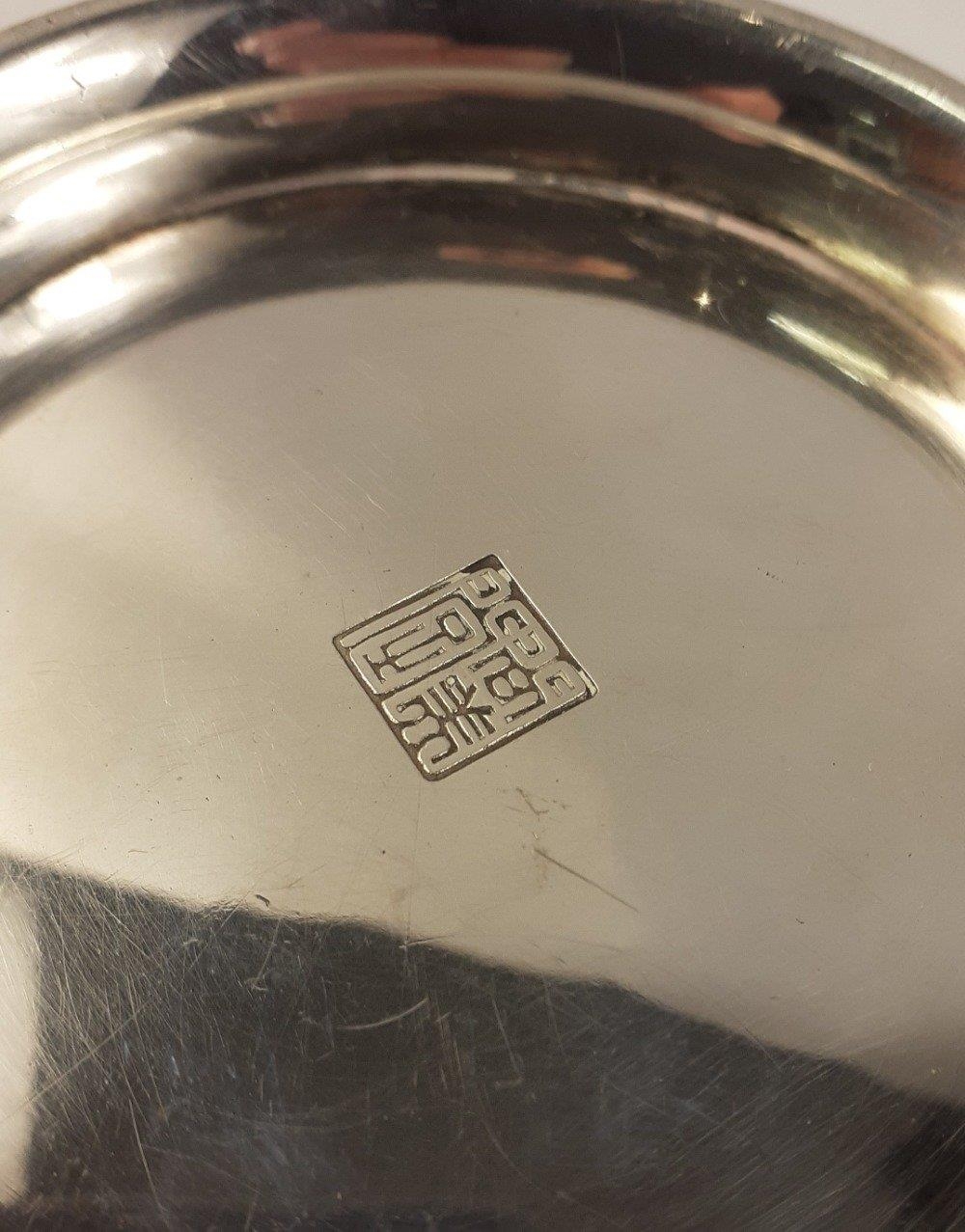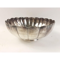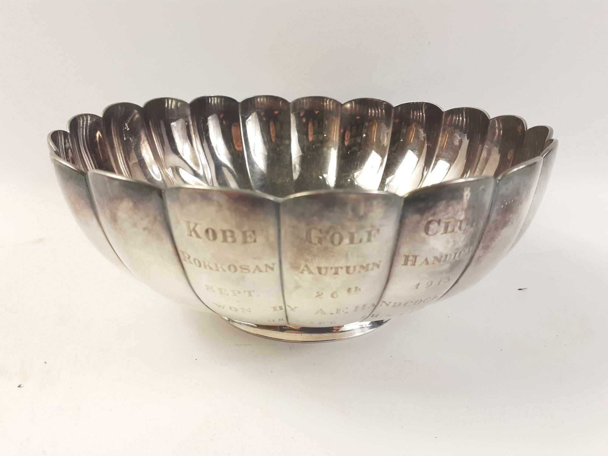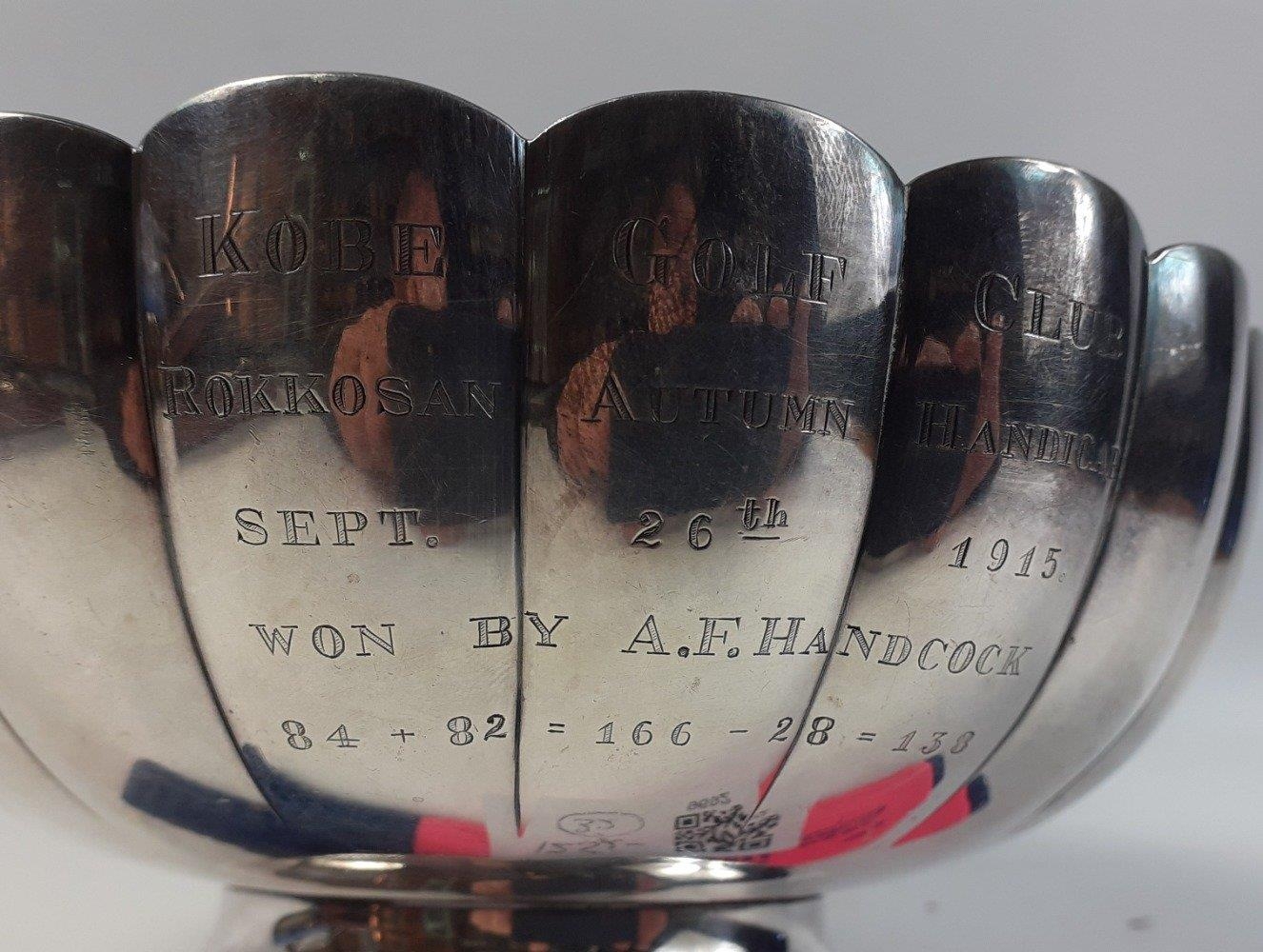 A white metal trophy with scalloped edges (17cm diameter), presented by the Kobe Golf Club, Japan to AF Handcock in 1915, weight 358g