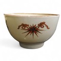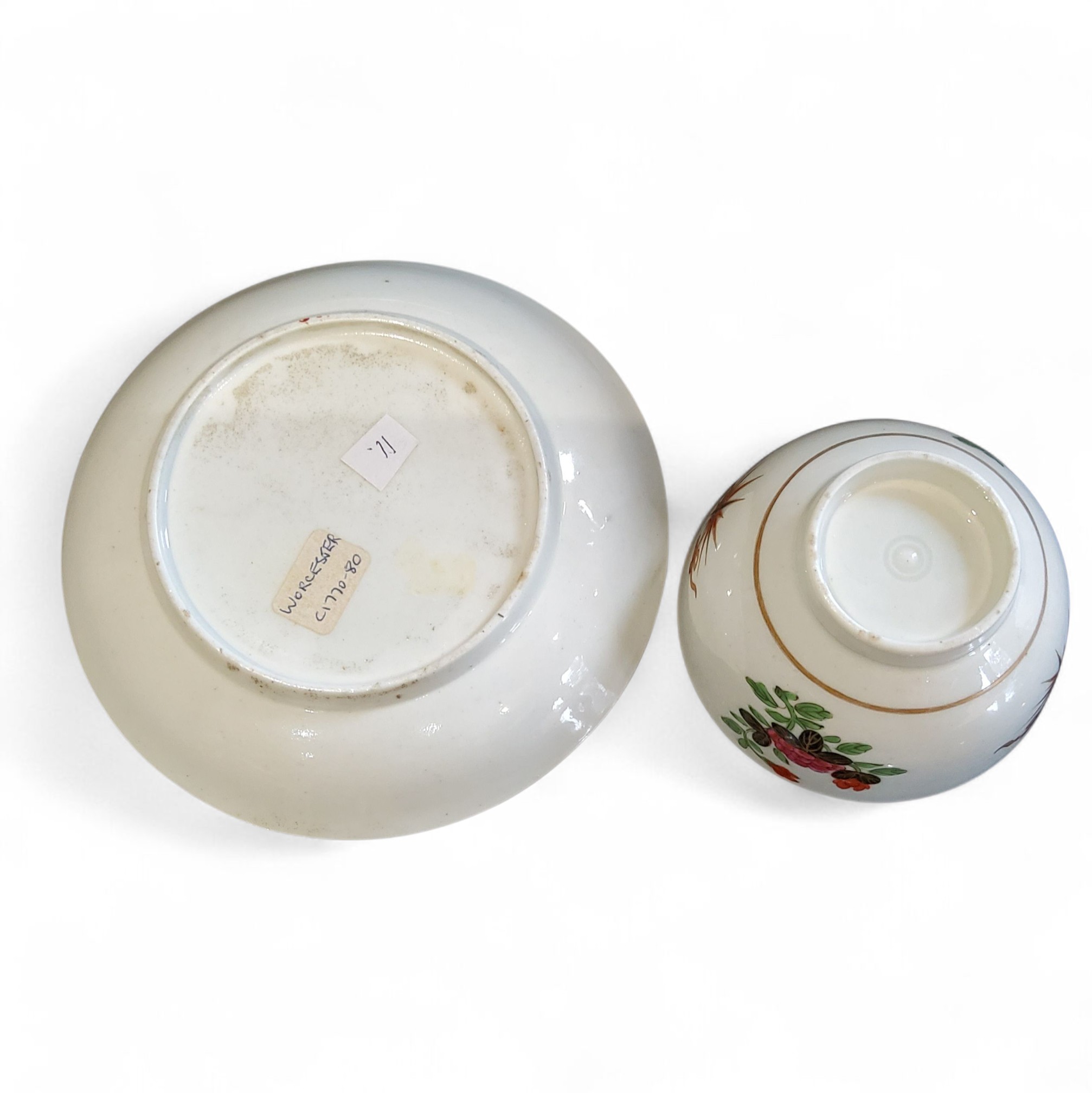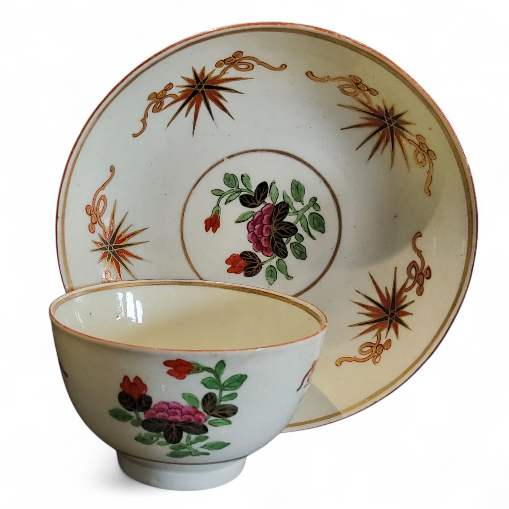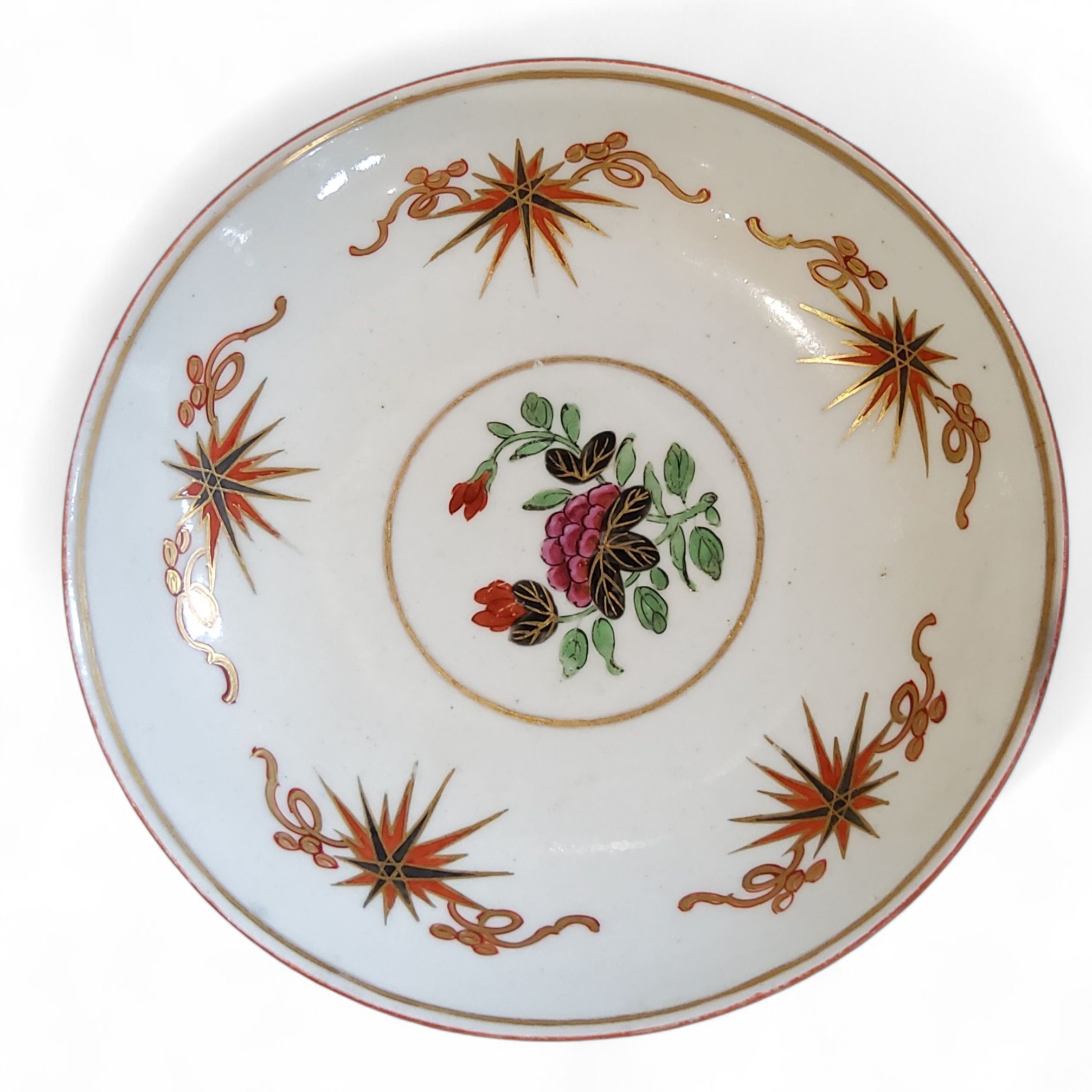 A Worcester Thunder and Lightening pattern tea bowl and saucer, painted with stylised floral stem divided by star bursts and bolts of lightening, in iron-red, blue and gilt, gilt line borders, unmarked, c.1770