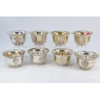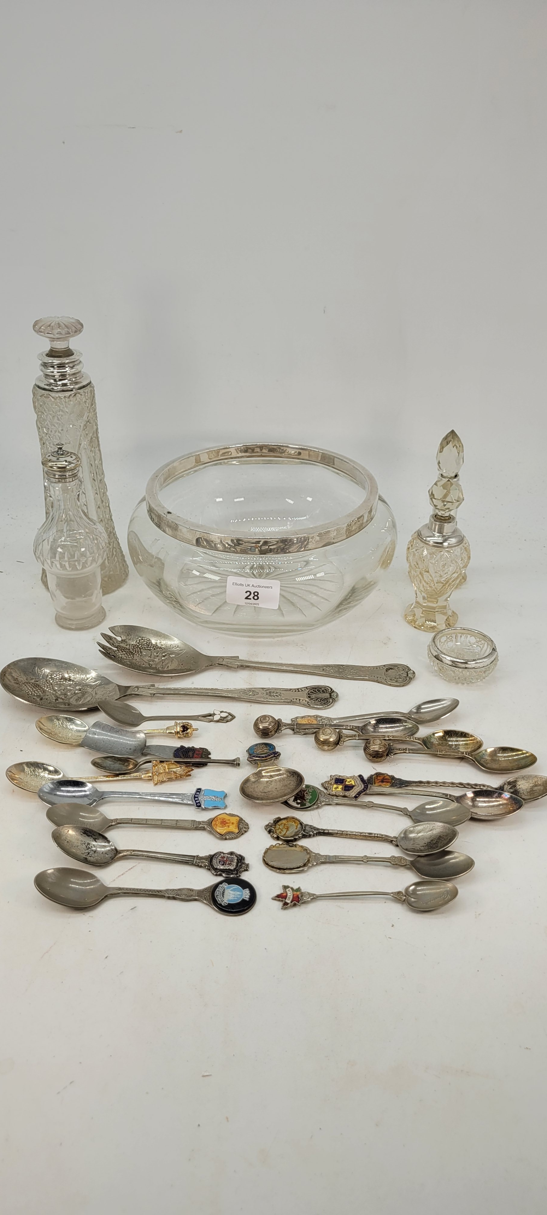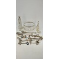 Quantity of silver and silver plated items to include Silver rimmed glass bowl, silver collared glass scent bottle, silver topped condiments, assortment of souvenir spoons etc