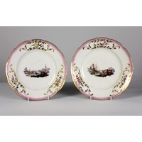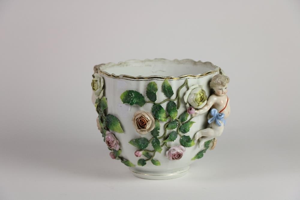 A 19th Century Sitzendorf porcelain flower encrusted Bowl, applied with two cherubs and scrolling foliage, 20cms h x 26cms w (8" x 16"). (1)