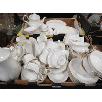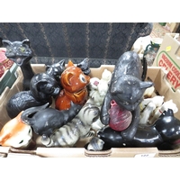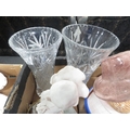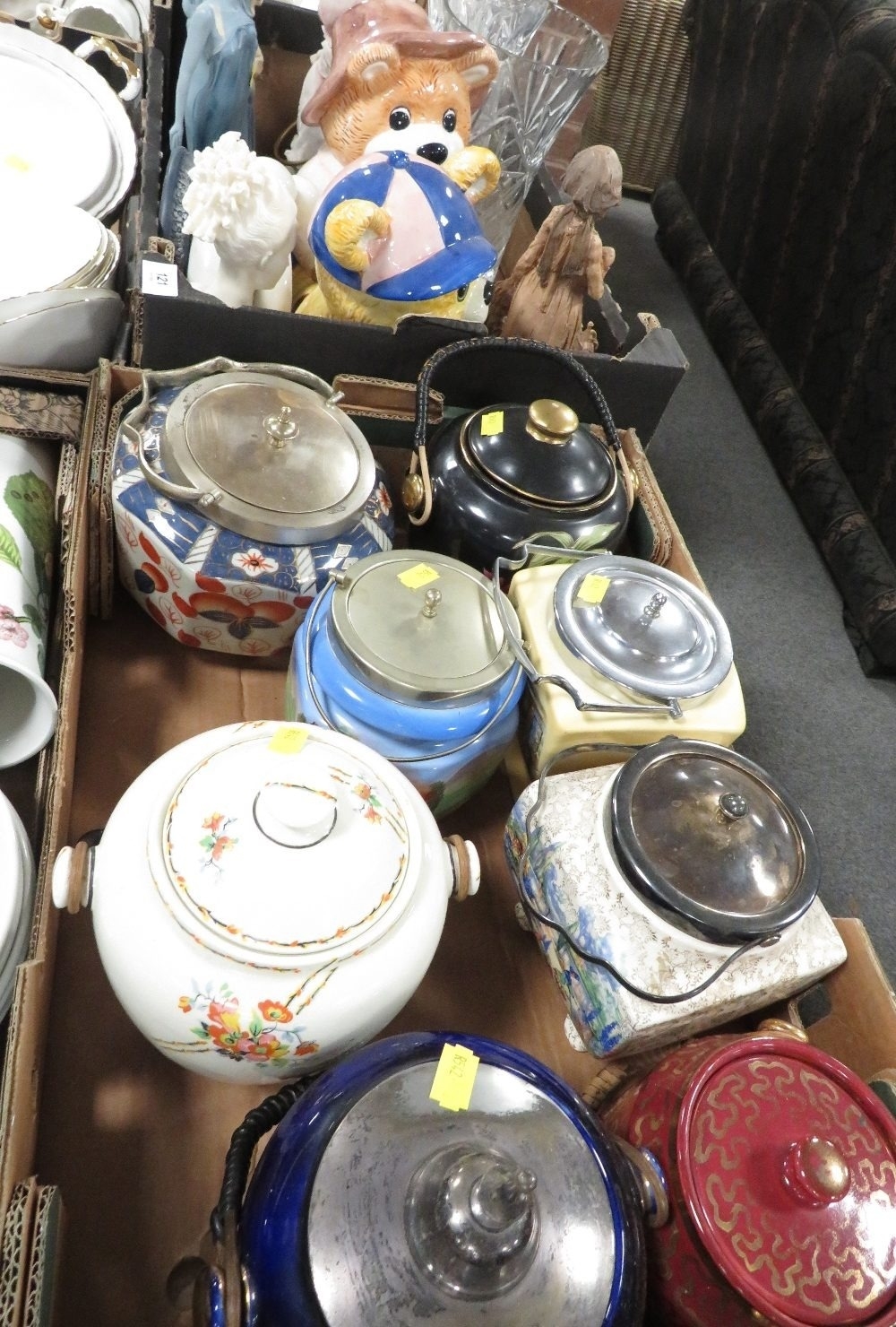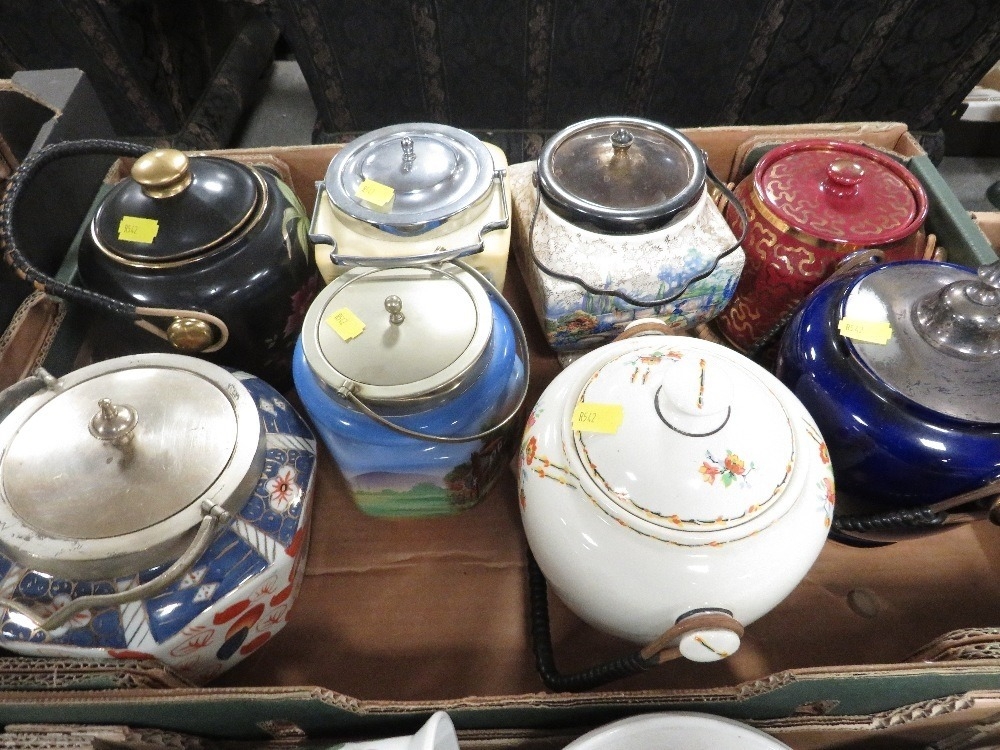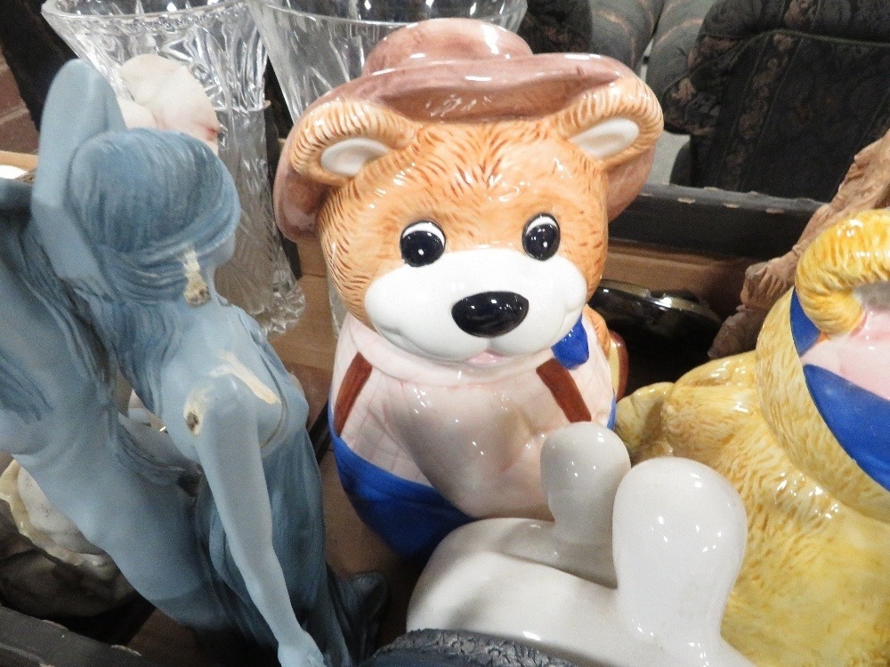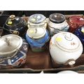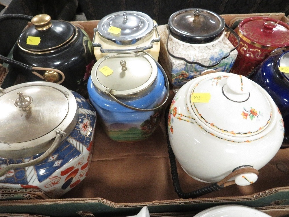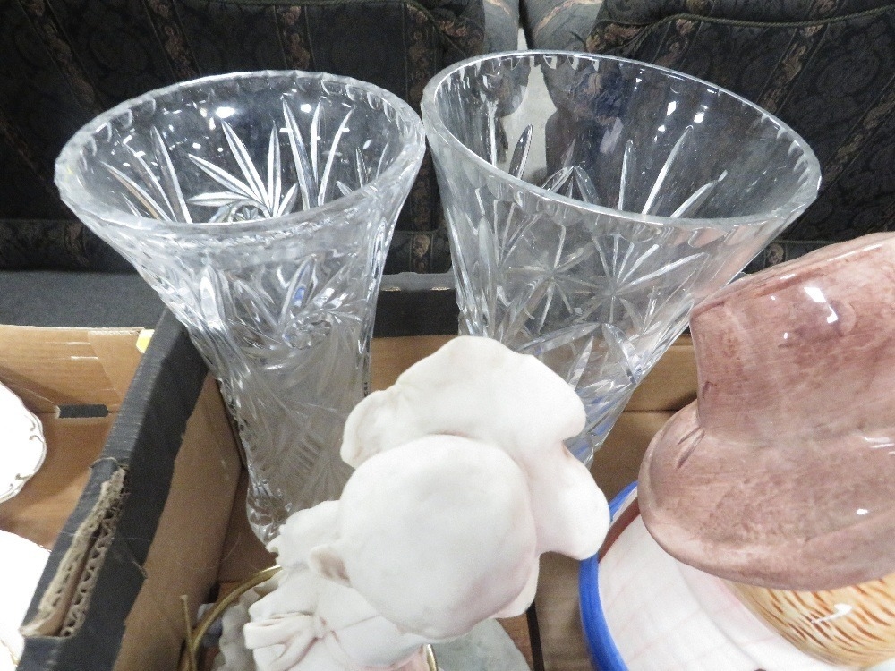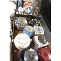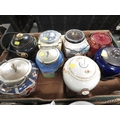Two trays of assorted ceramics and glass to include cracker barrels