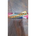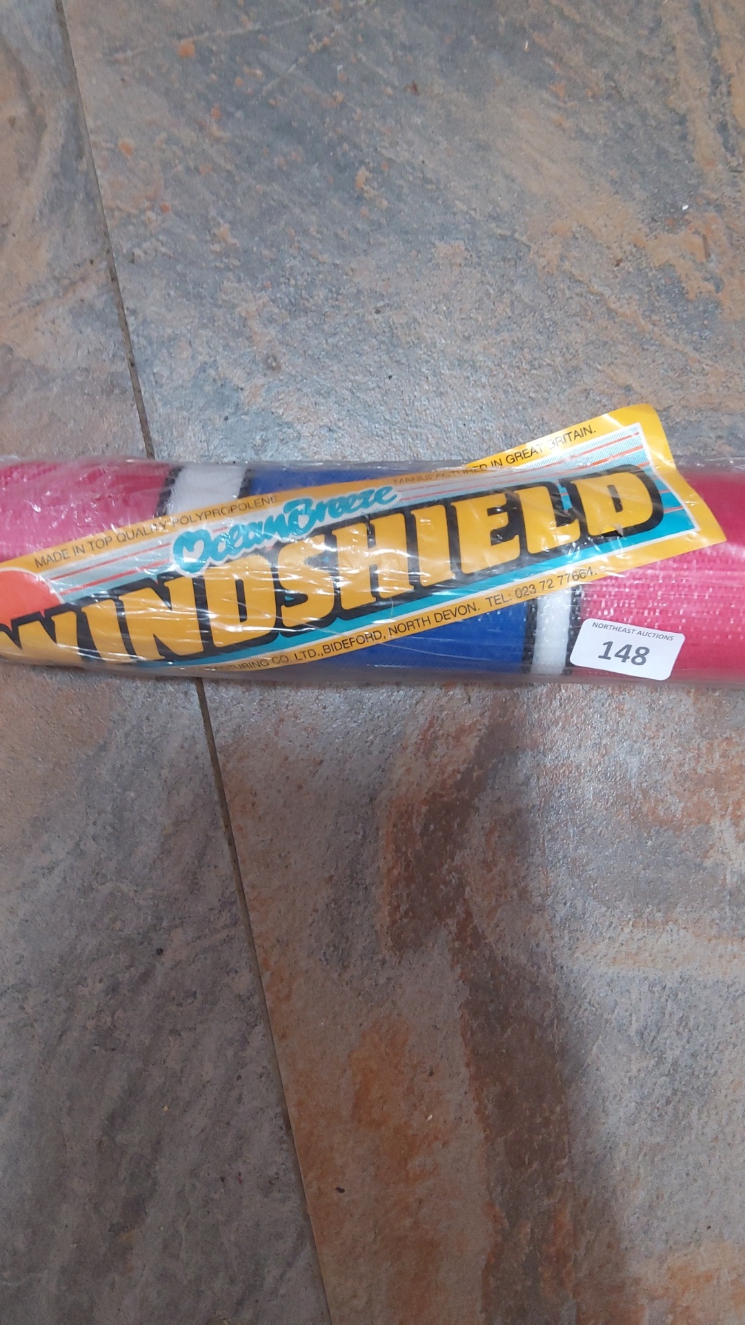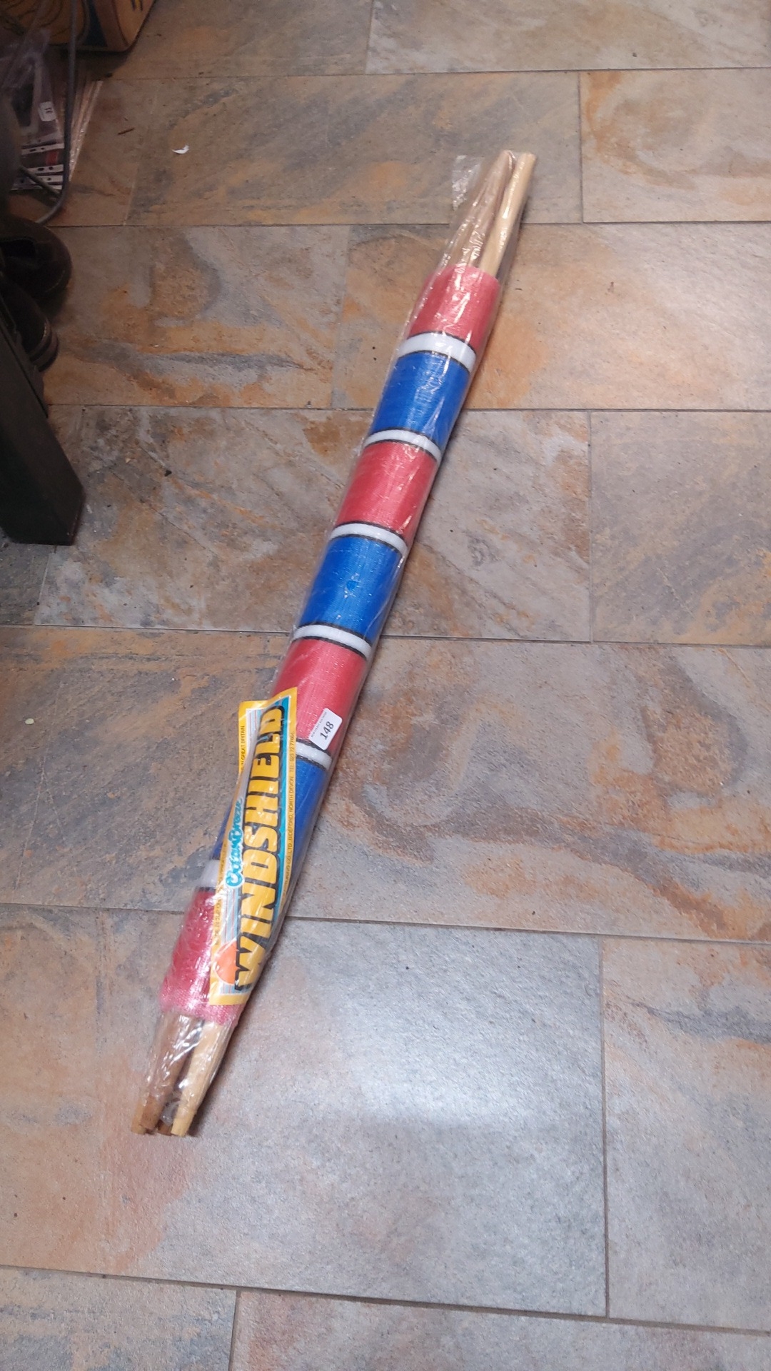 Ocean Breeze beach windbreaker—red and blue striped polypropylene windbreak, in original plastic sleeve, with wooden support poles.