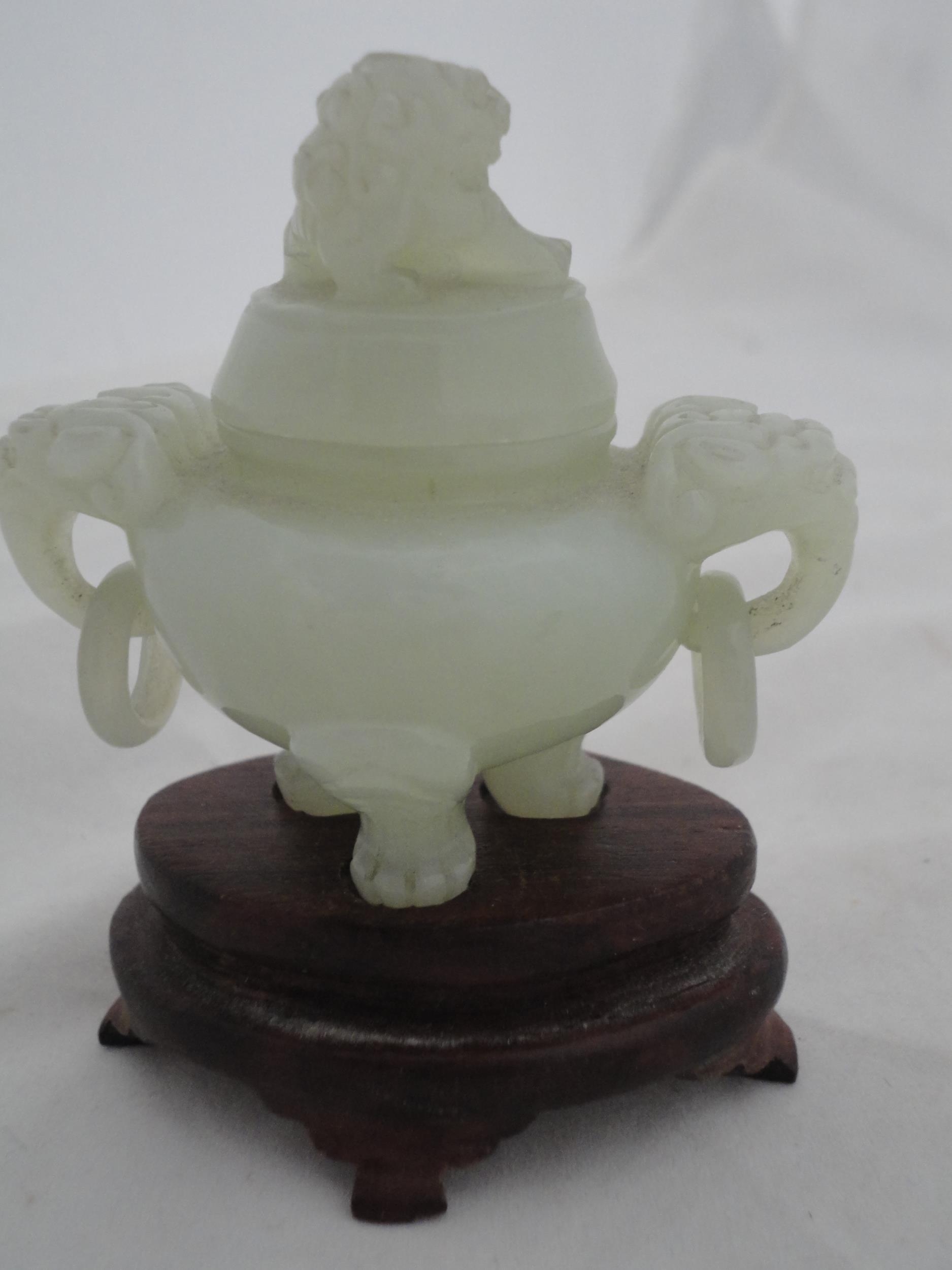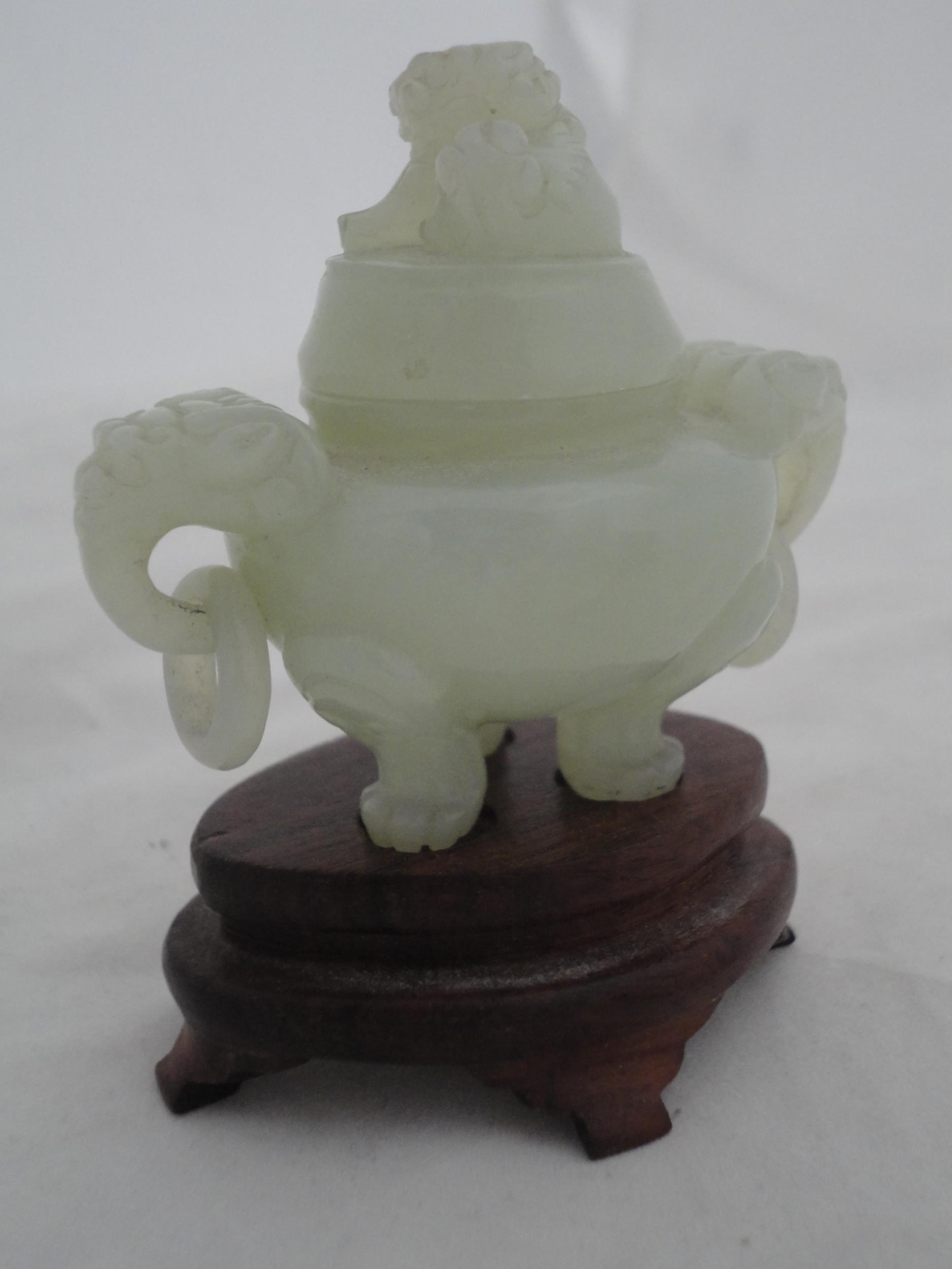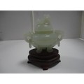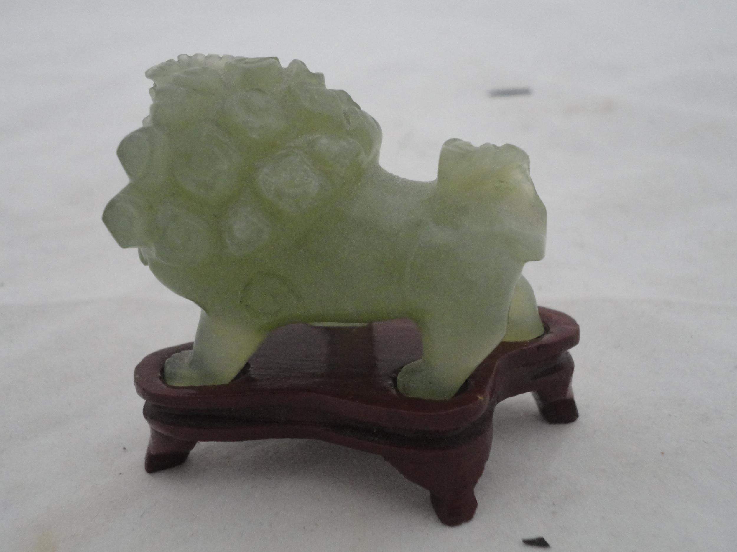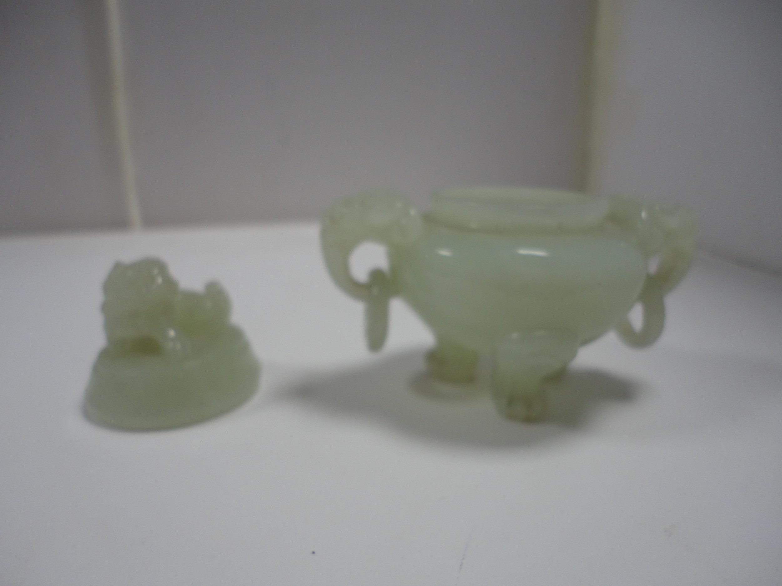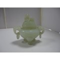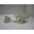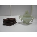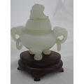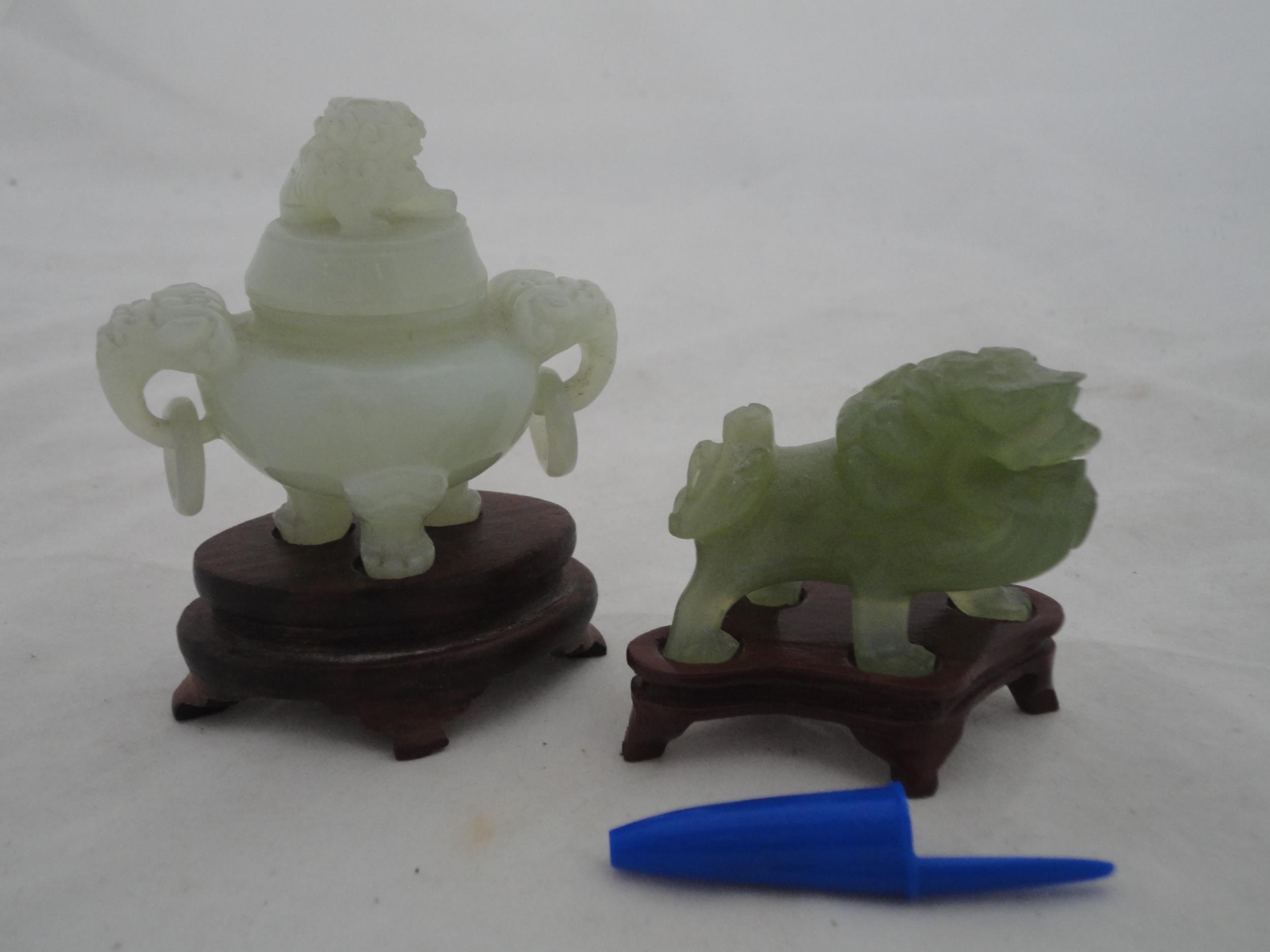 Small Chinese-style jade-coloured censer and cover on stand, and a similar jade-coloured temple dog. (2)