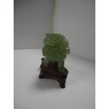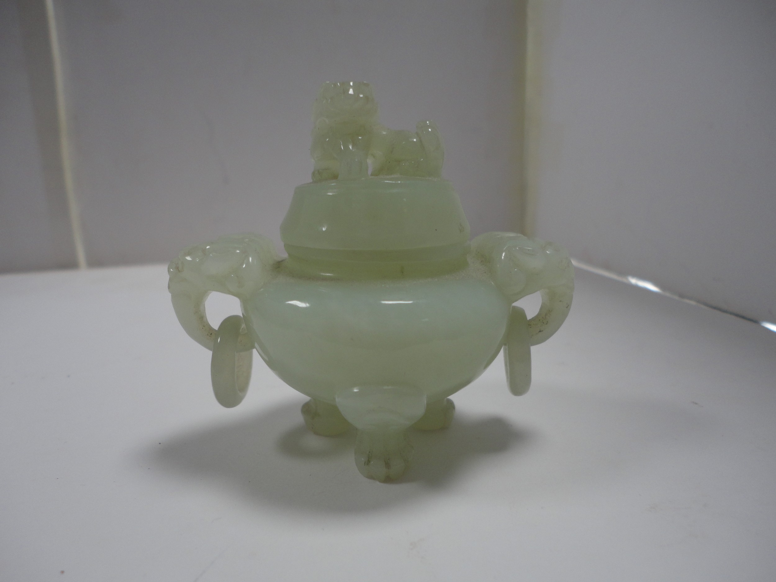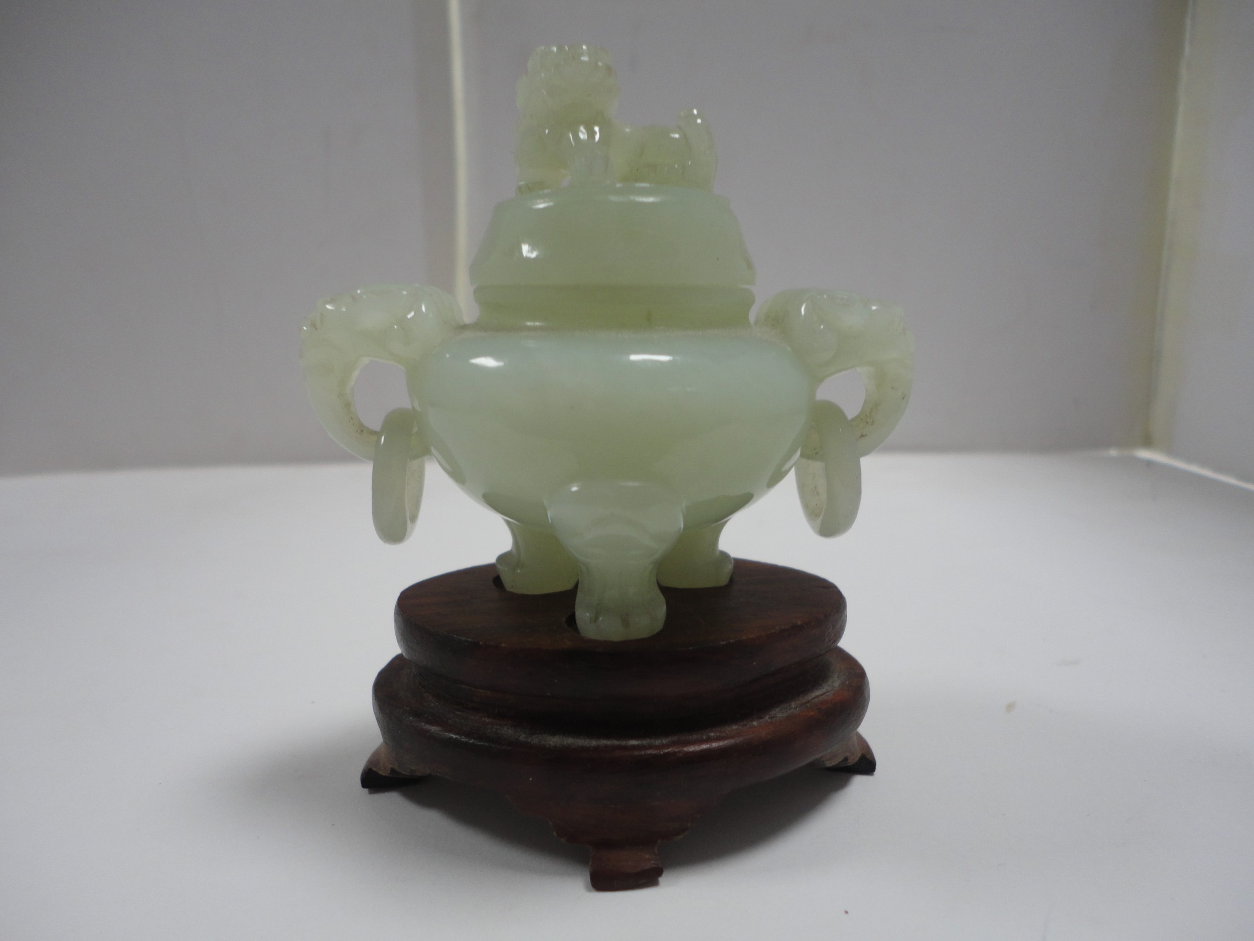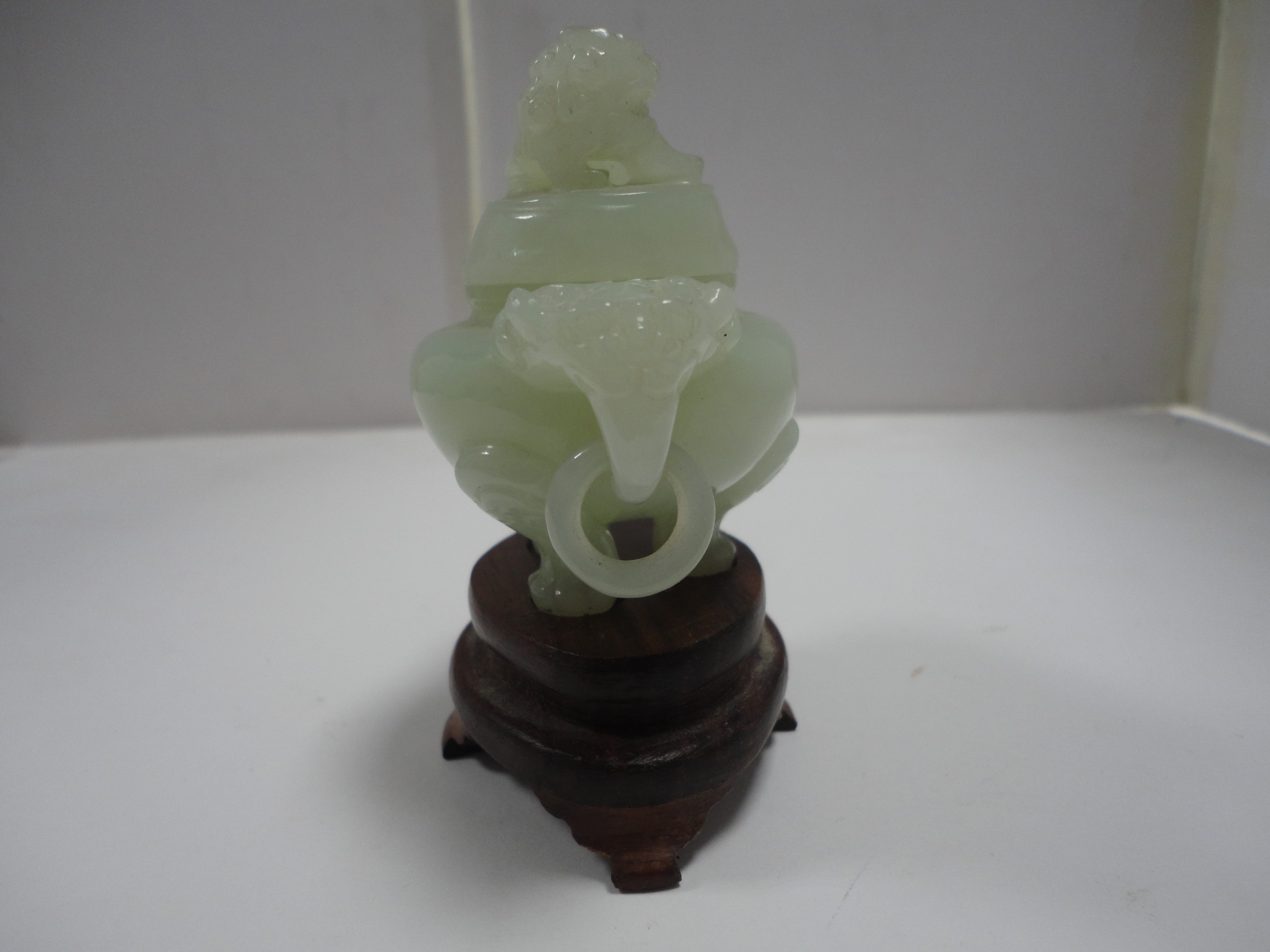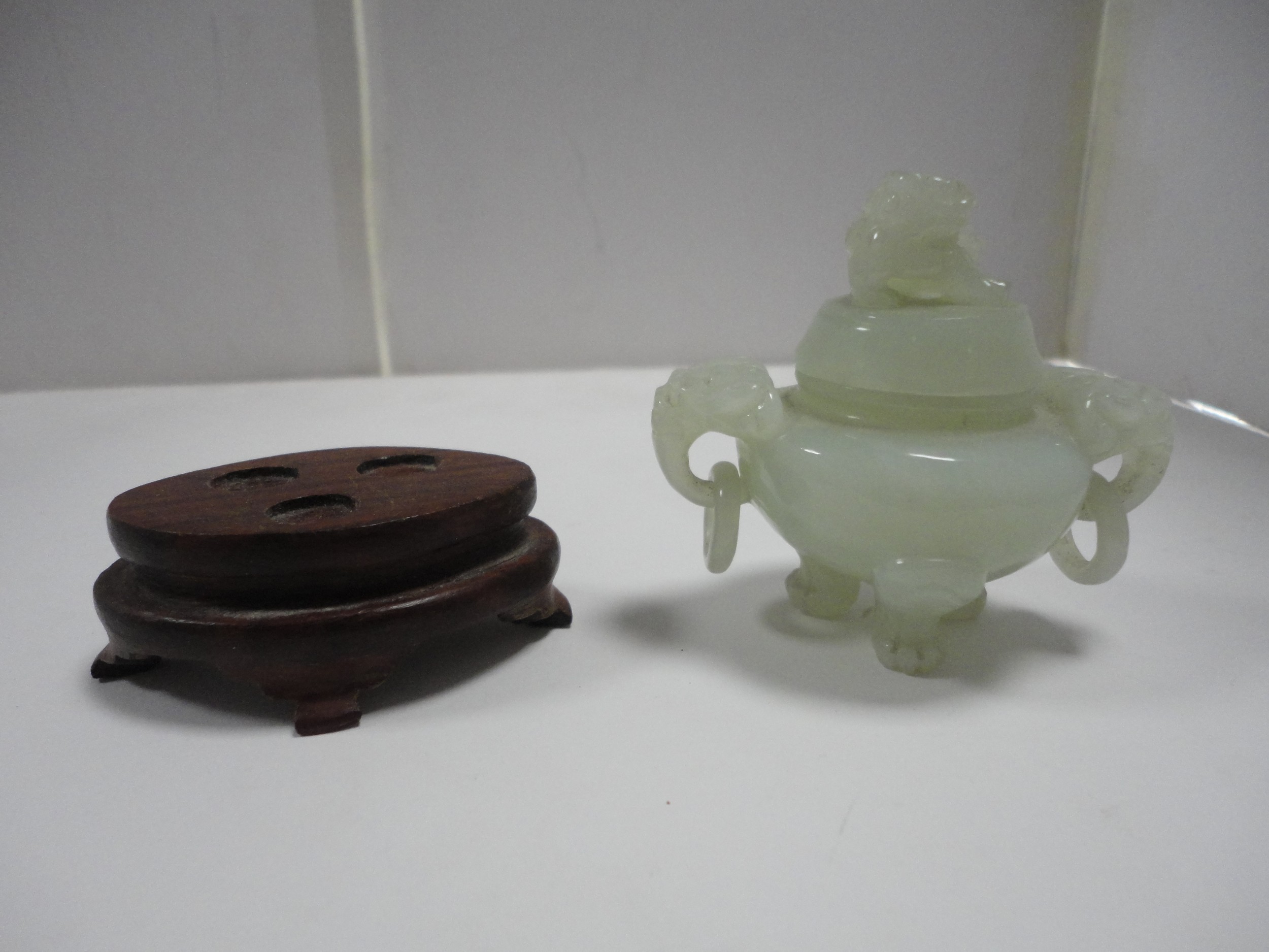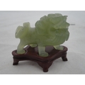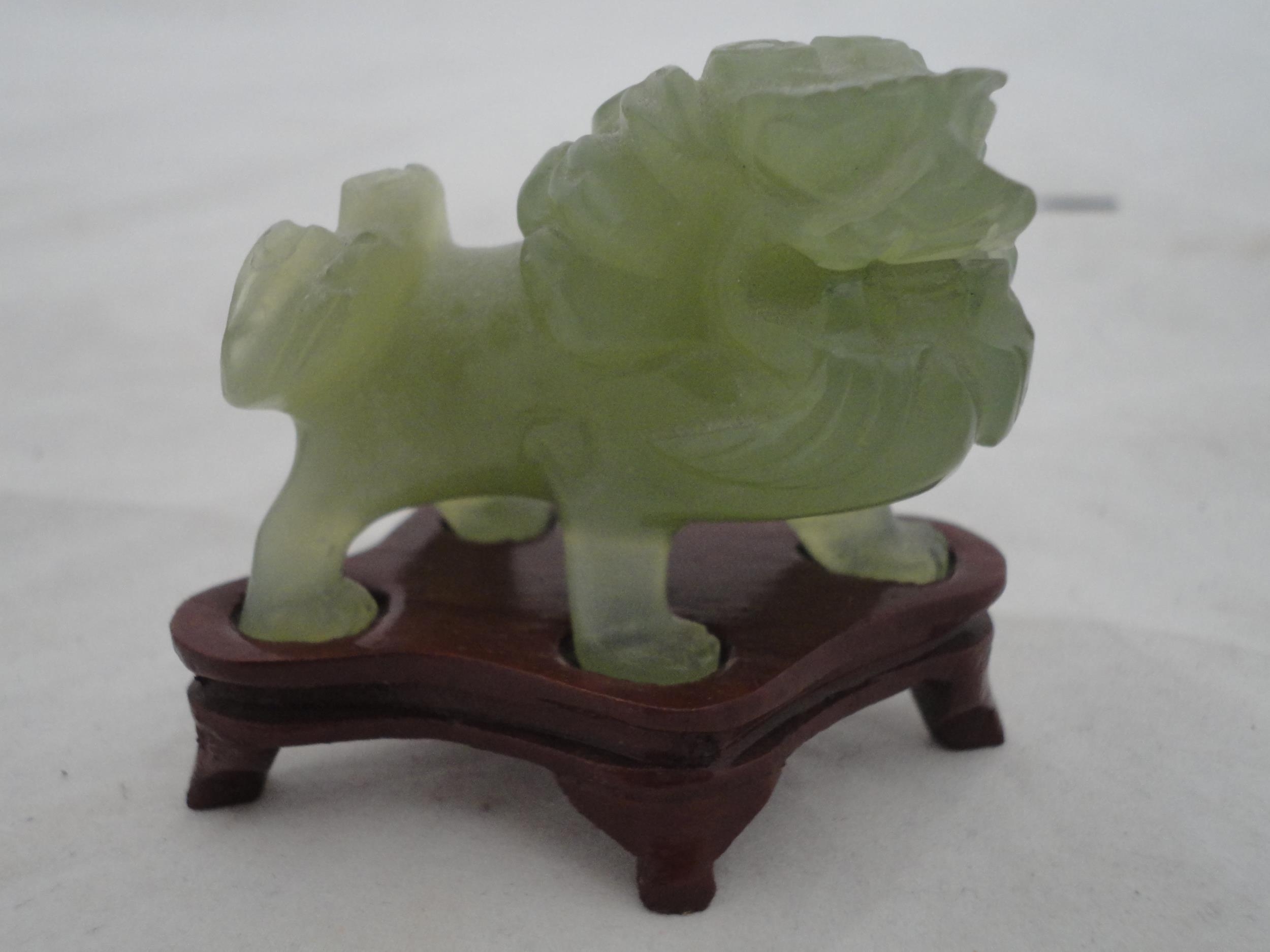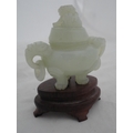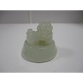 Small Chinese-style jade-coloured censer and cover on stand, and a similar jade-coloured temple dog. (2)