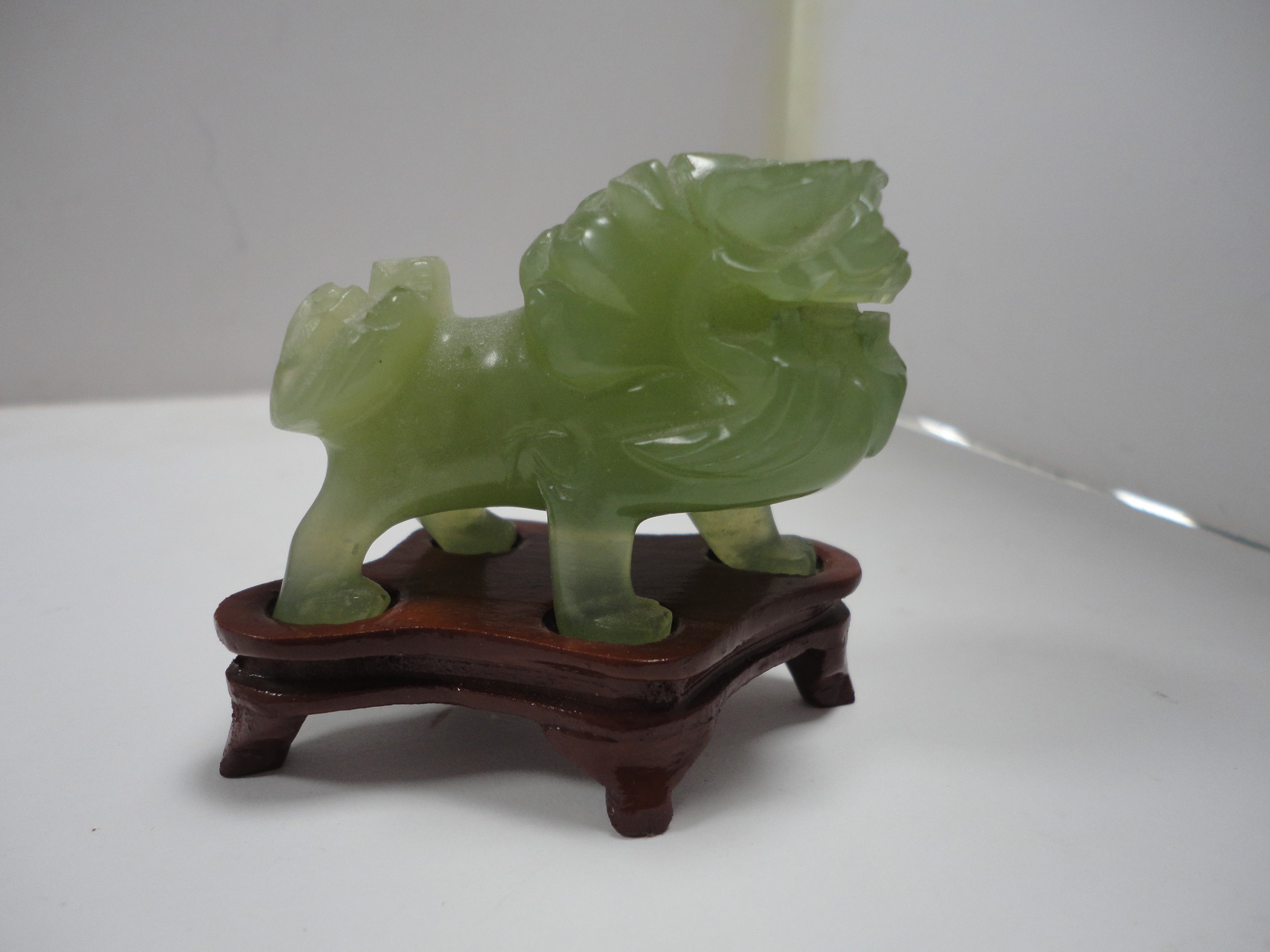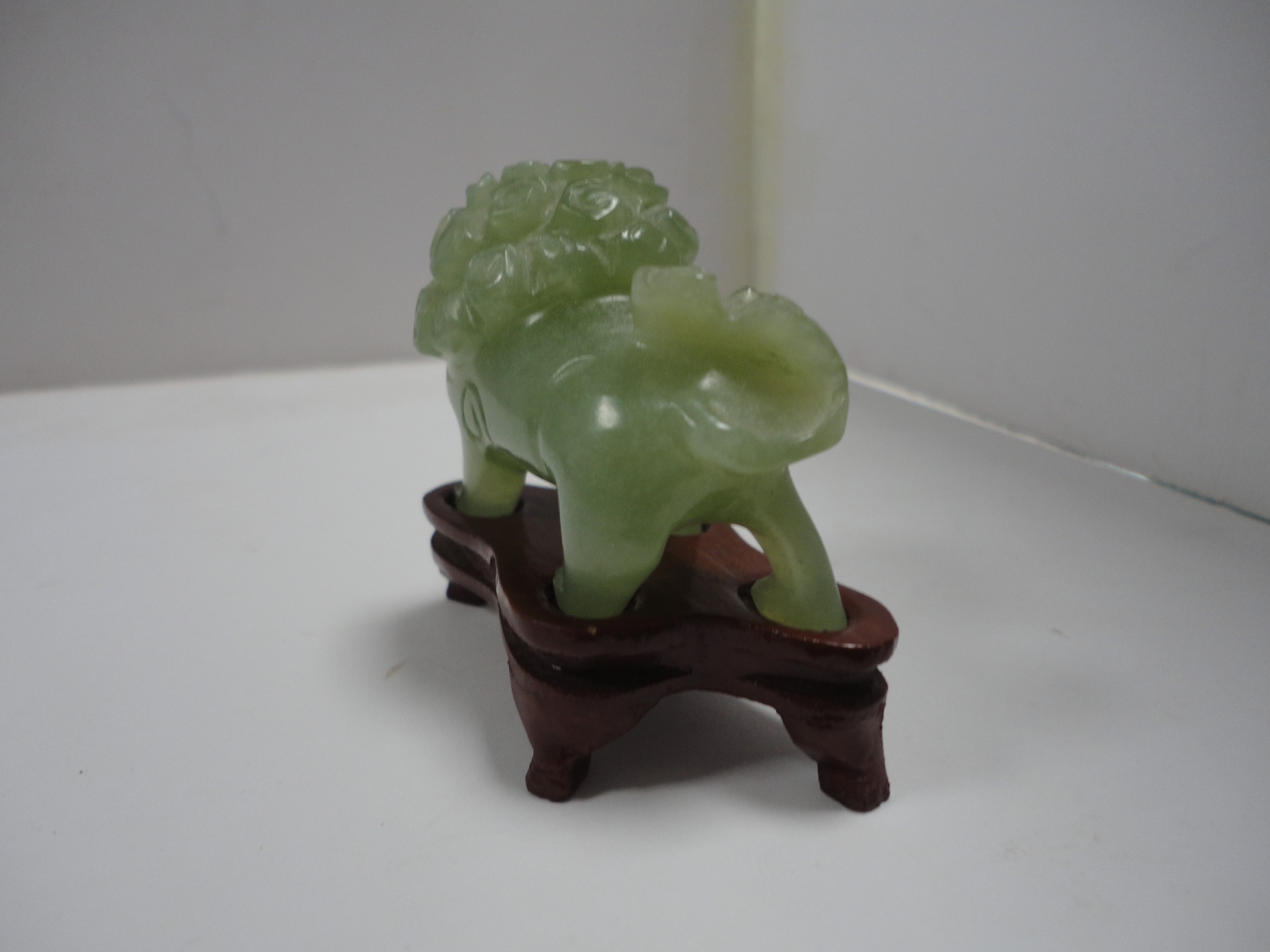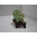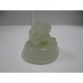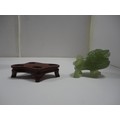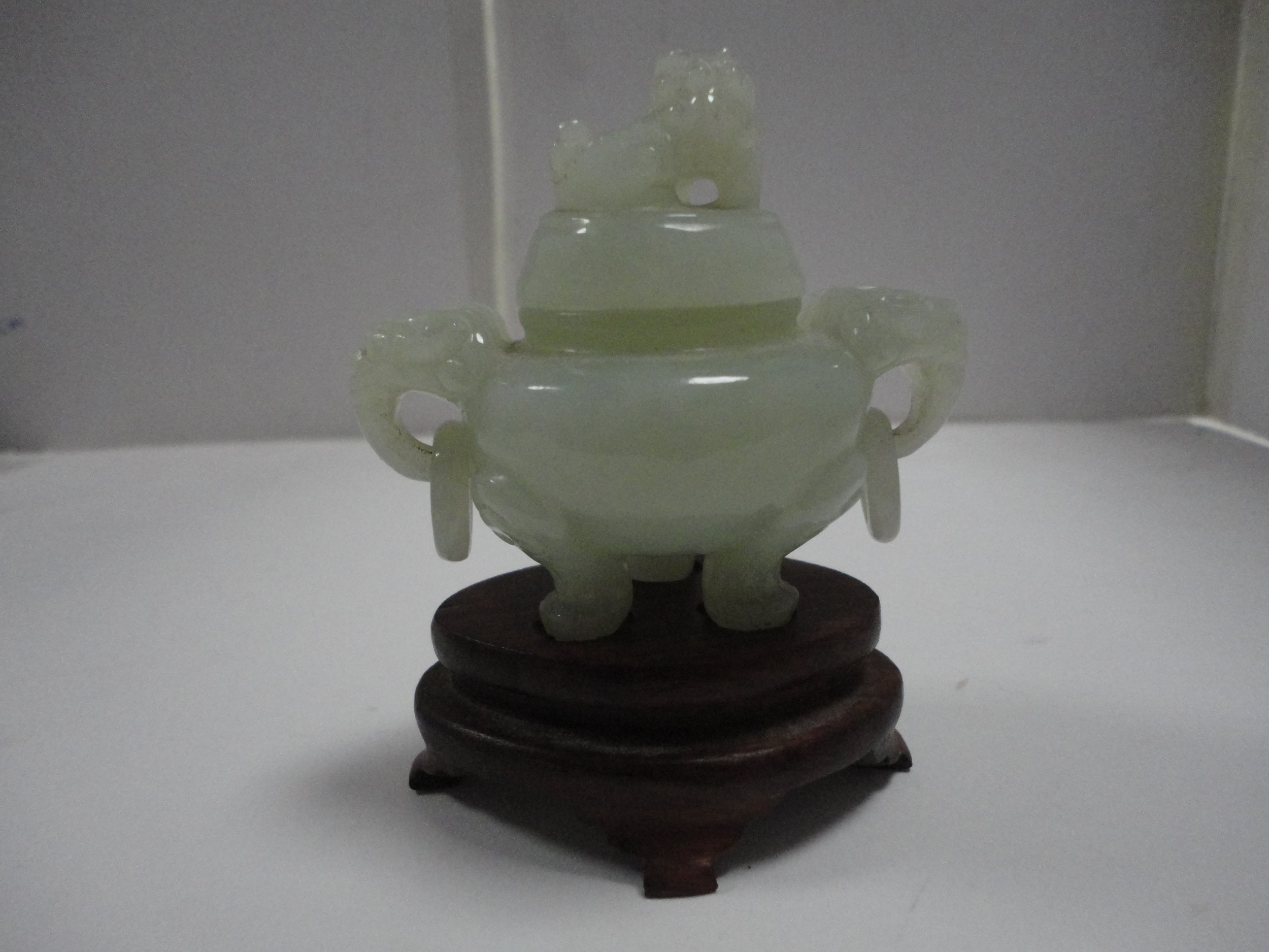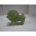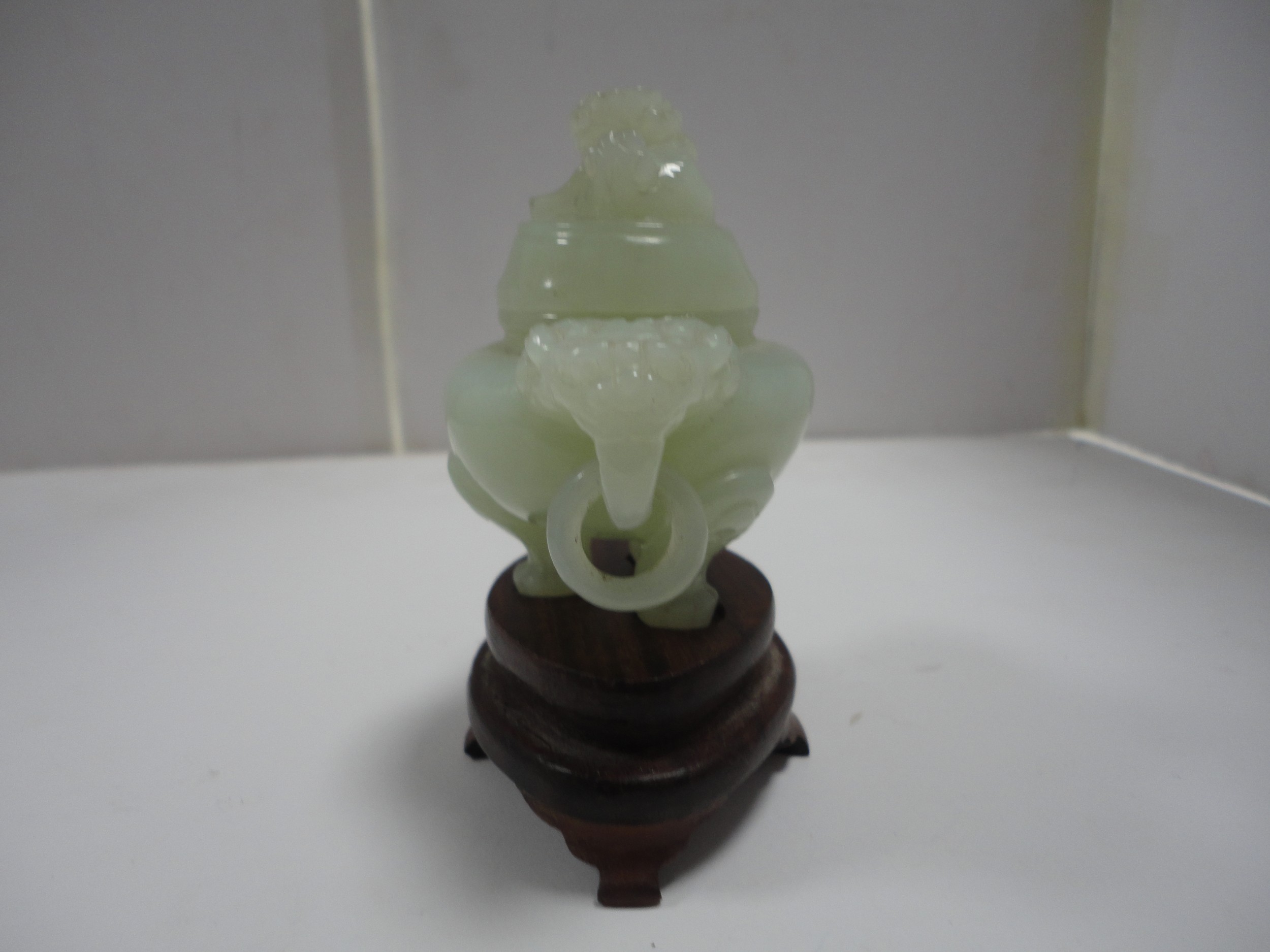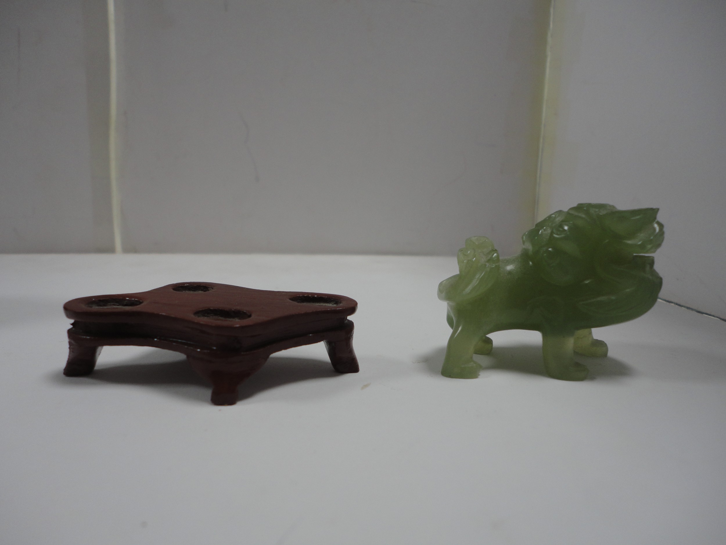 Small Chinese-style jade-coloured censer and cover on stand, and a similar jade-coloured temple dog. (2)