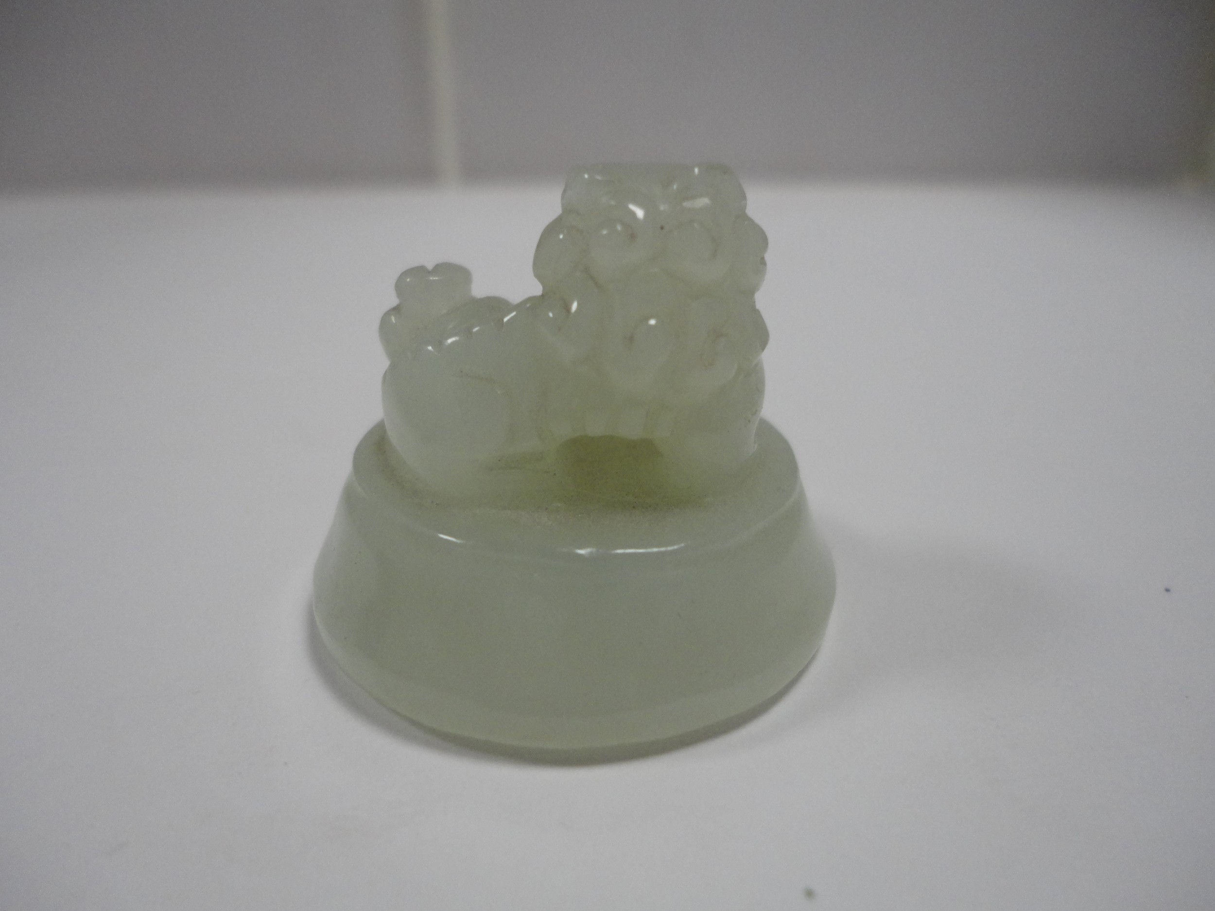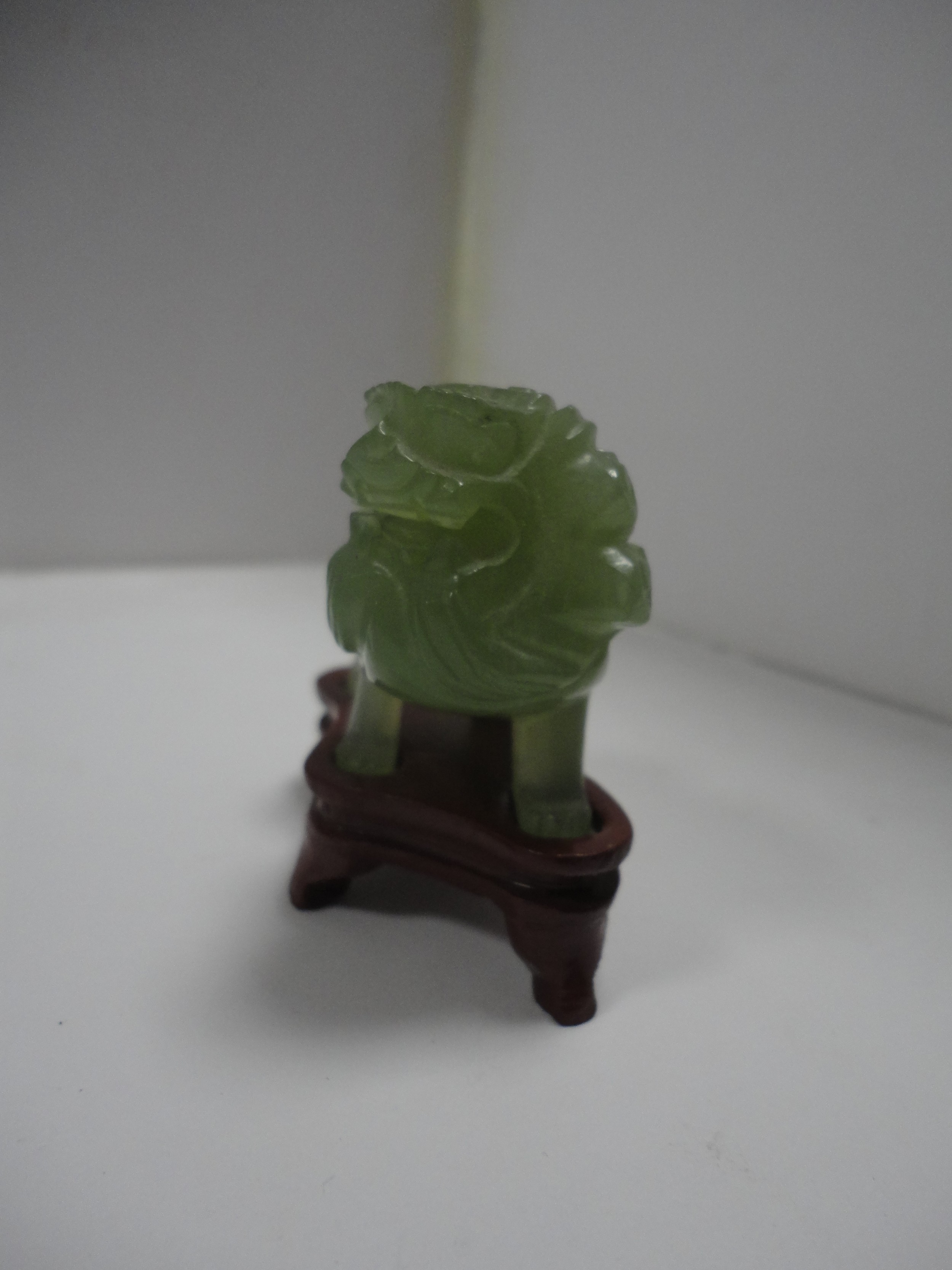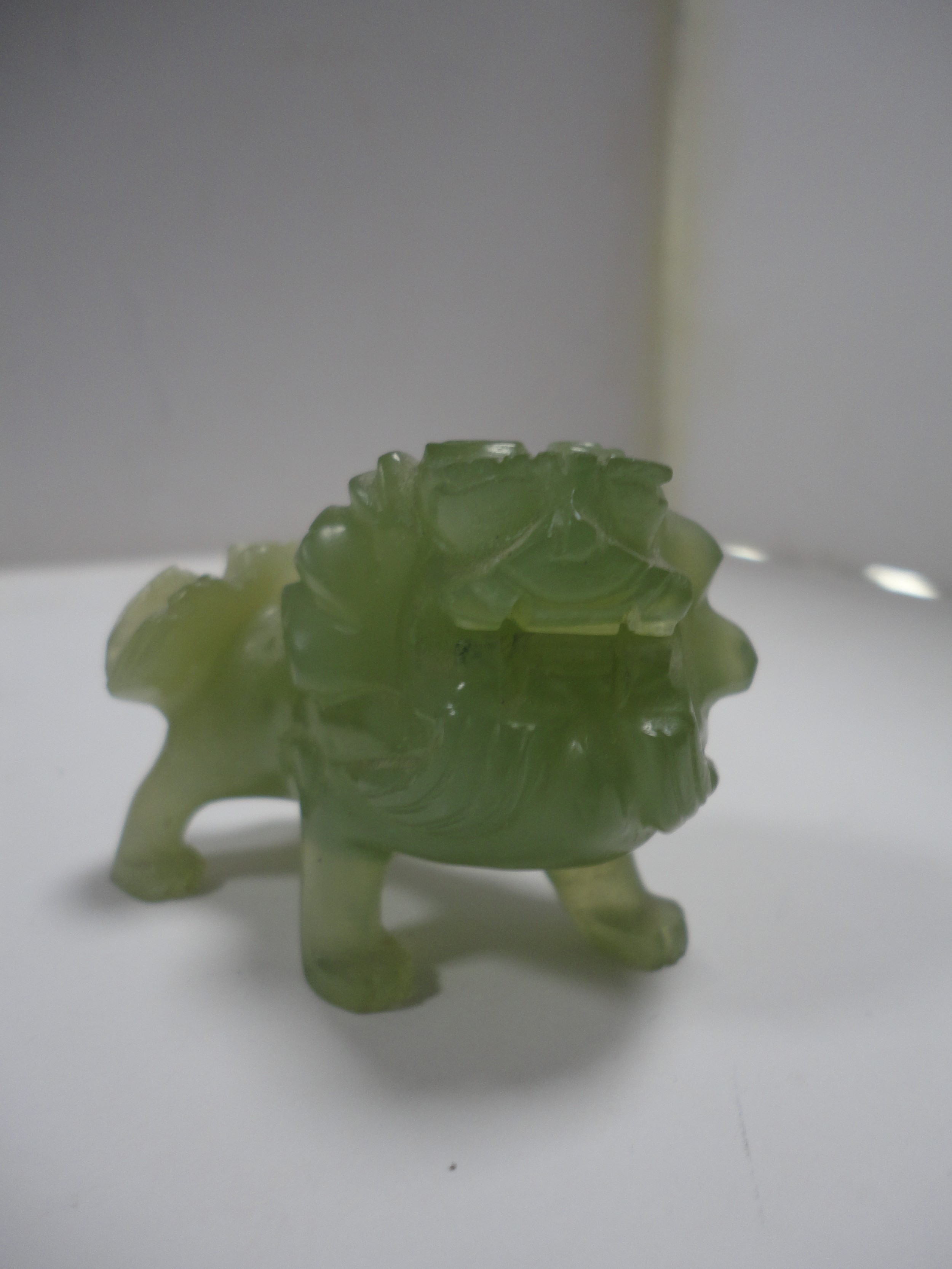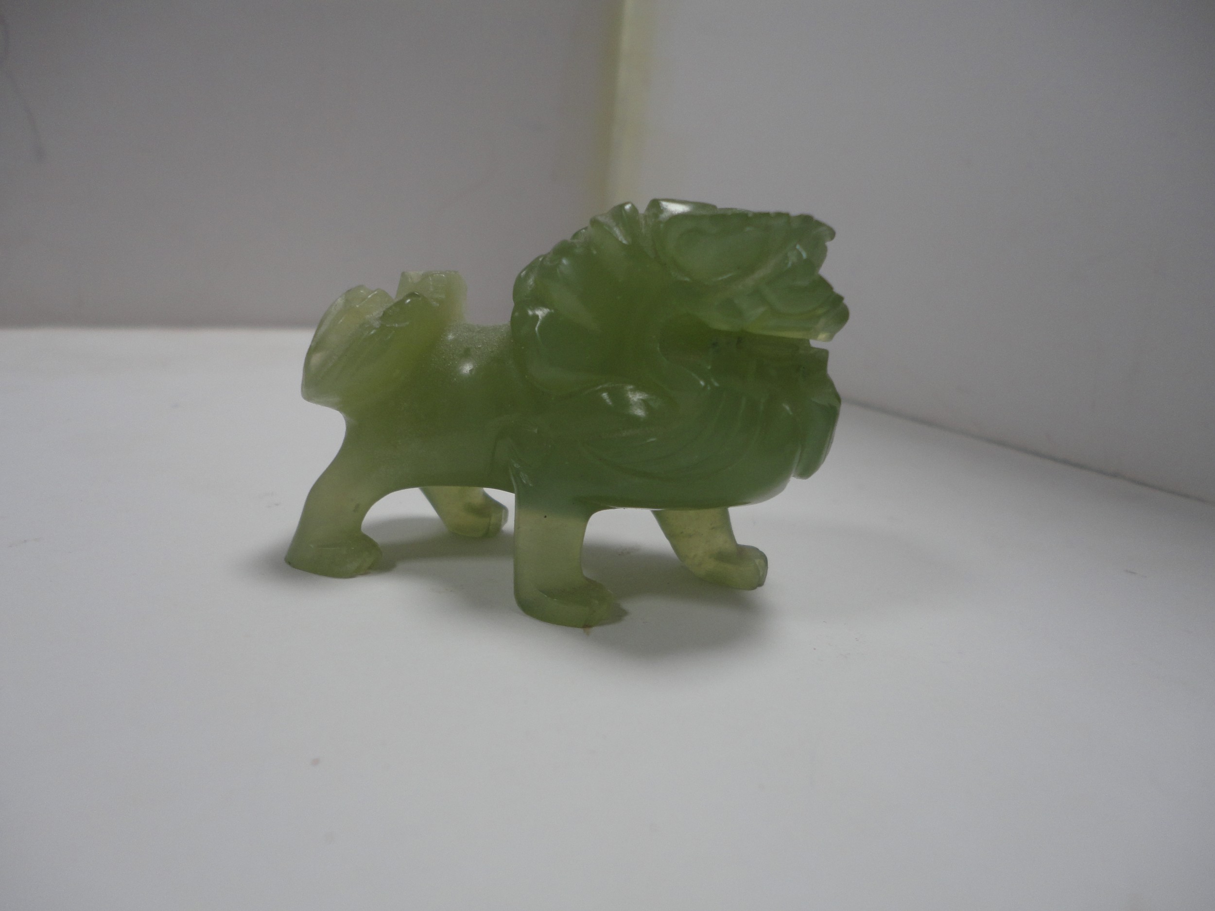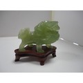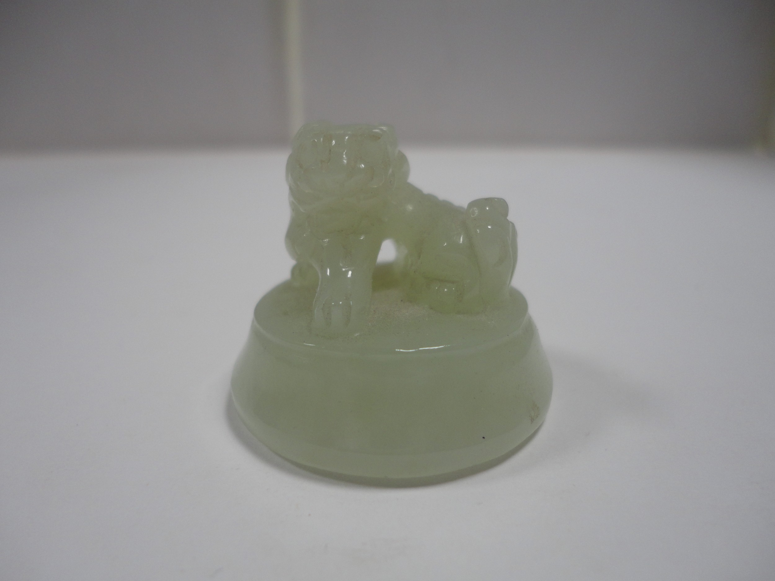 Small Chinese-style jade-coloured censer and cover on stand, and a similar jade-coloured temple dog. (2)